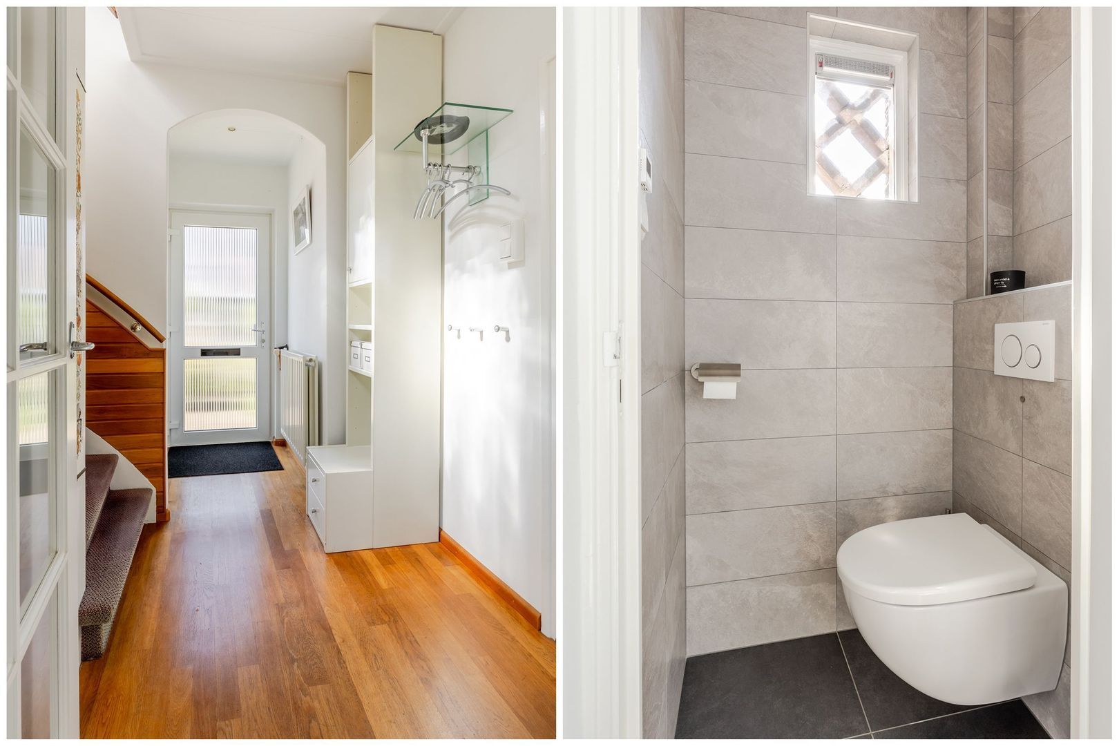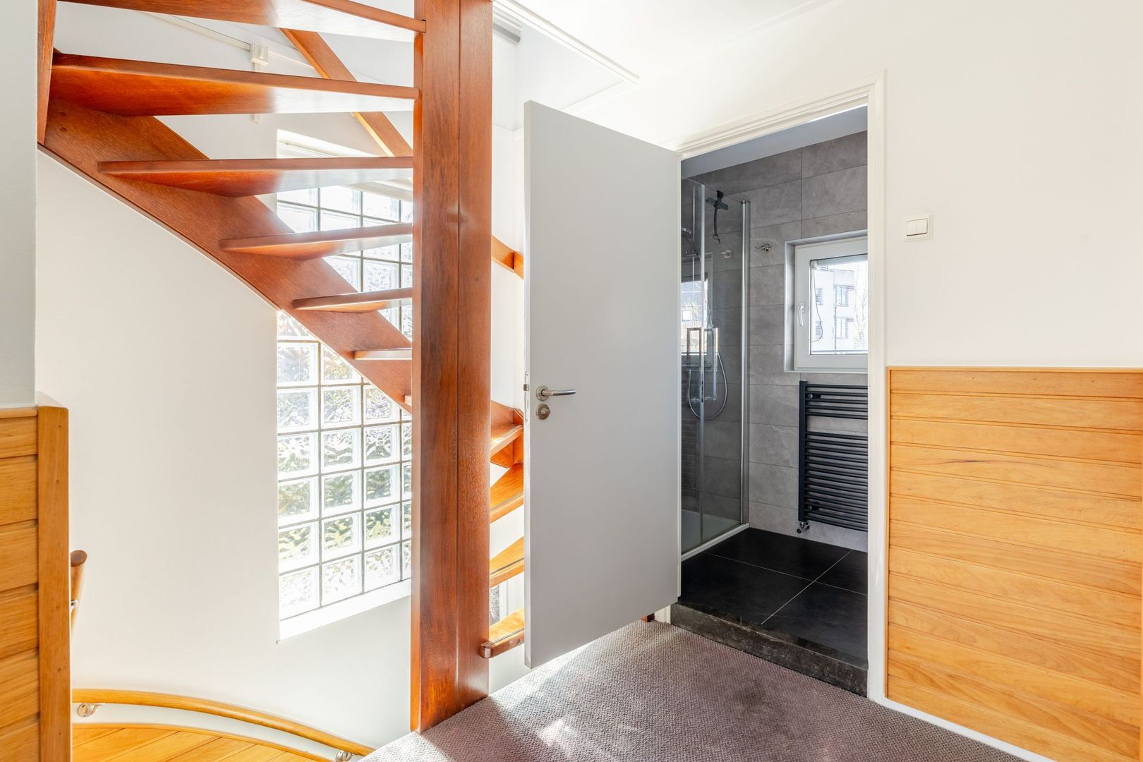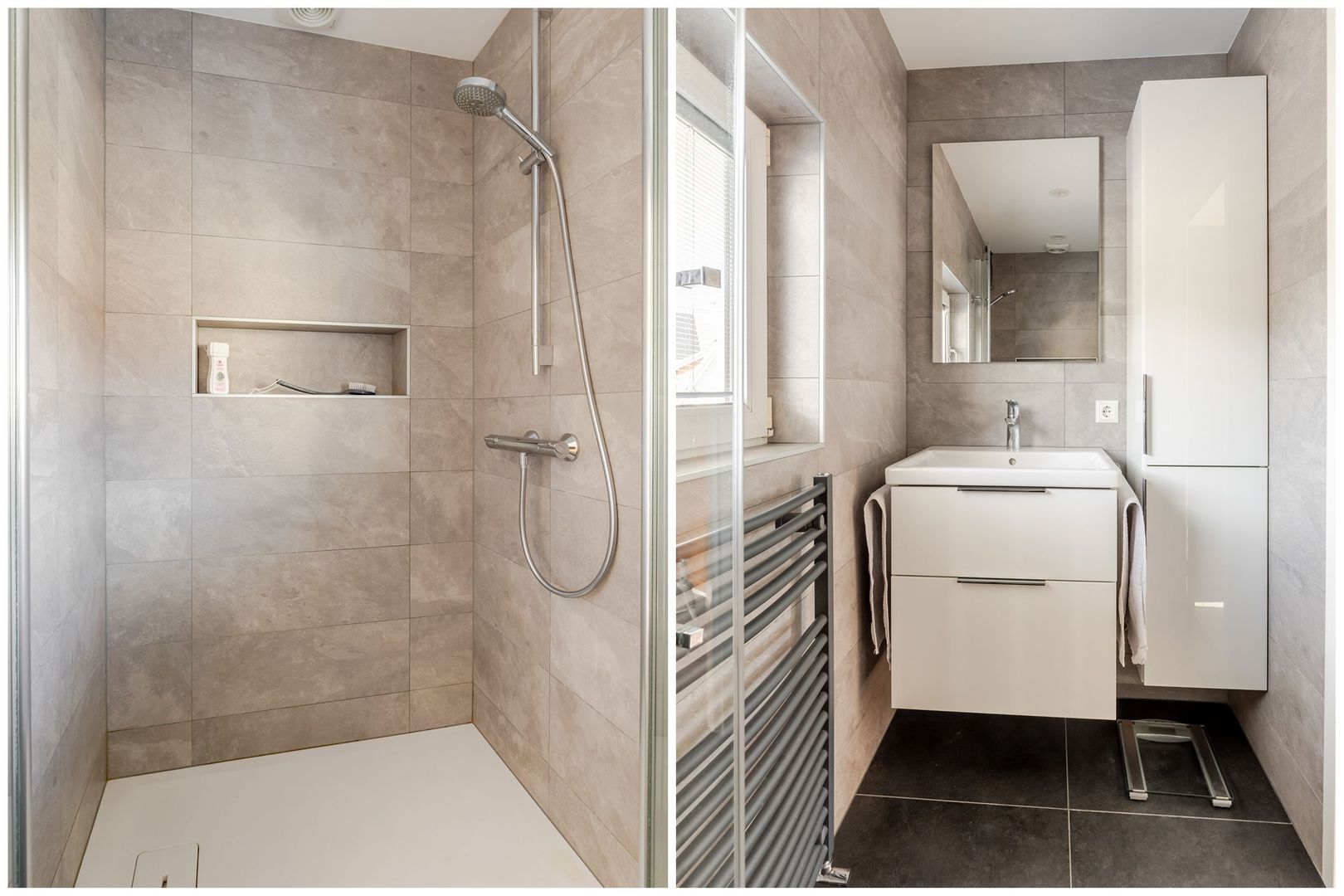 Op de eerste verdieping zijn drie slaapkamers en een mooie badkamer. Deze is weliswaar klein, maar biedt toch plaats aan een royale inloopdouche en een wastafelmeubel met wandkast. De muren zijn volledig betegeld met eigentijdse grote tegels, de vloer beschikt over elektrische vloerverwarming en het raam maakt ventileren met frisse buitenlucht mogelijk.