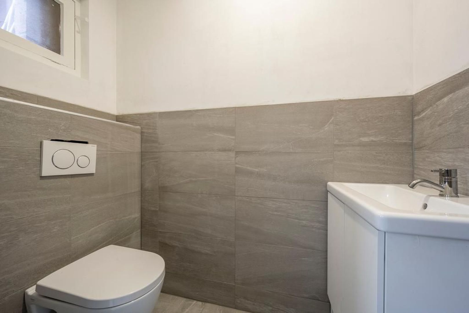 In de vernieuwde toiletruimte hangt een wandcloset met een wastafelmeubeltje.