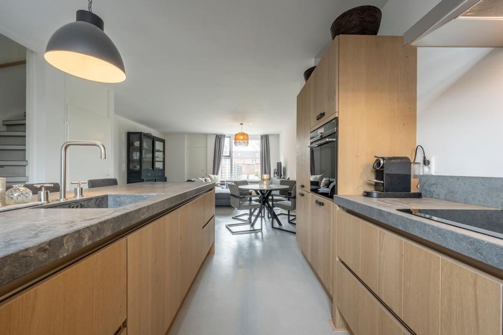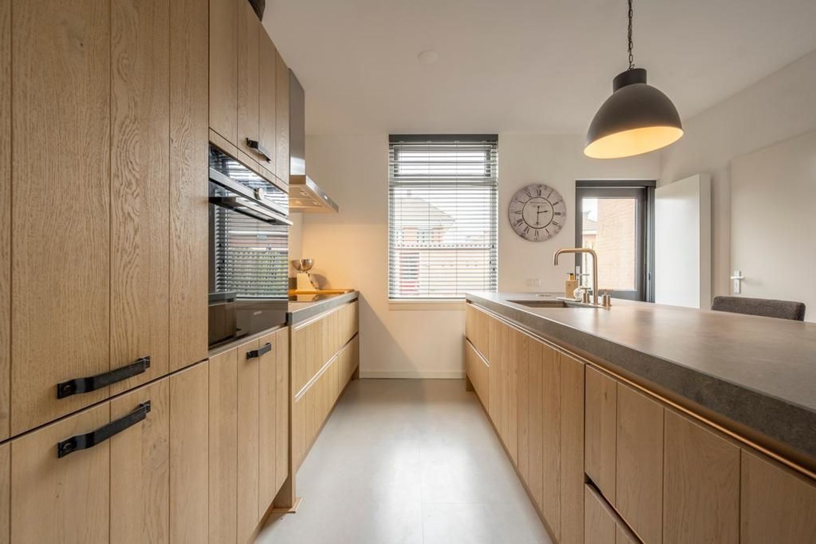 De moderne keukeninrichting bestaat uit een wandopstelling en een eiland met bargedeelte. Hierin zijn verwerkt een inductiekookplaat, afzuigkap, combi-stoomoven, koel-vriescombinatie en een vaatwasser.