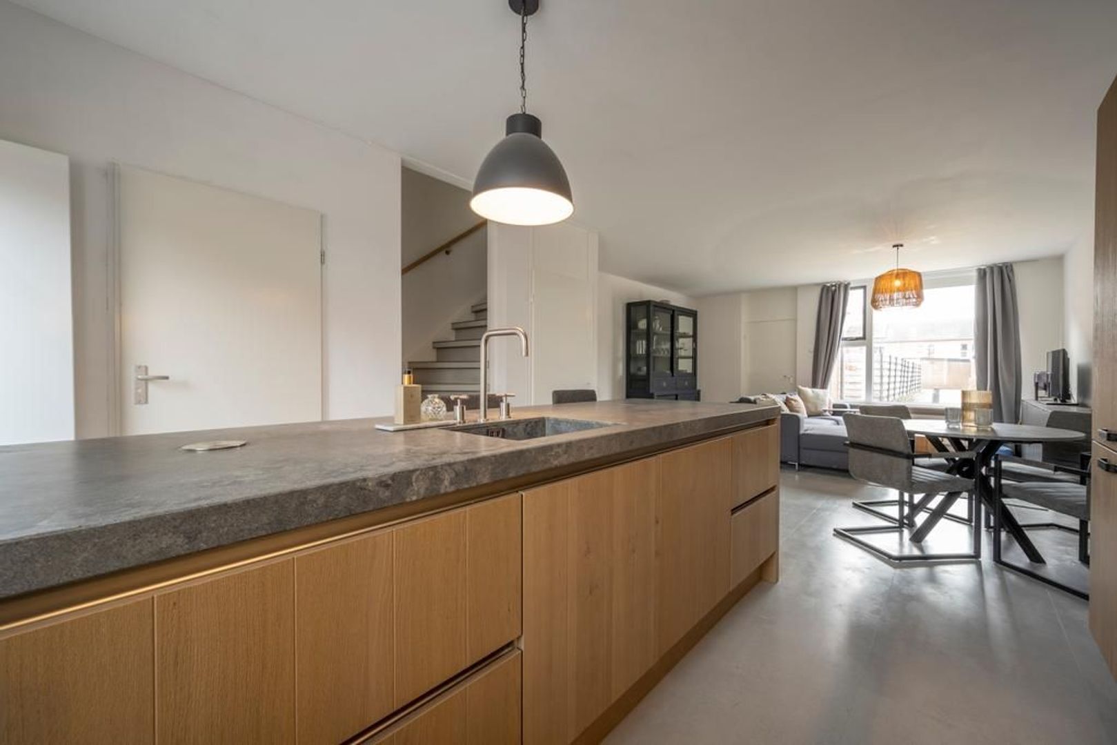 Ruime woonkamer met (inmiddels) open keuken. Voorheen was er een dichte keuken en een achterhal met de trapopgang. Nu is het één grote open leefruimte met een (gerenoveerde) halfopen trap.
