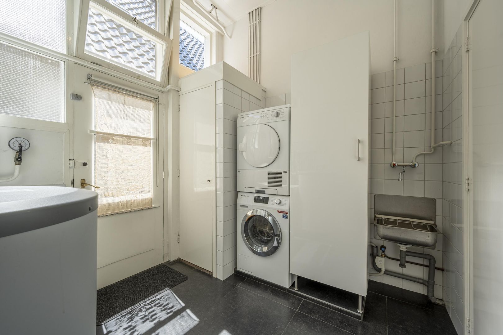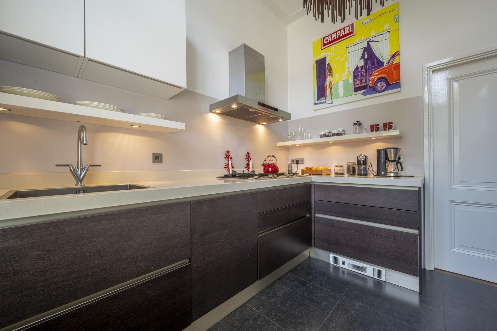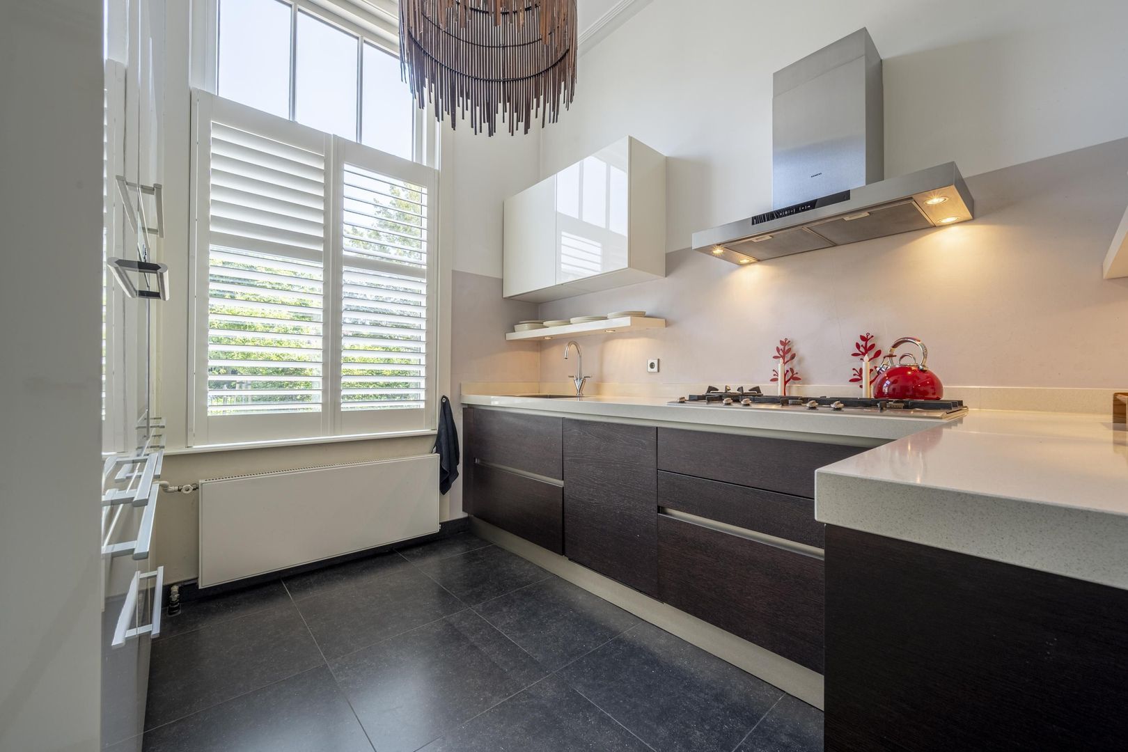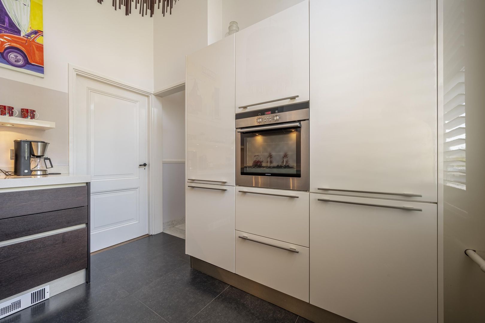 De keuken ligt aan de straatkant. Deze is voorzien van een uitgebreide moderne inrichting met inbouwapparatuur en een fraaie tegelvloer. De keuken geeft toegang tot een praktische, ruime bijkeuken. Deze heeft ook een deur naar buiten en tevens de deur naar een handige kelder. Deze heeft een hoogte van circa 1.66 m, dus is bijzonder goed bruikbaar.