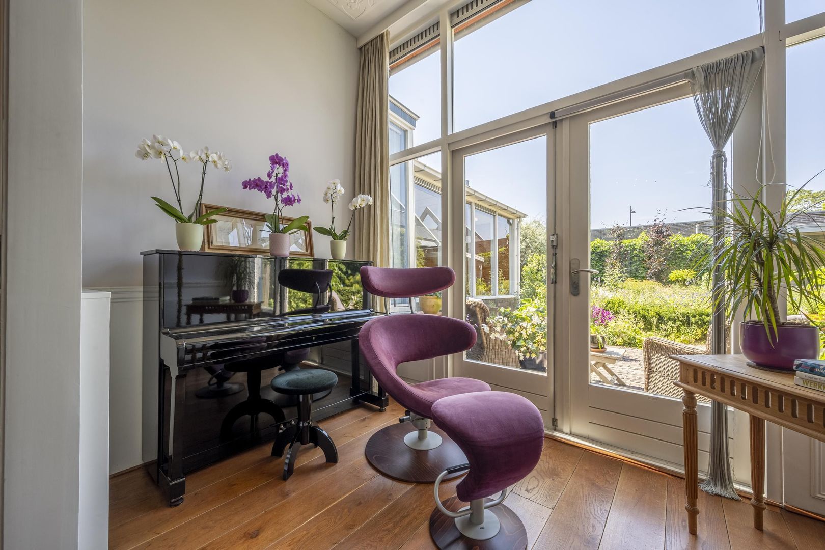 De ruime woonkamer heeft een prachtig hoog en bewerkt plafond, een houten vloer, een schouw met houtkachel en een tuinkamer/serre met openslaande deuren. Dit zorgt voor een prettige lichtinval en een makkelijke toegang tot de tuin.