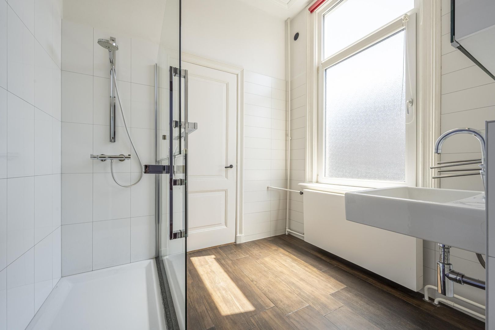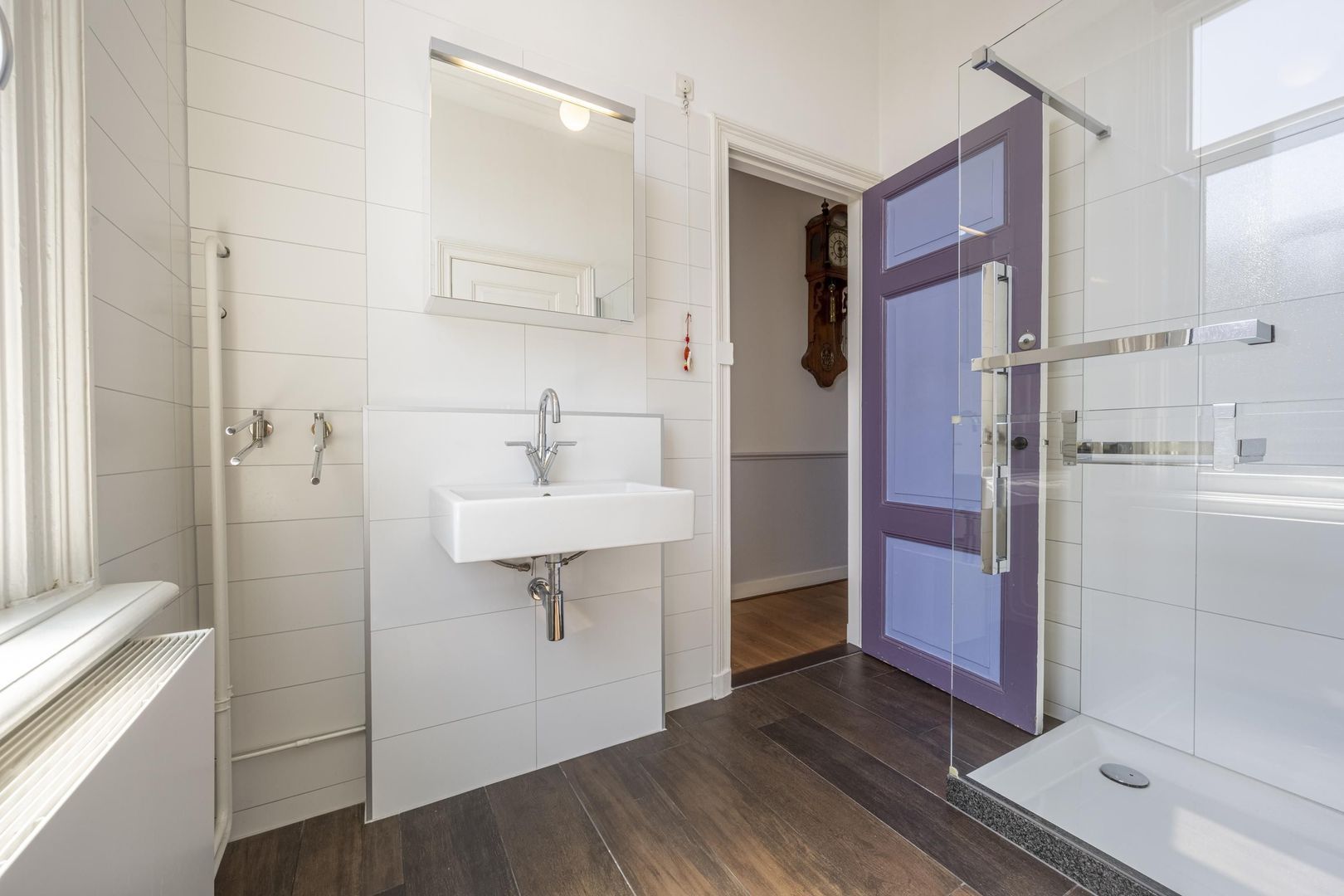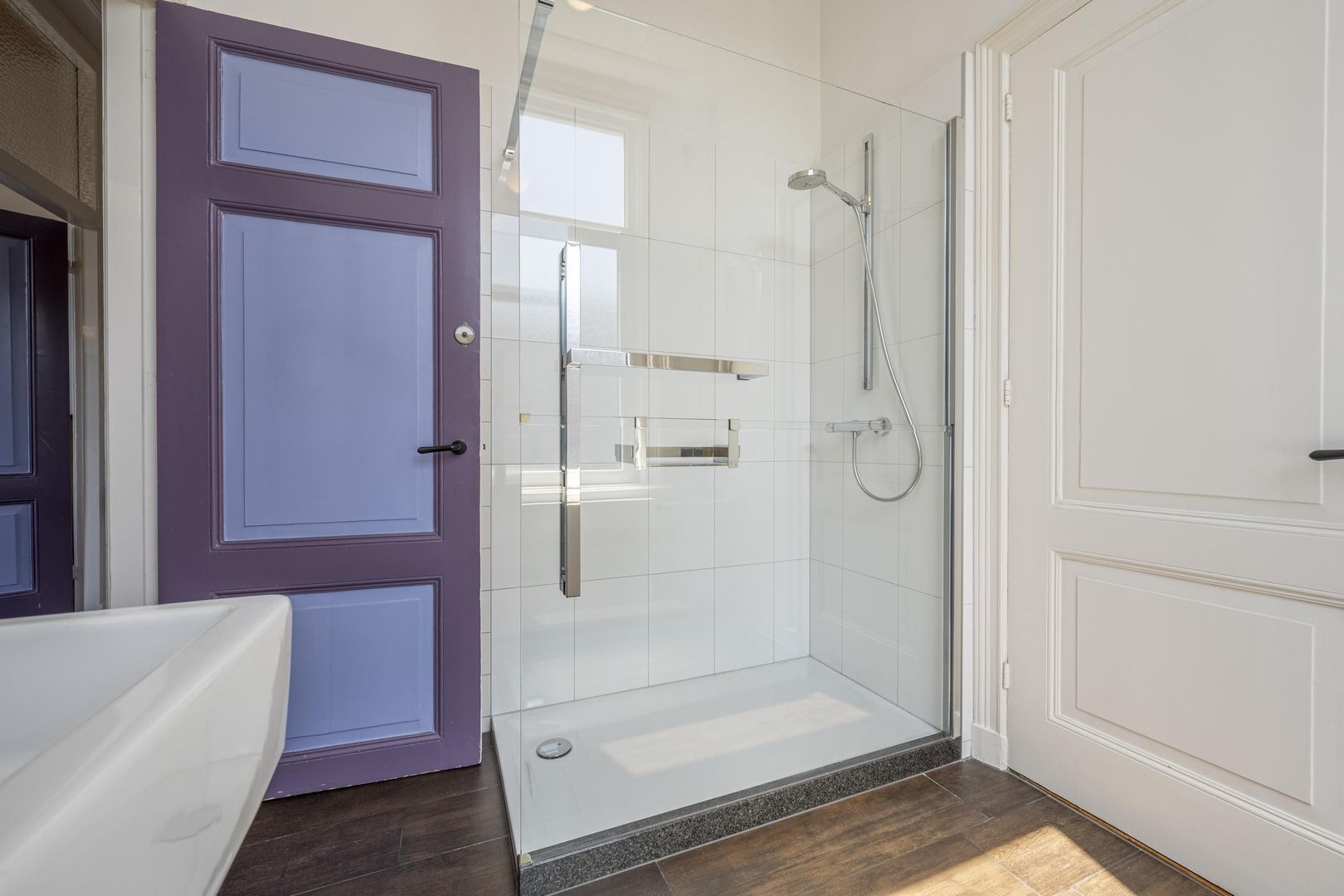 De badkamer is royaal en ingericht met een inloopdouche, een wastafel en een praktische vaste kast.