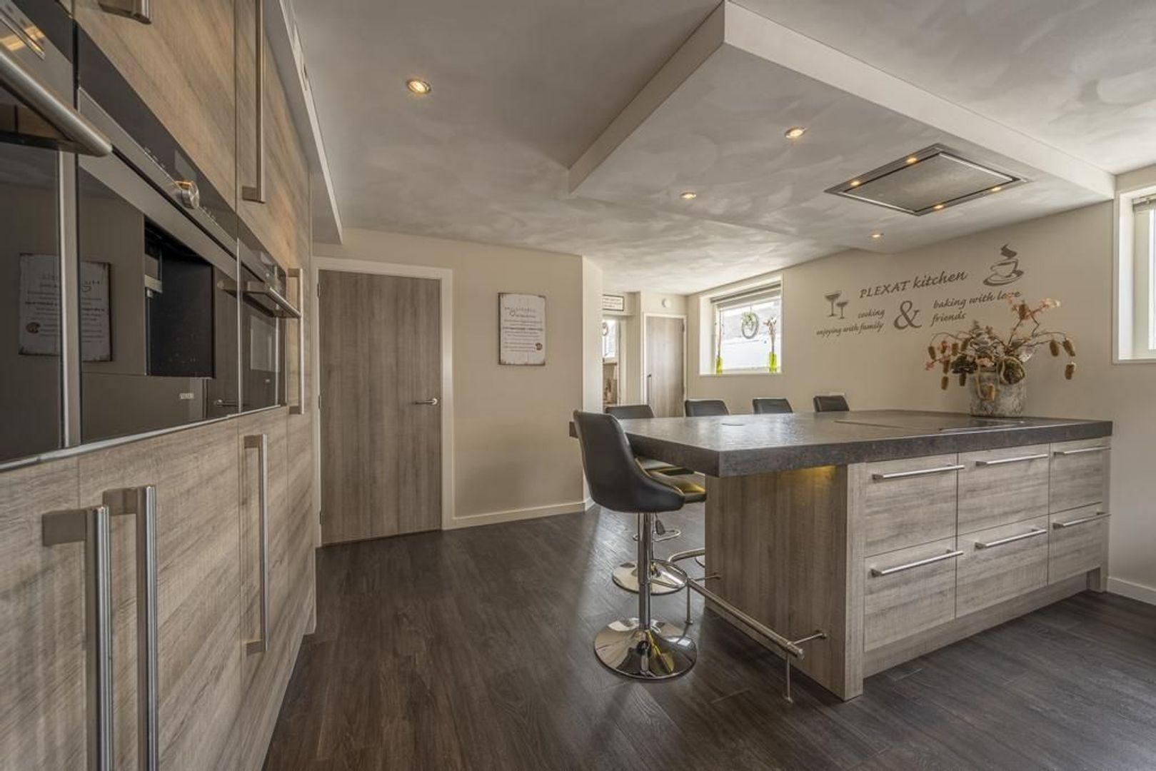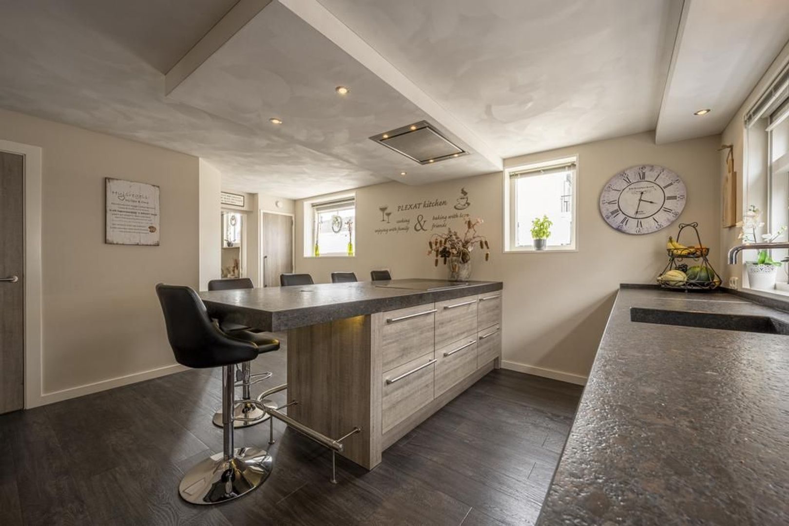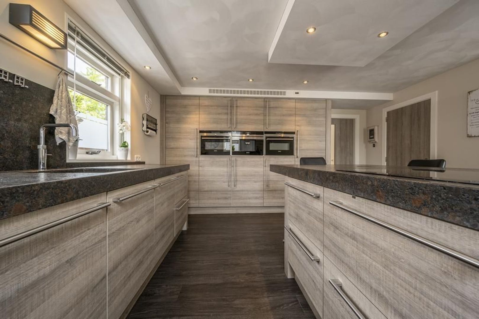 Ruime woonkeuken met moderne, uitgebreide inrichting met eiland/bargedeelte, luxe granieten aanrechtblad en complete inbouwapparatuur. Deze bestaat onder andere uit een koffiemachine, twee combi-magnetrons, gecombineerde kookplaat, vaatwasser, afzuigkap, koelkast en Quooker.