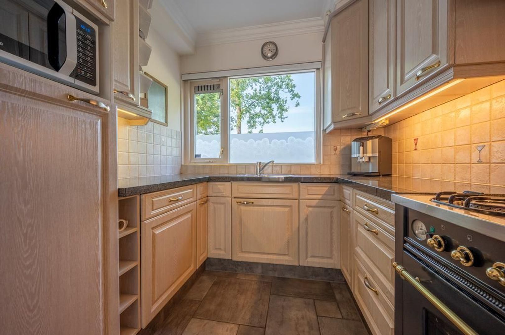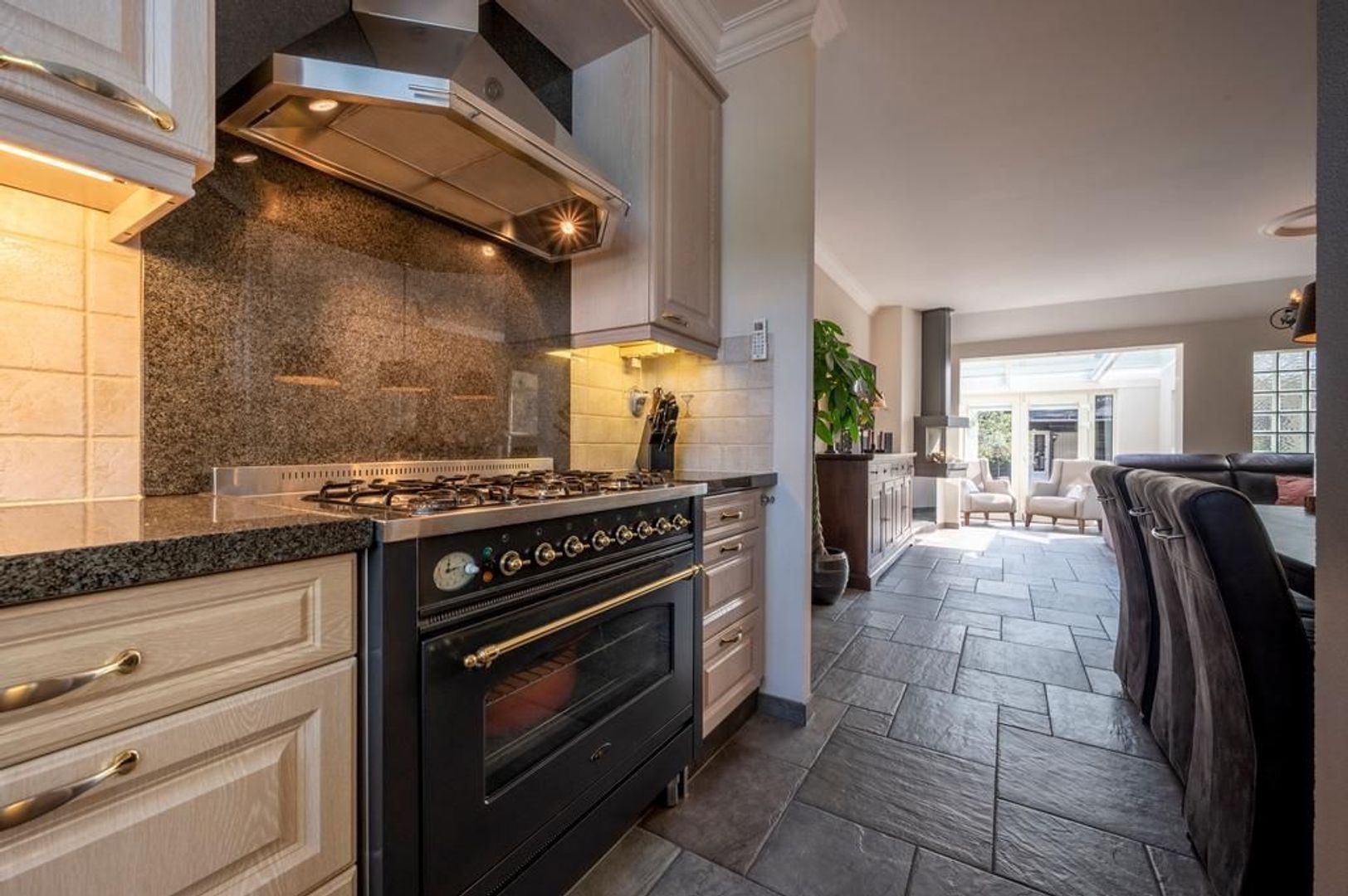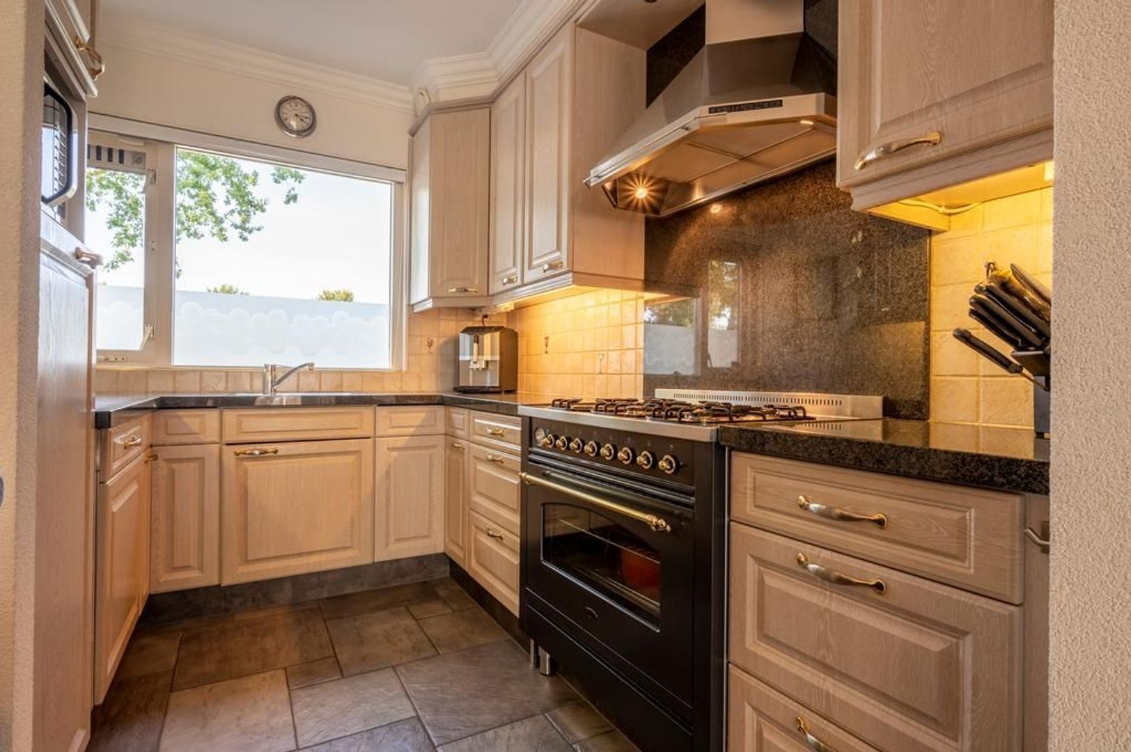 Deze is uitgevoerd met een natuurstenen aanrechtblad, een koelkast, afzuigkap, vaatwasser, zespits Boretti gasfornuis met oven en losse magnetron.
