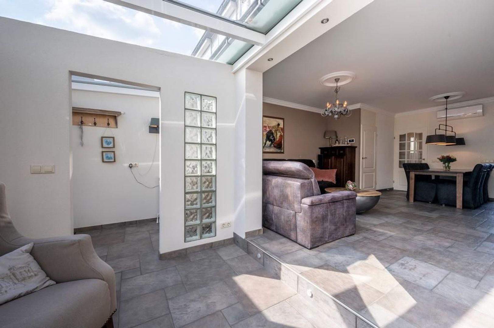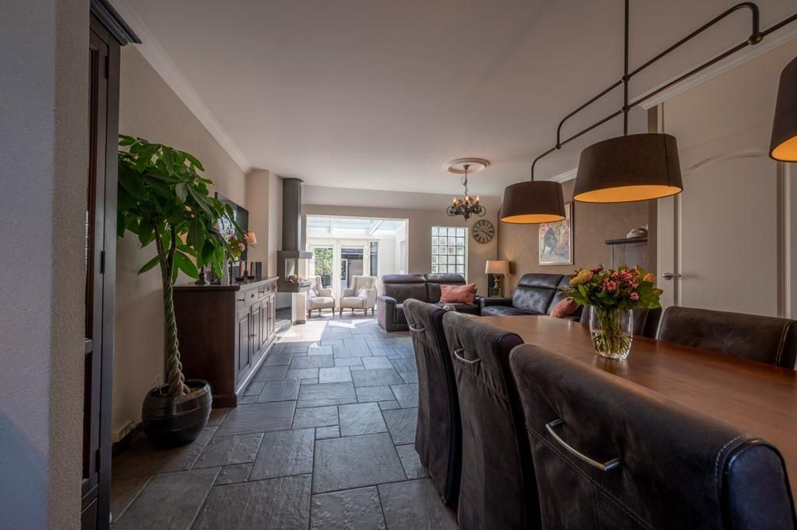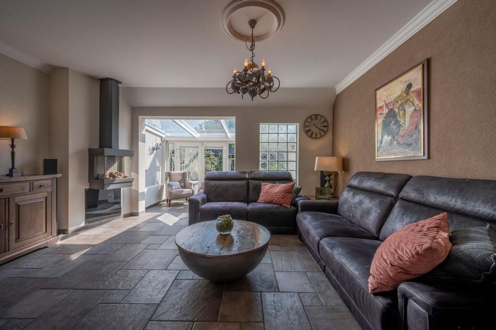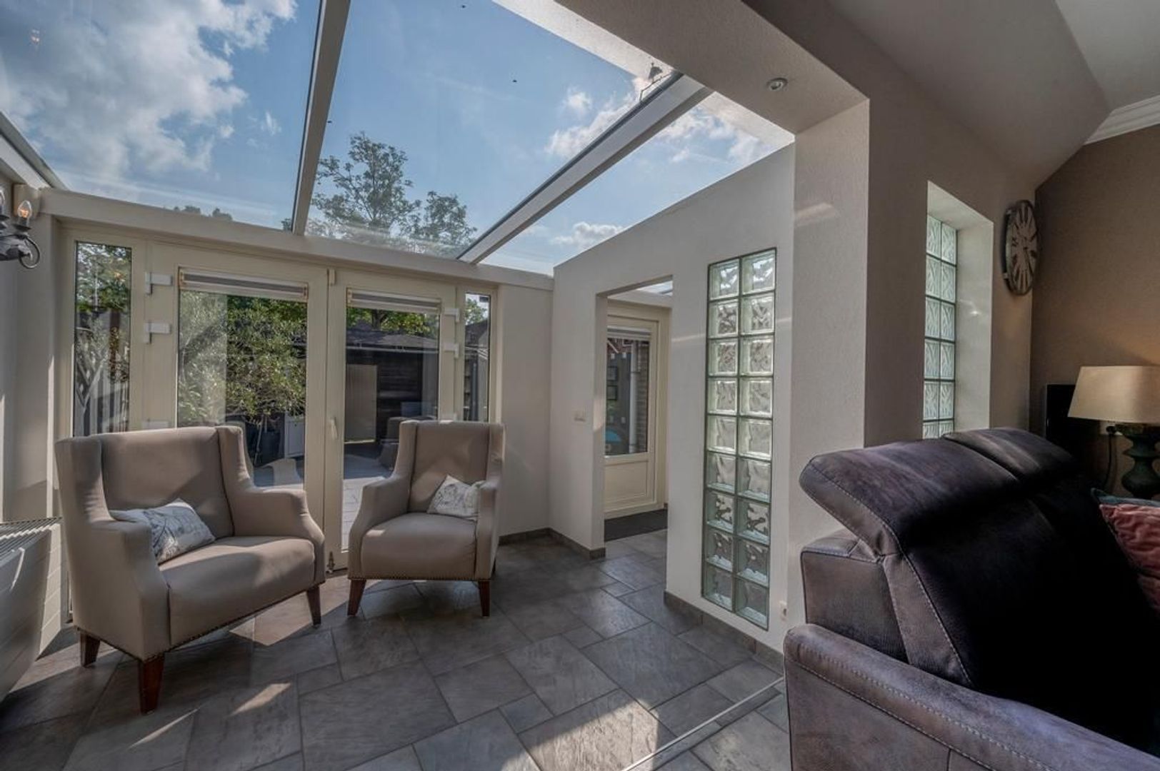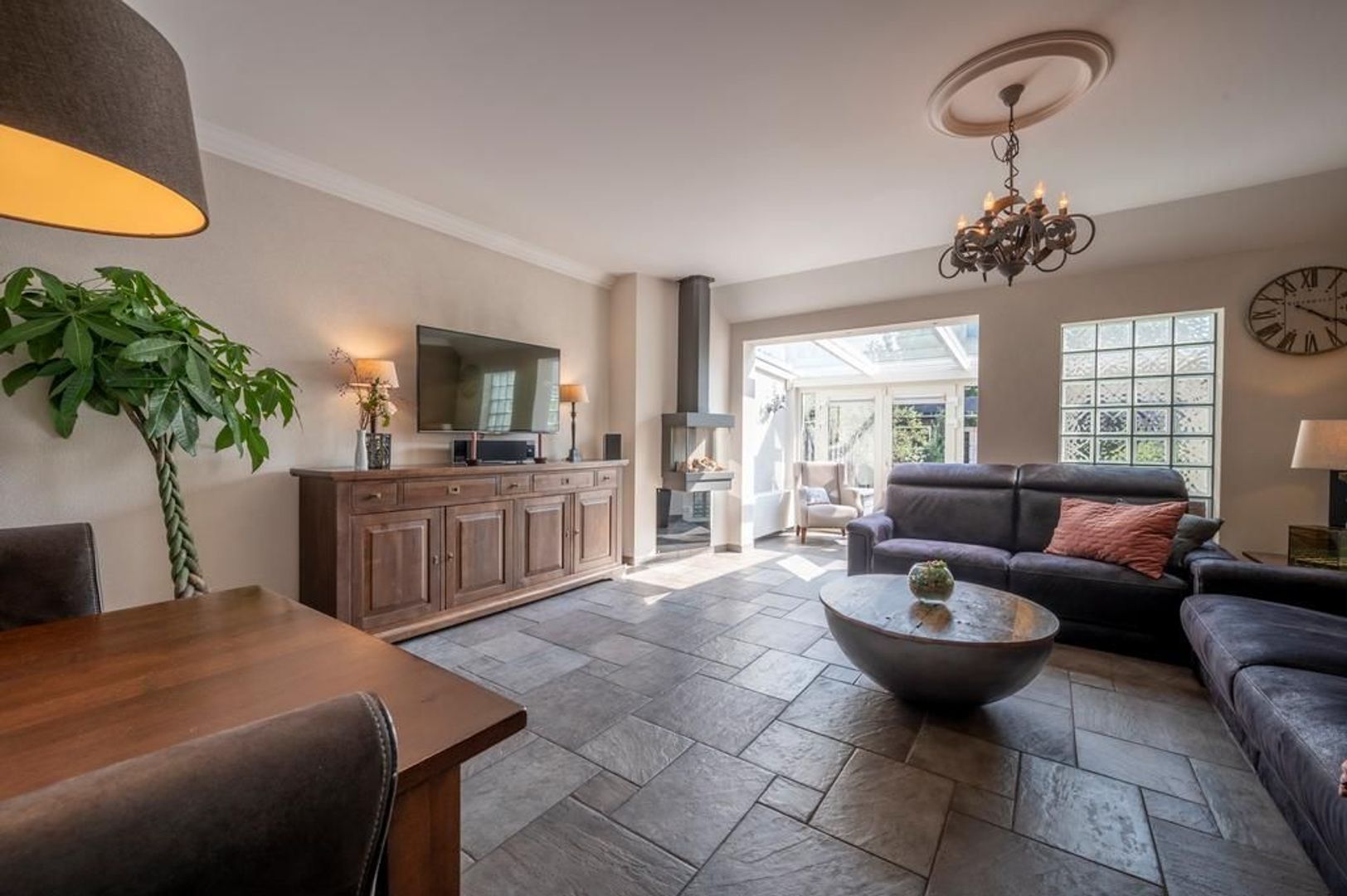 Woonkamer met sfeervolle gashaard en serre aan de tuinzijde.