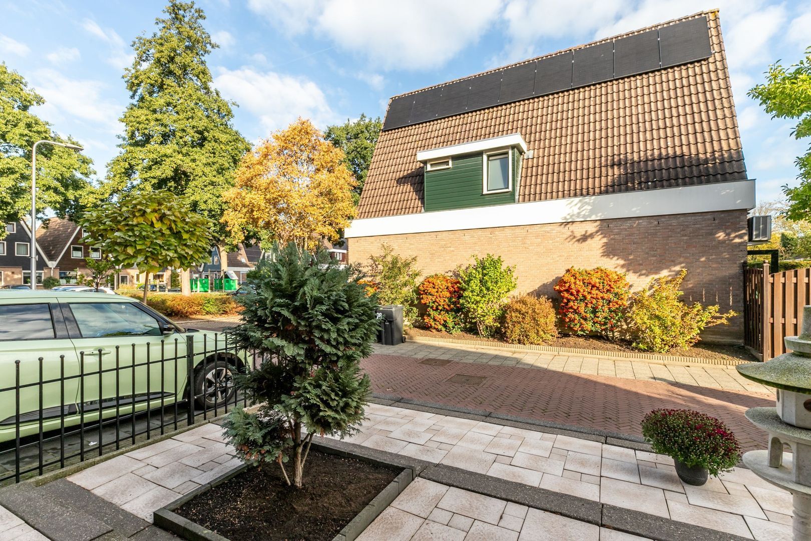 De ruime voortuin is onderhoudsvriendelijk en strak aangelegd.