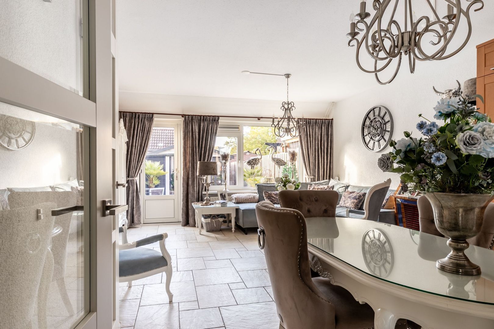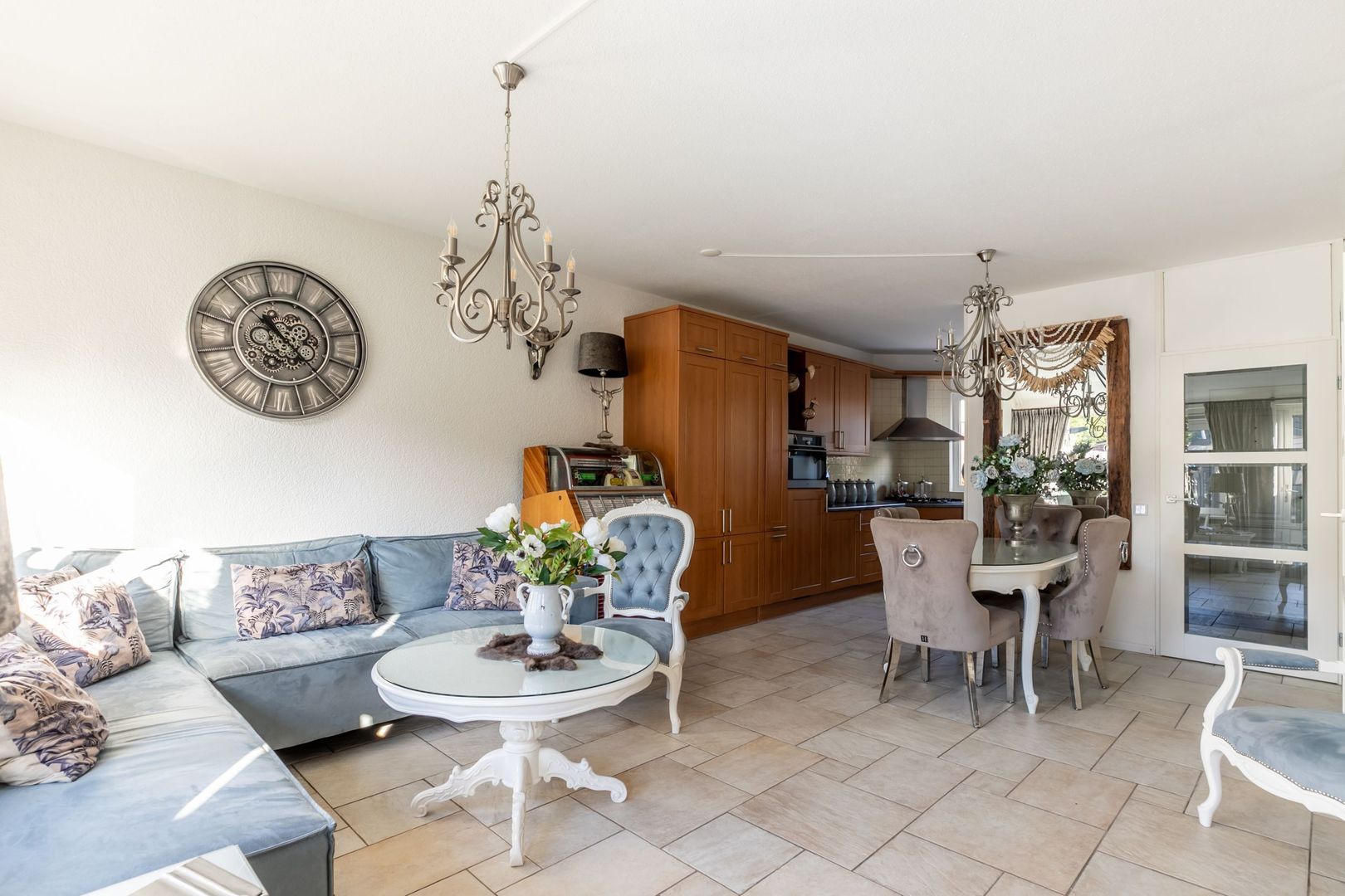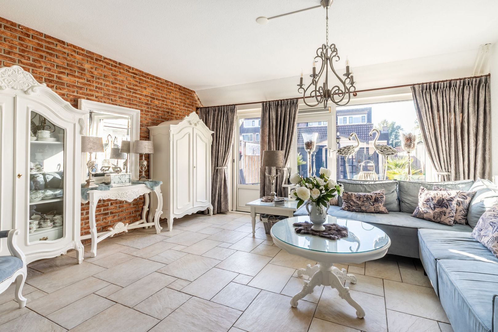 De woonkamer ligt aan de tuinkant. Het grote raam zorgt voor een prettige lichtinval.
