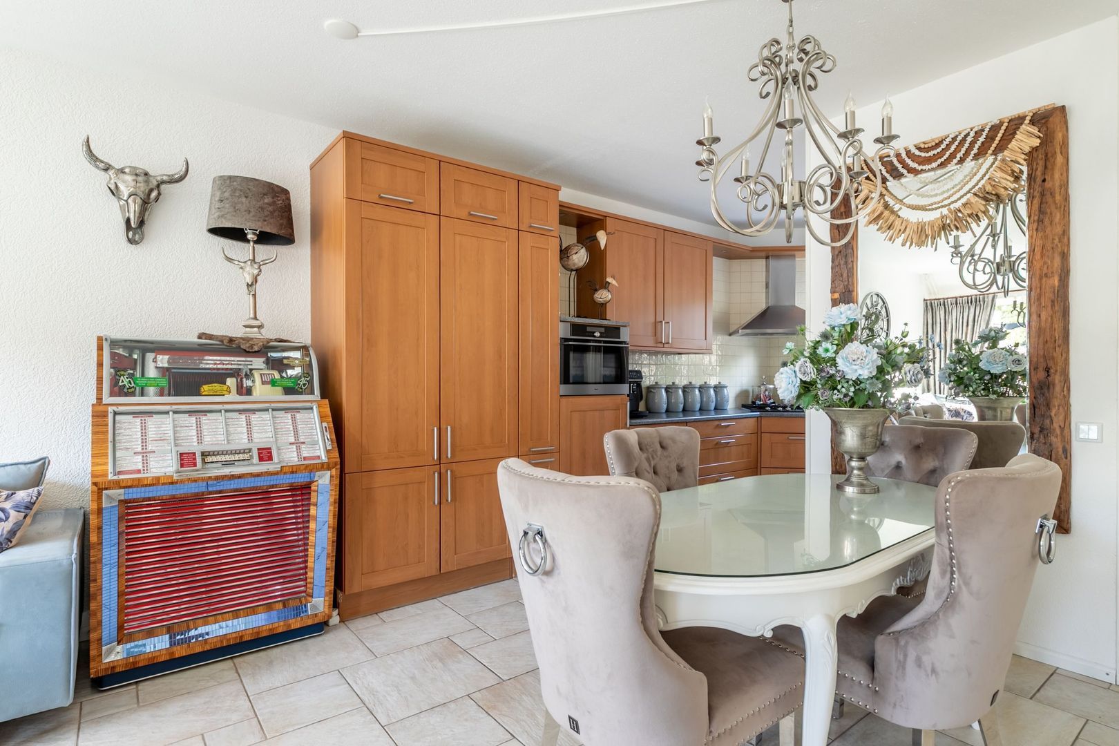 De open keuken heeft een L-vormige inrichting en is uitgevoerd met inbouwapparatuur (grotendeels vernieuwd).