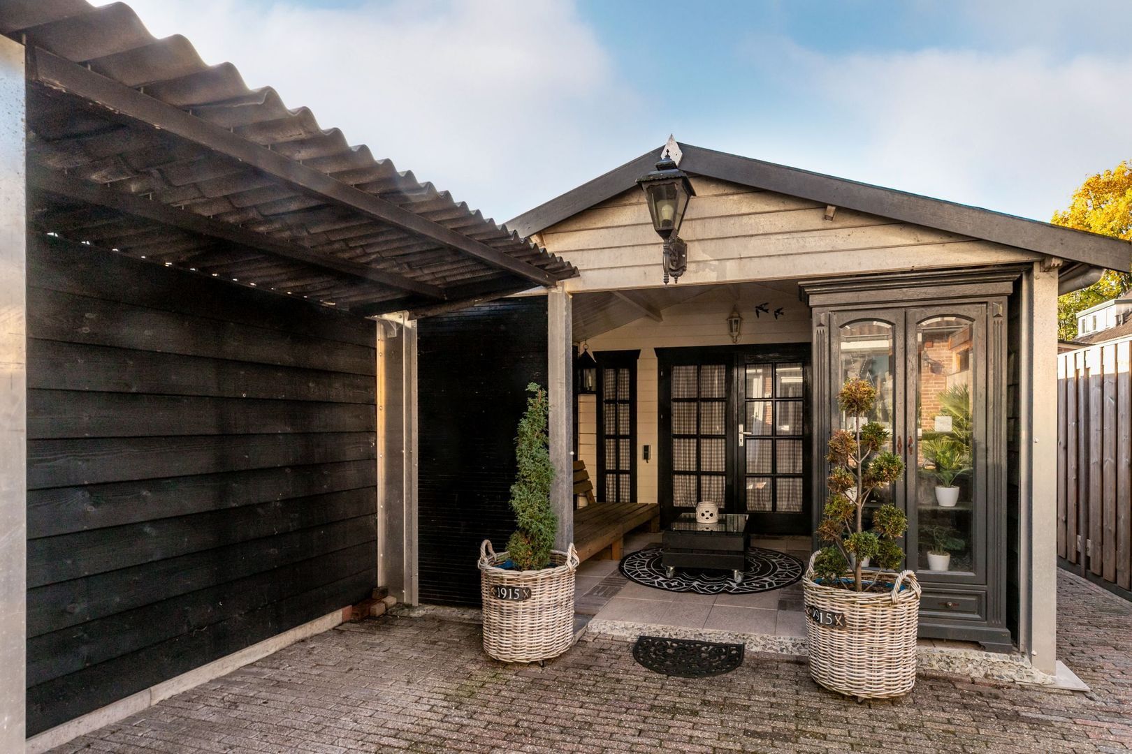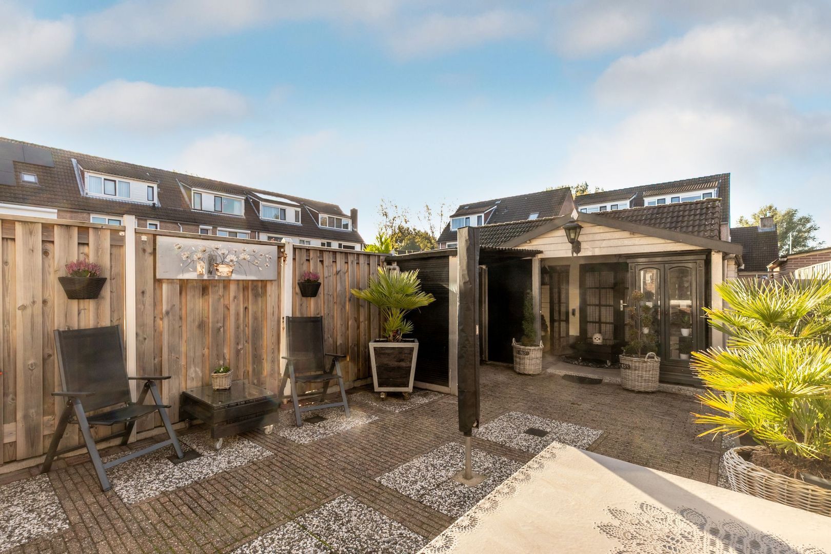 De achtertuin ligt op de zonkant. Hierin staat een houten berging met overkapping.