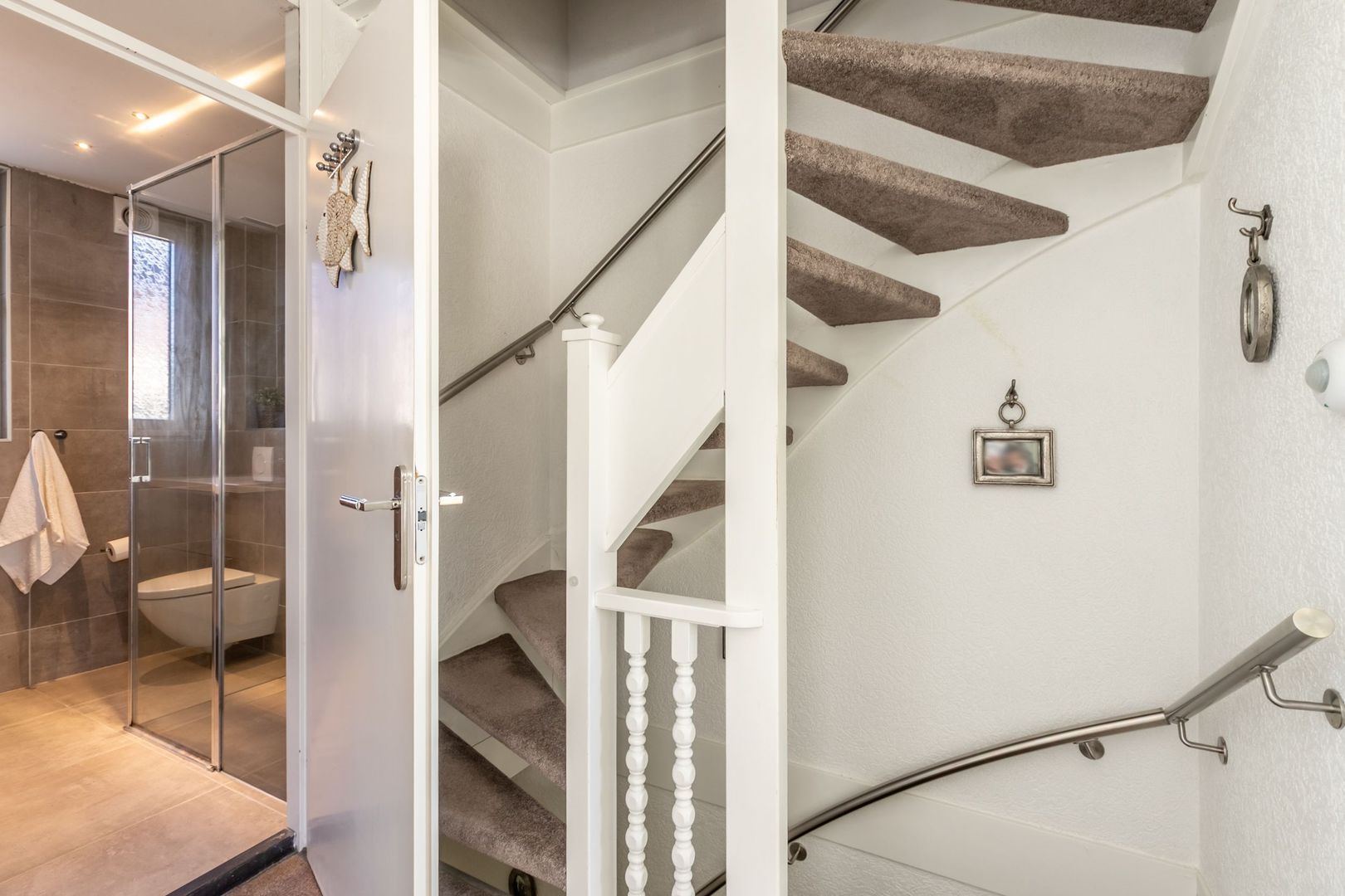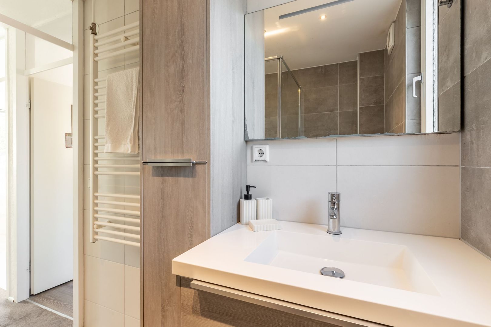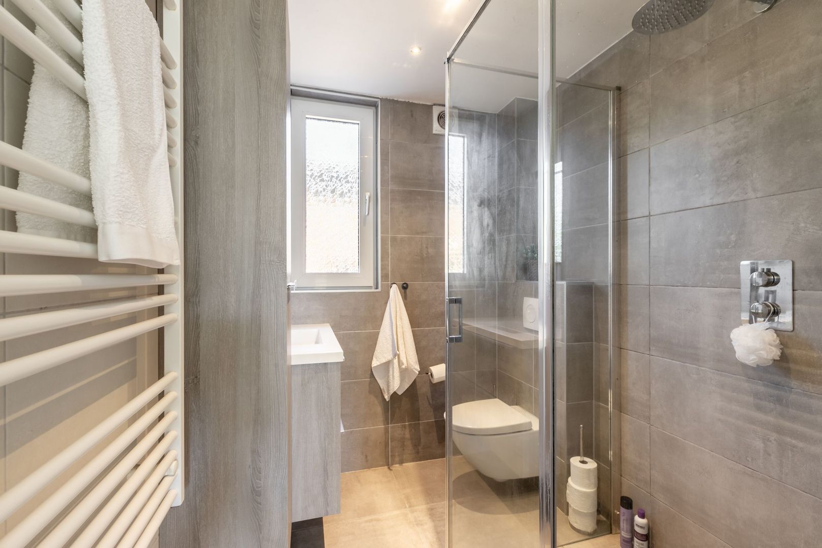 Modern tegelwerk siert de wanden en vloer.