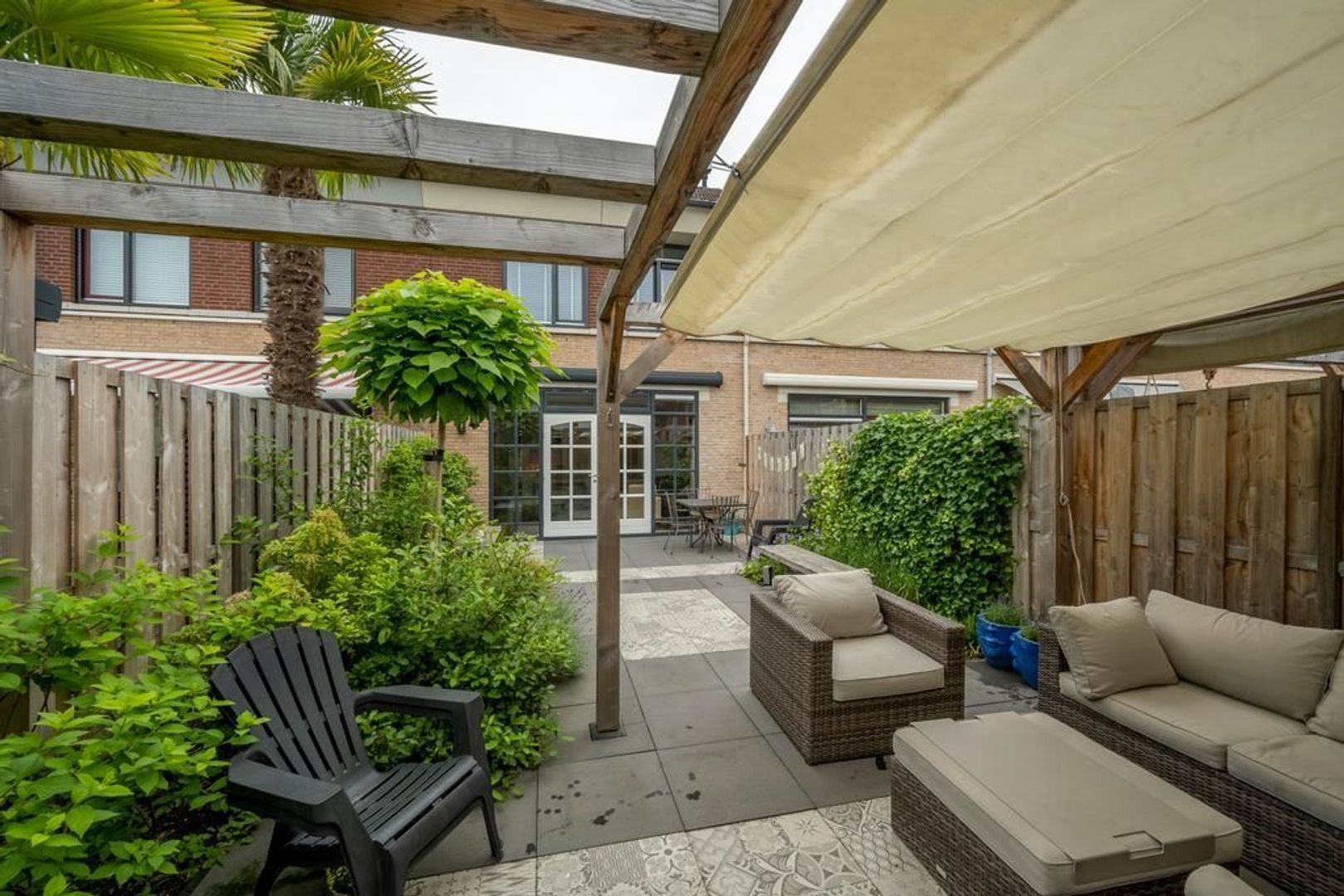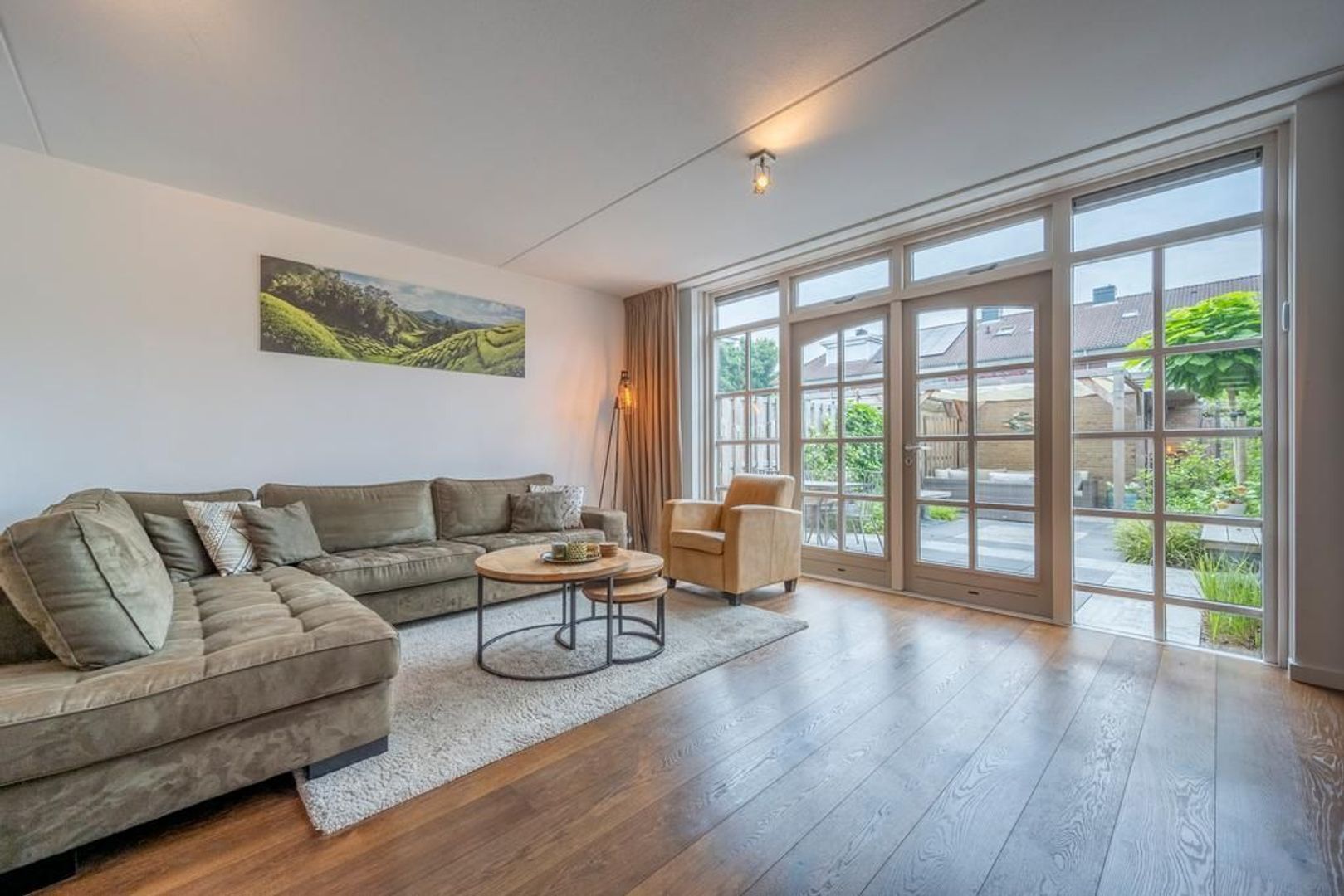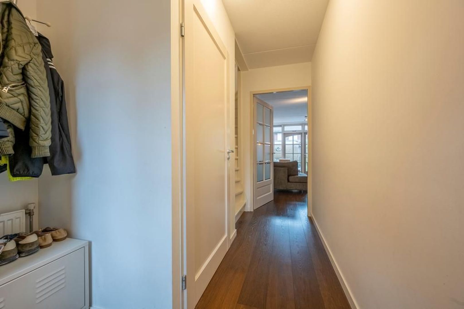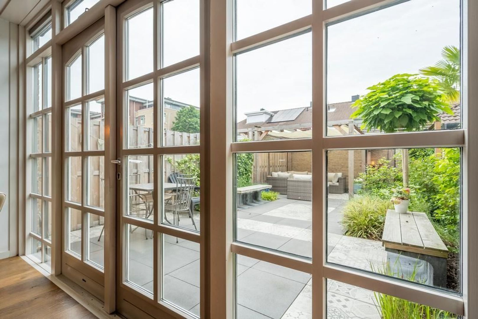 In de achtergevel is de oorspronkelijke schuifpui vervangen door een fraaie houten pui met vlakverdeling en openslaande deuren. Een echte sfeermaker!