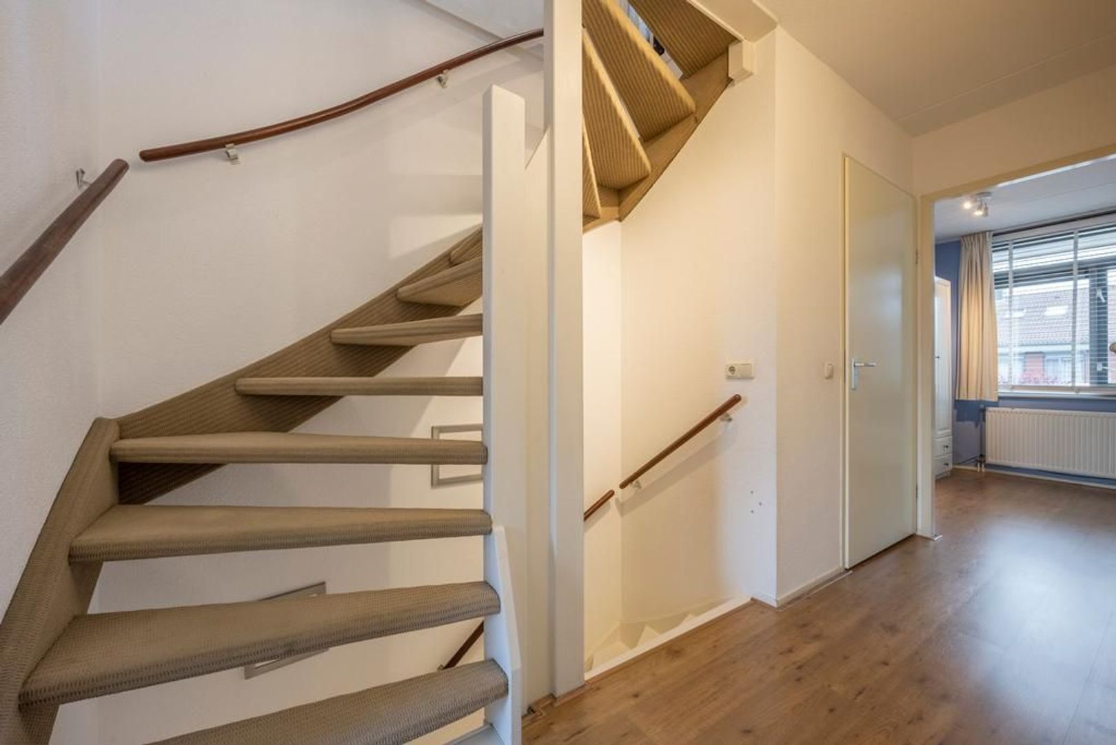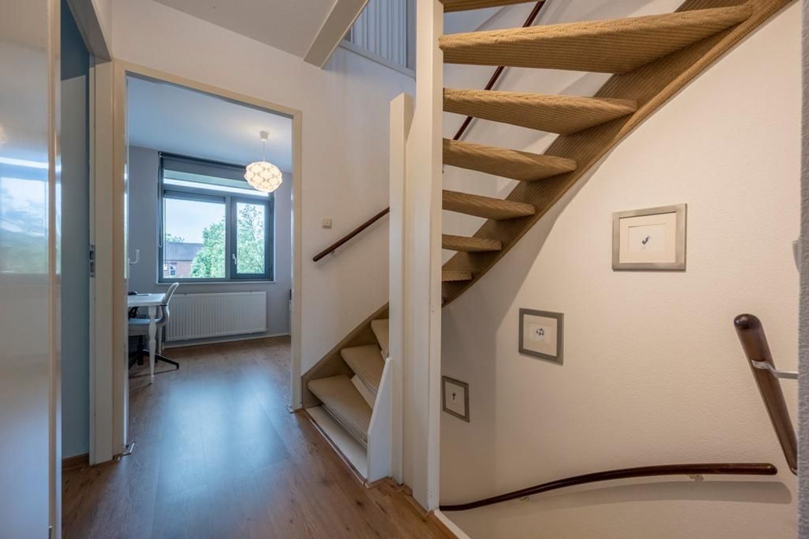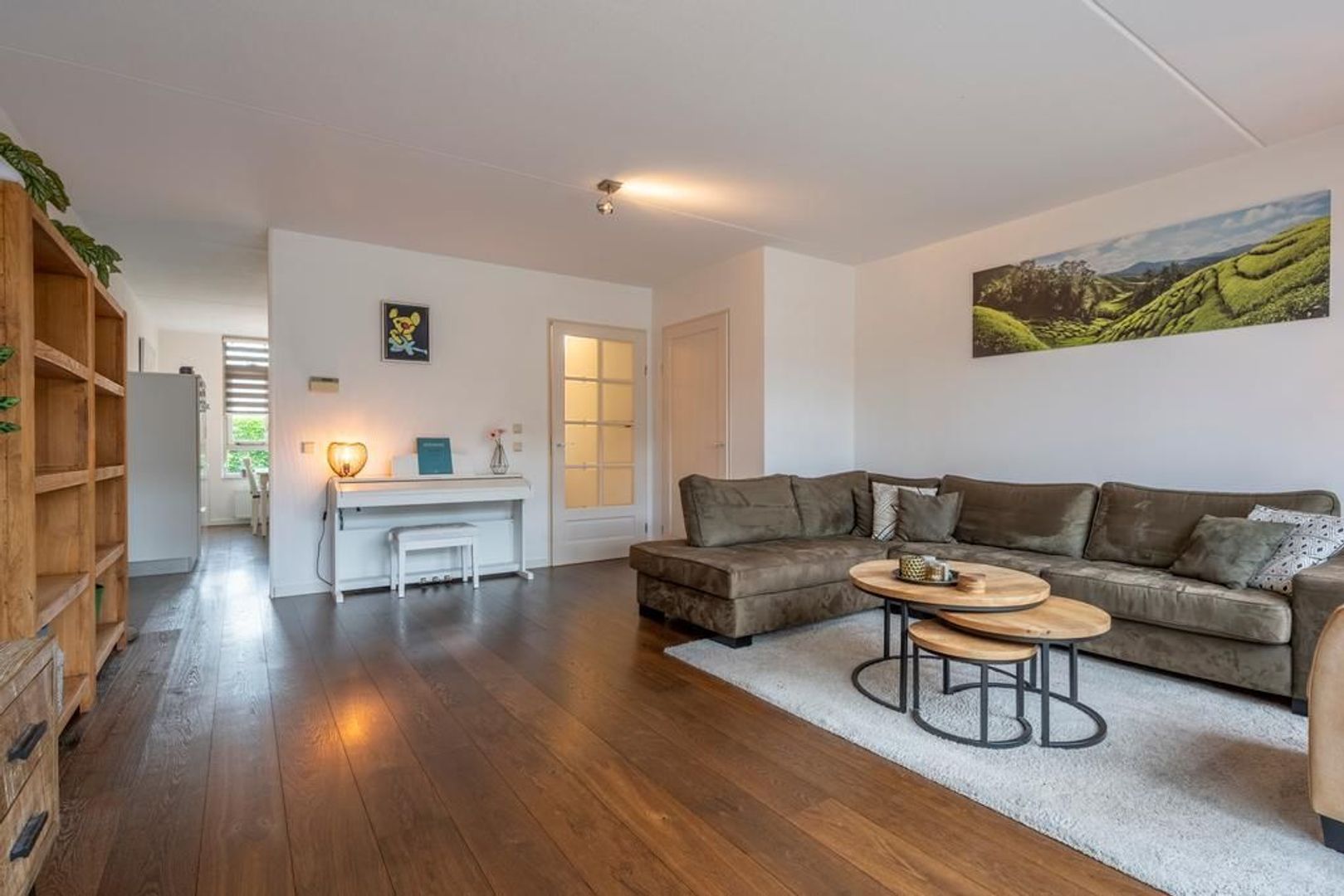 Gezellige, tuingerichte woonkamer met diepe trapkast.