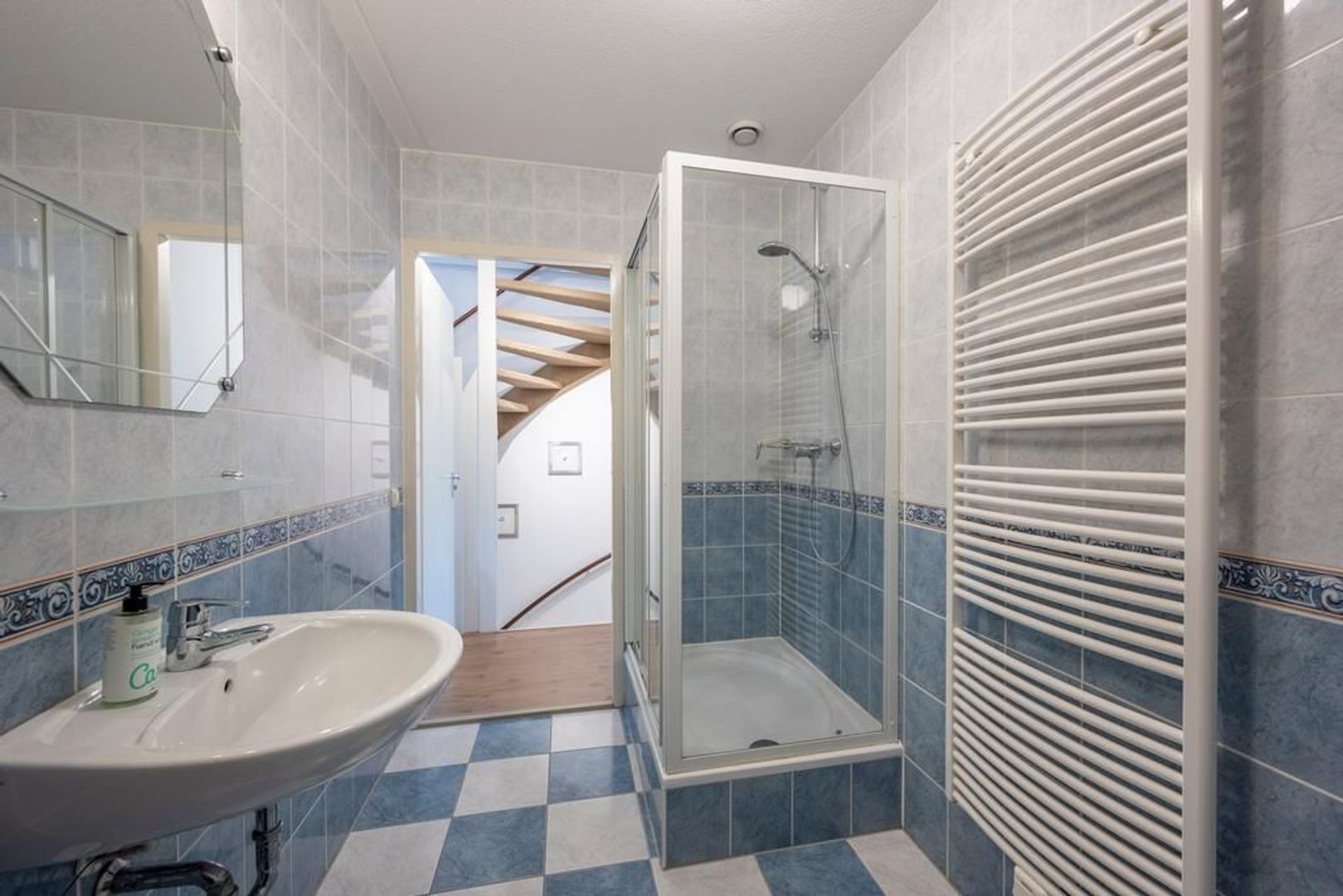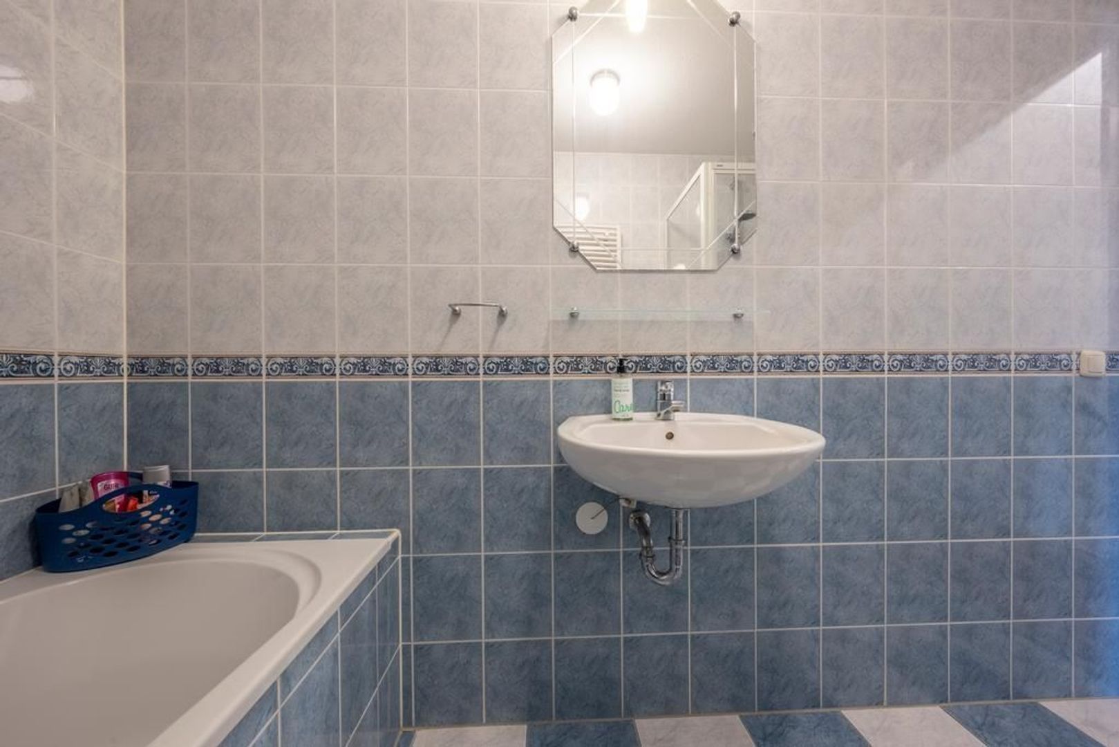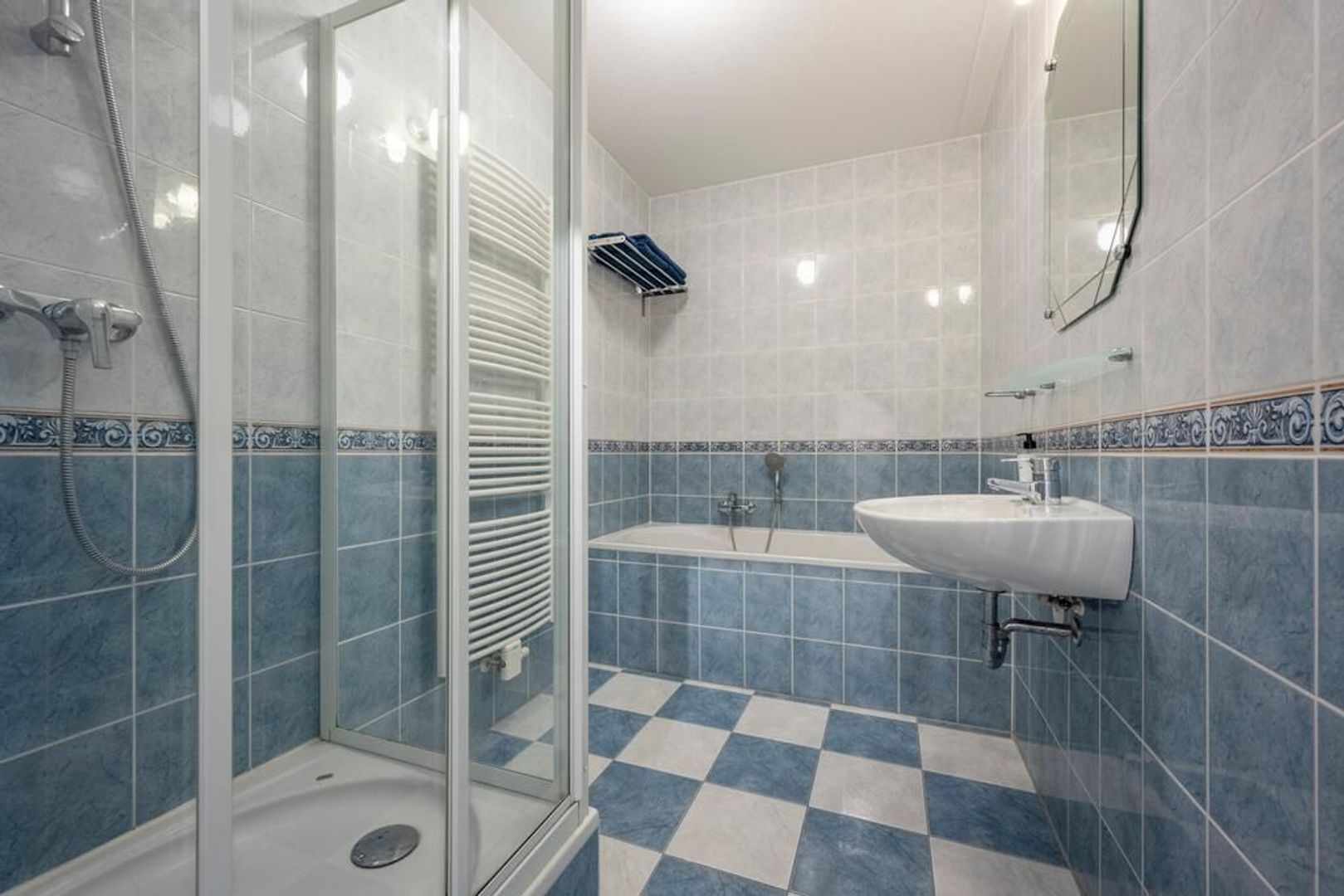 De badkamer dateert van de bouw (evenals de toiletten) en is ingericht met een ligbad, douchecabine, wastafel en design radiator.