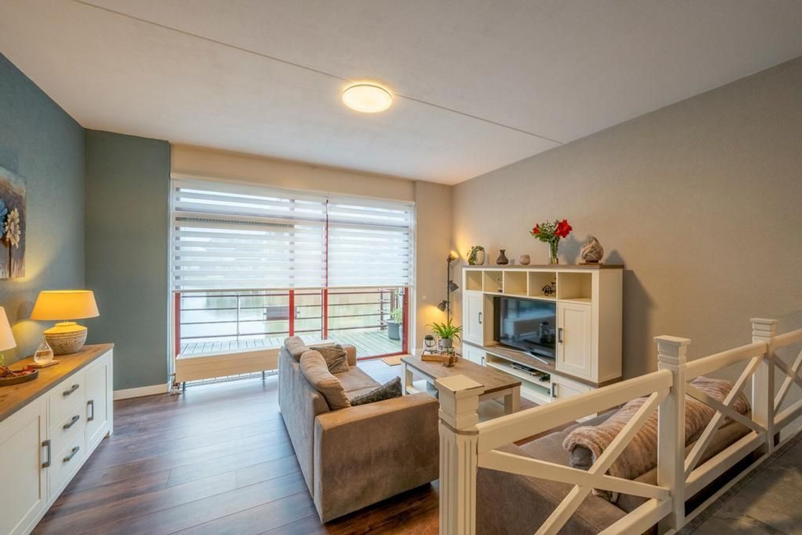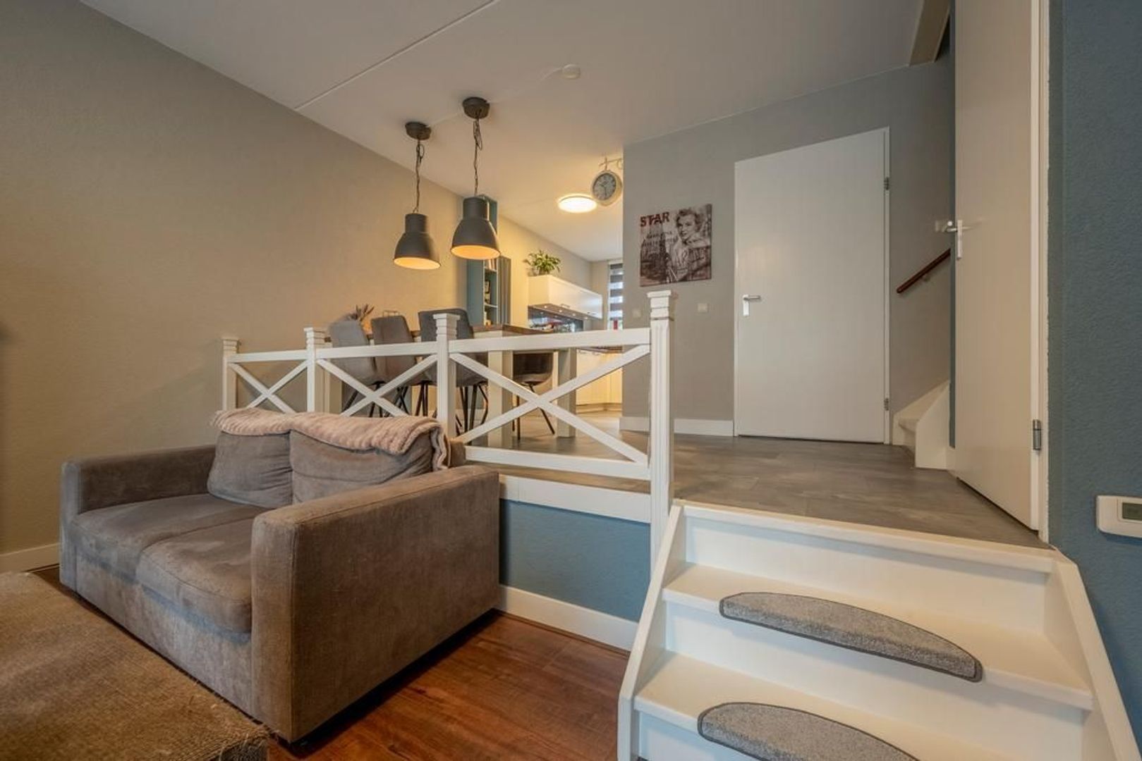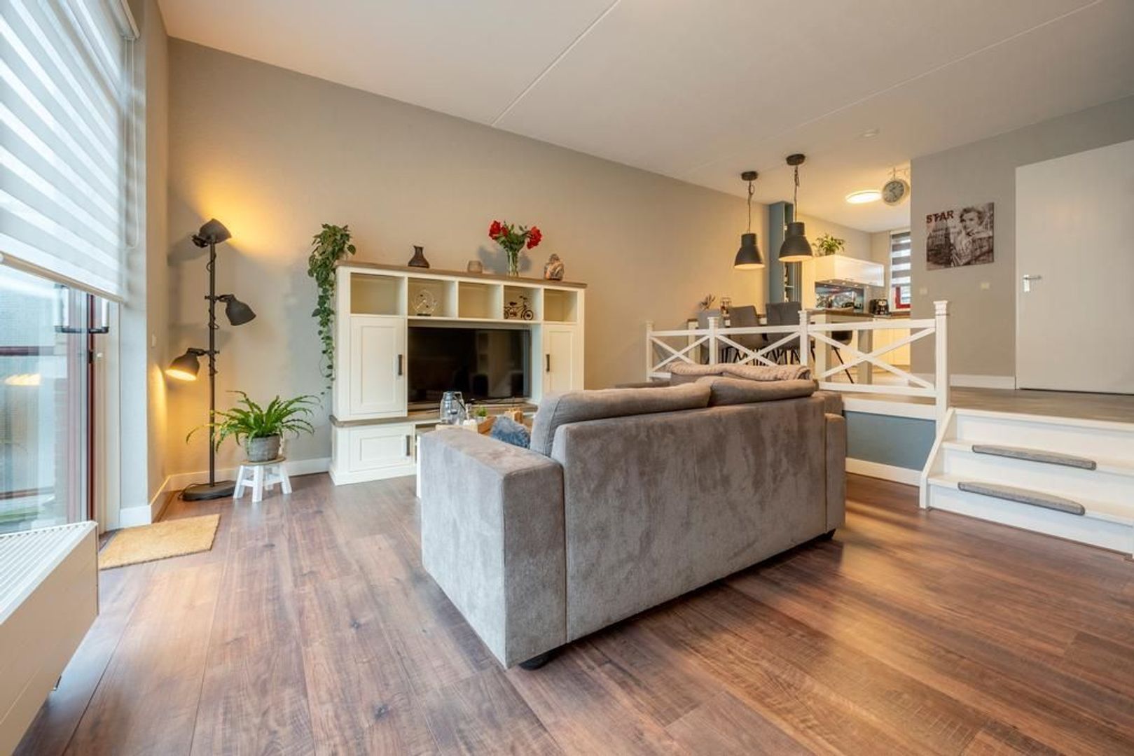 Het woongedeelte ligt een paar traptreden lager (splitlevel) en grenst aan het terras. De gevel is over de gehele breedte voorzien van glas en een schuifpui, wat zorgt voor een prettige lichtinval.