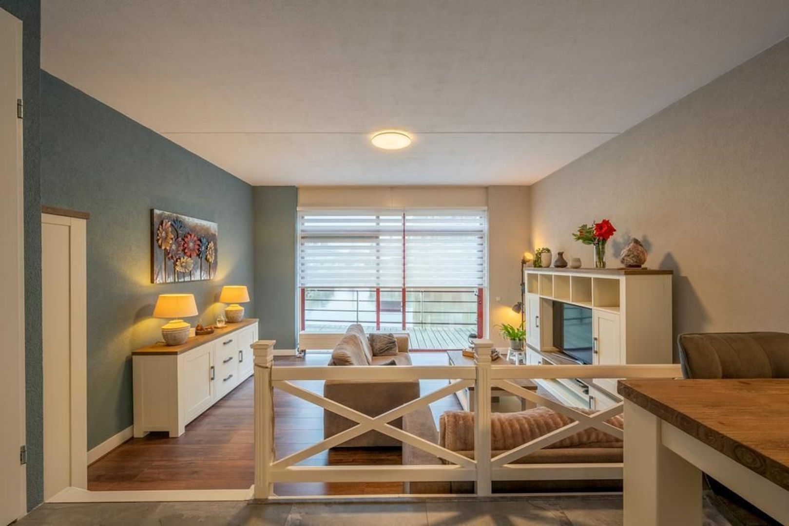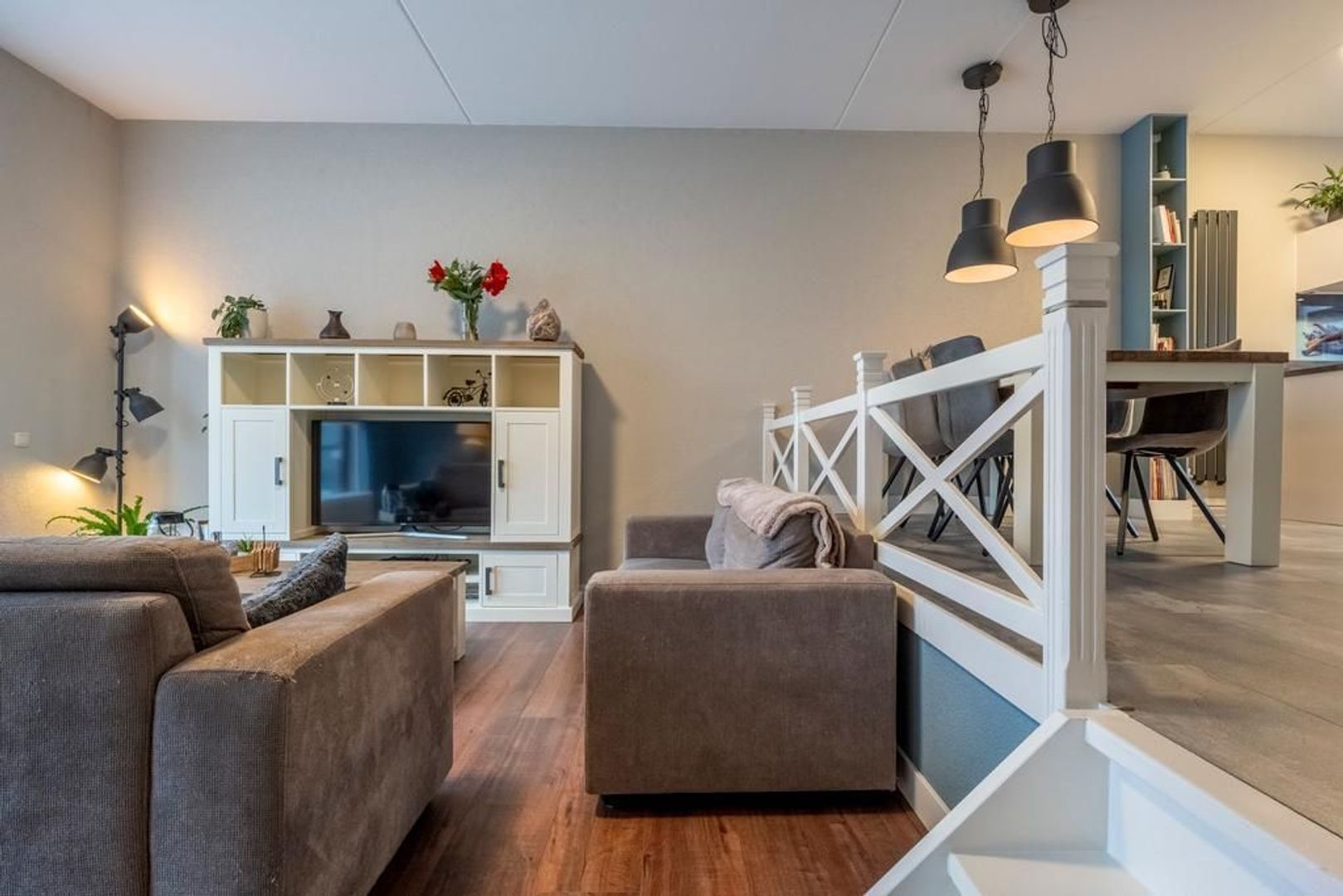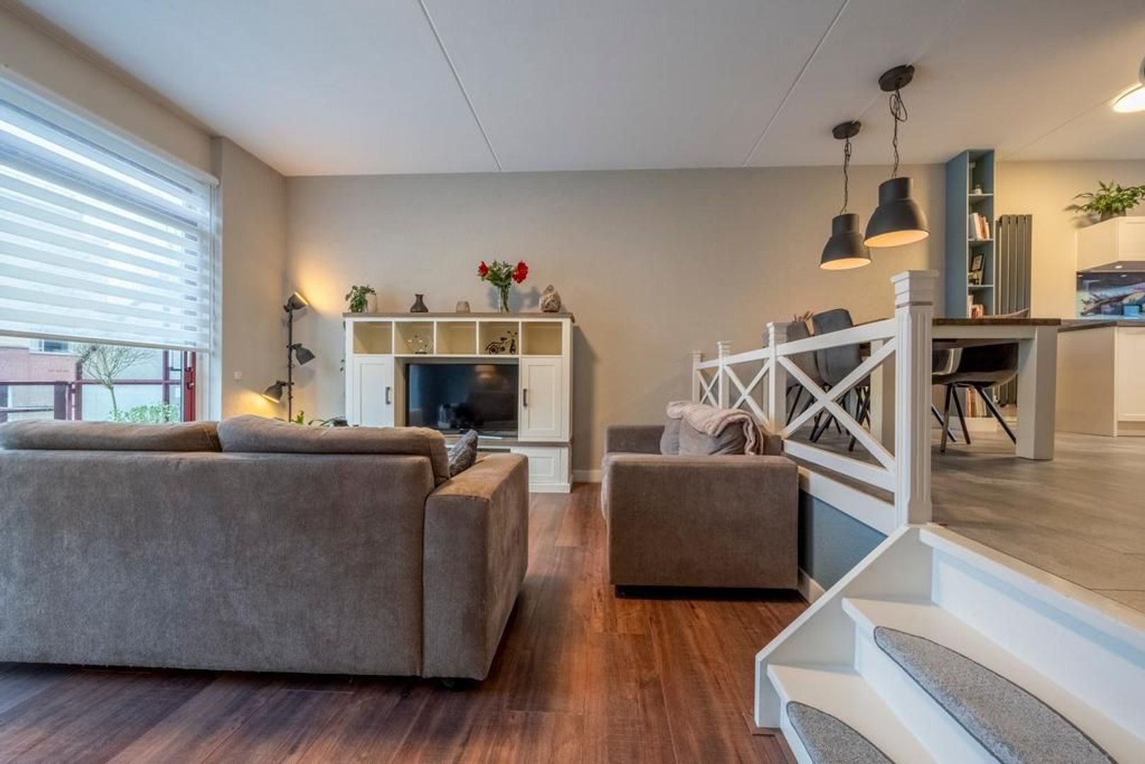 Het woongedeelte ligt een paar traptreden lager (splitlevel) en grenst aan het terras. De gevel is over de gehele breedte voorzien van glas en een schuifpui, wat zorgt voor een prettige lichtinval.