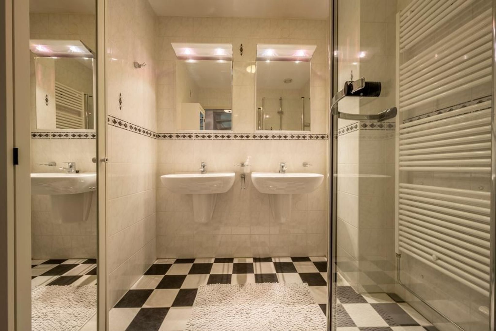 De badkamer is ingericht met een dubbele wastafel en een douchecabine. De wanden zijn volledig betegeld.