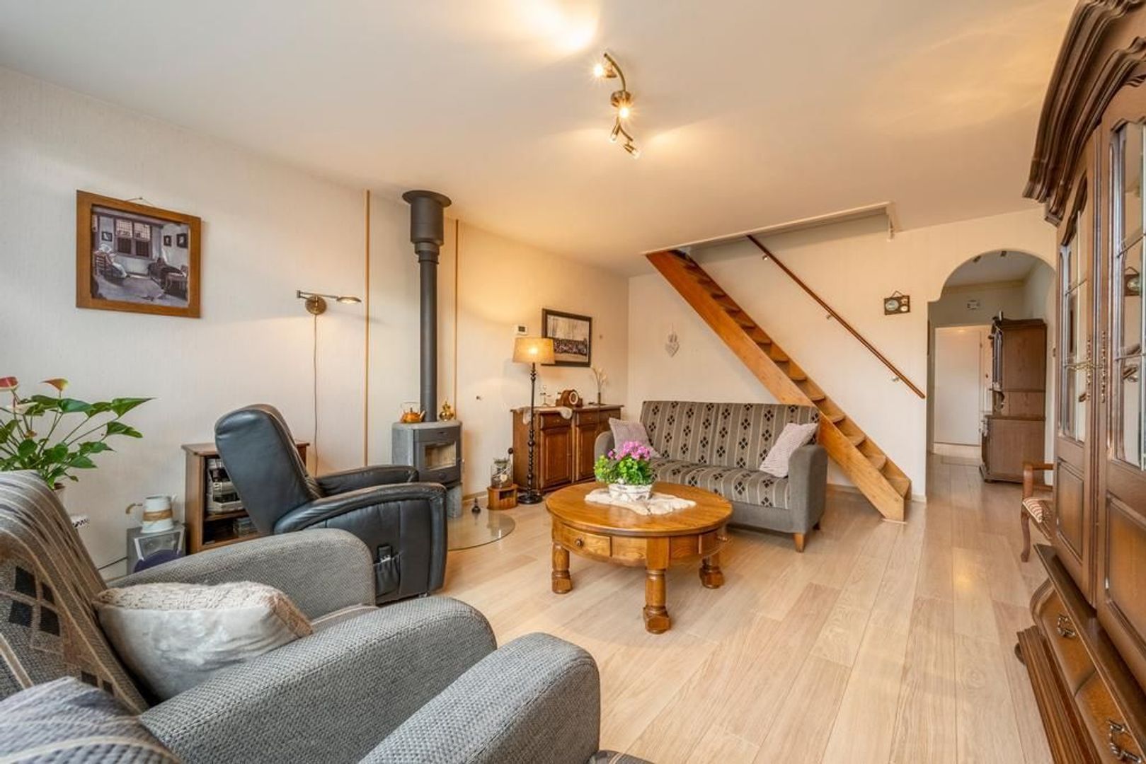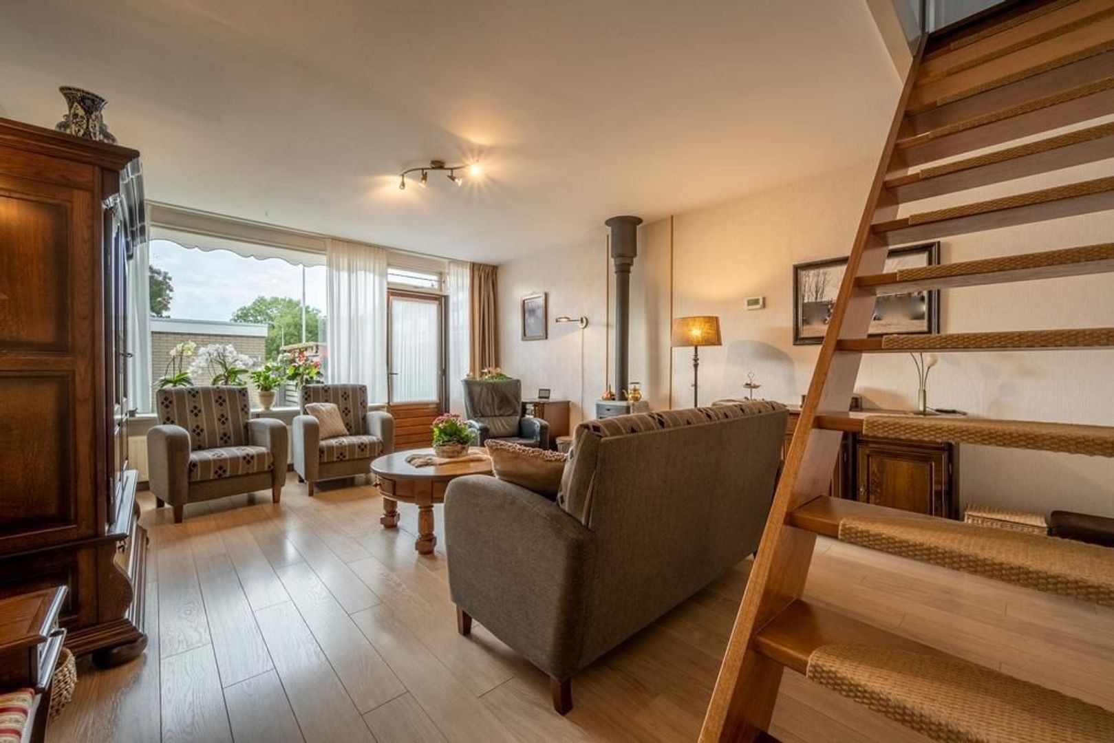 De (open) trap scheidt de keuken van de woonkamer, die op de tuin georiënteerd is. Mooi ruim en voorzien van een gezellige speksteen houtkachel.