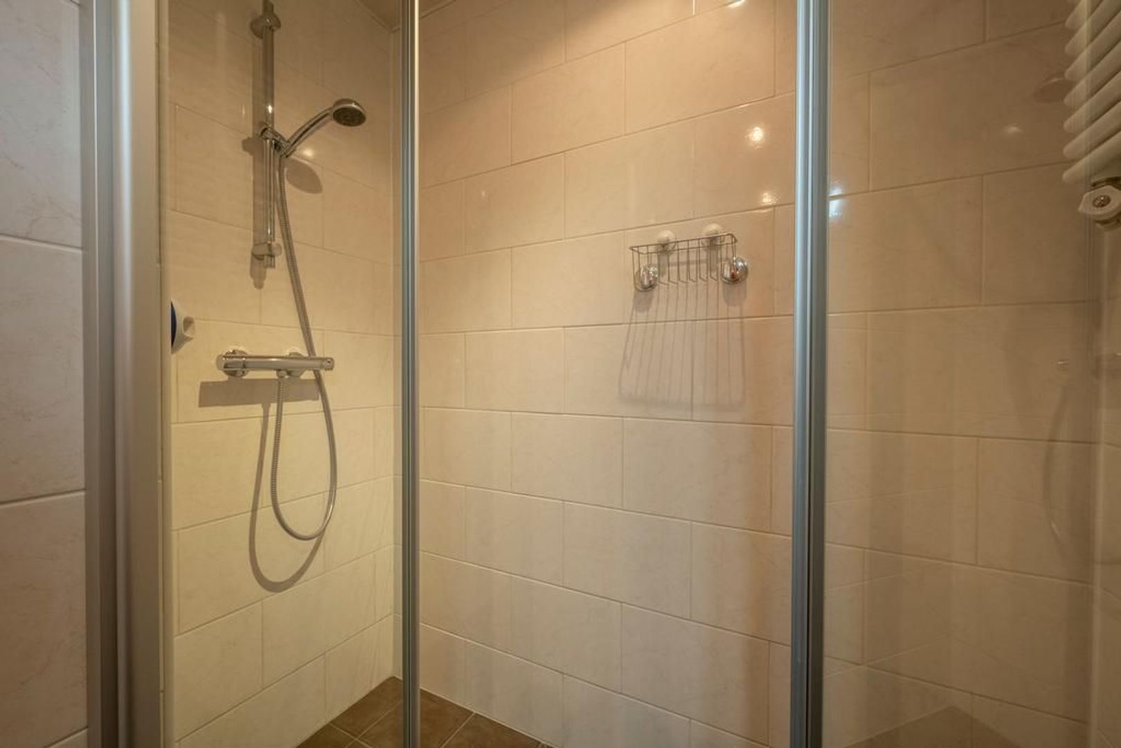 De badkamer is ingericht met een inloopdouche, een wastafelmeubel, een spiegelkast en een designradiator.