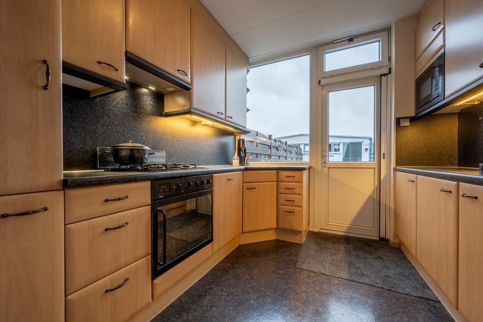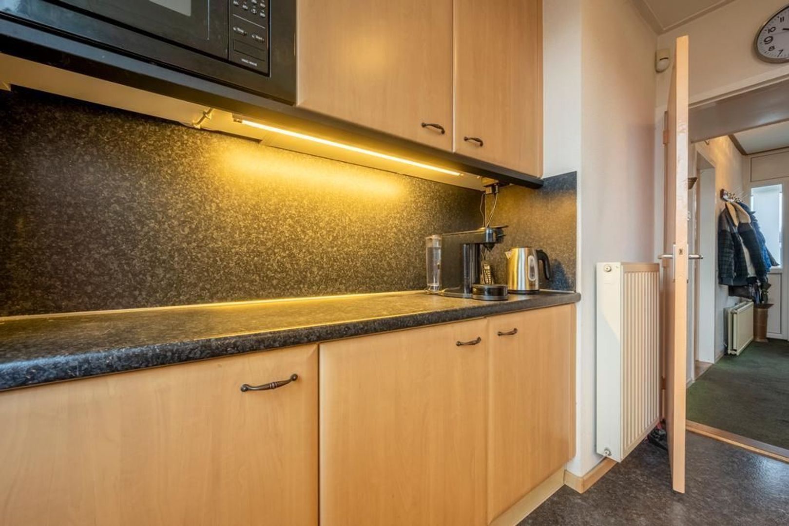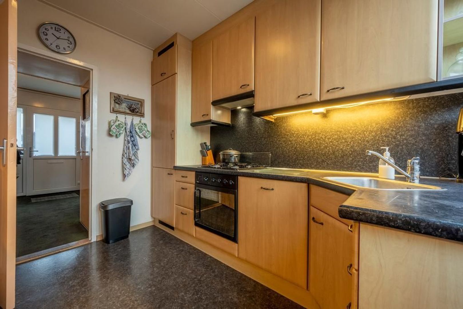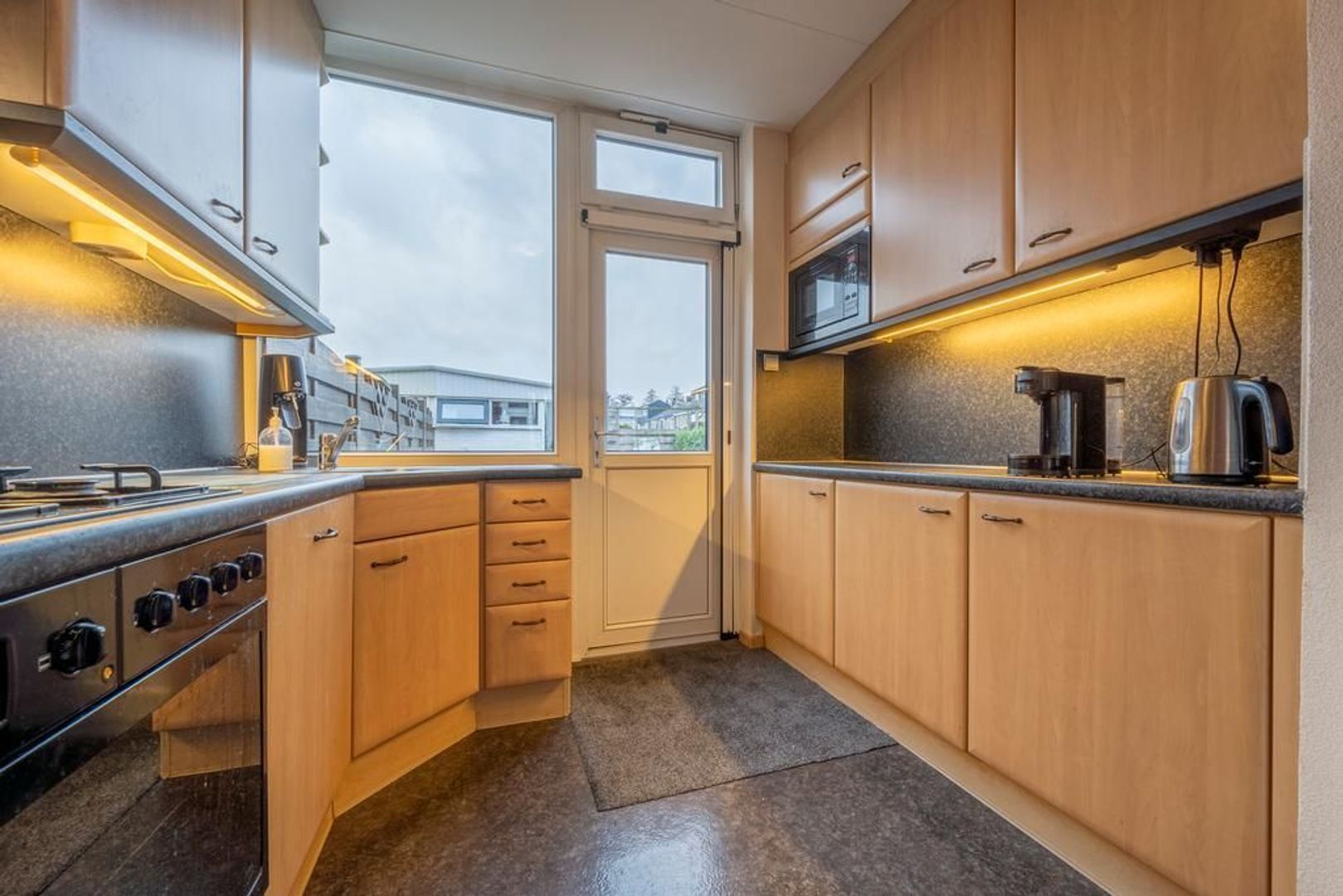 Dichte keuken met wandopstelling aan beide kanten, voorzien van een 4-pits gaskookplaat, afzuigkap, oven, magnetron, vaatwasser en koel-vriescombinatie.
