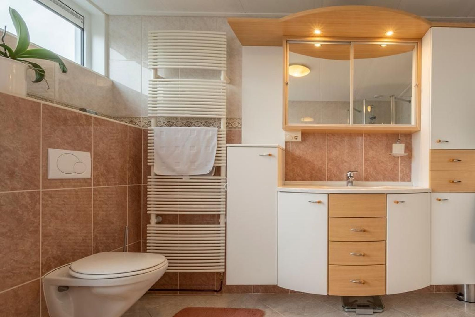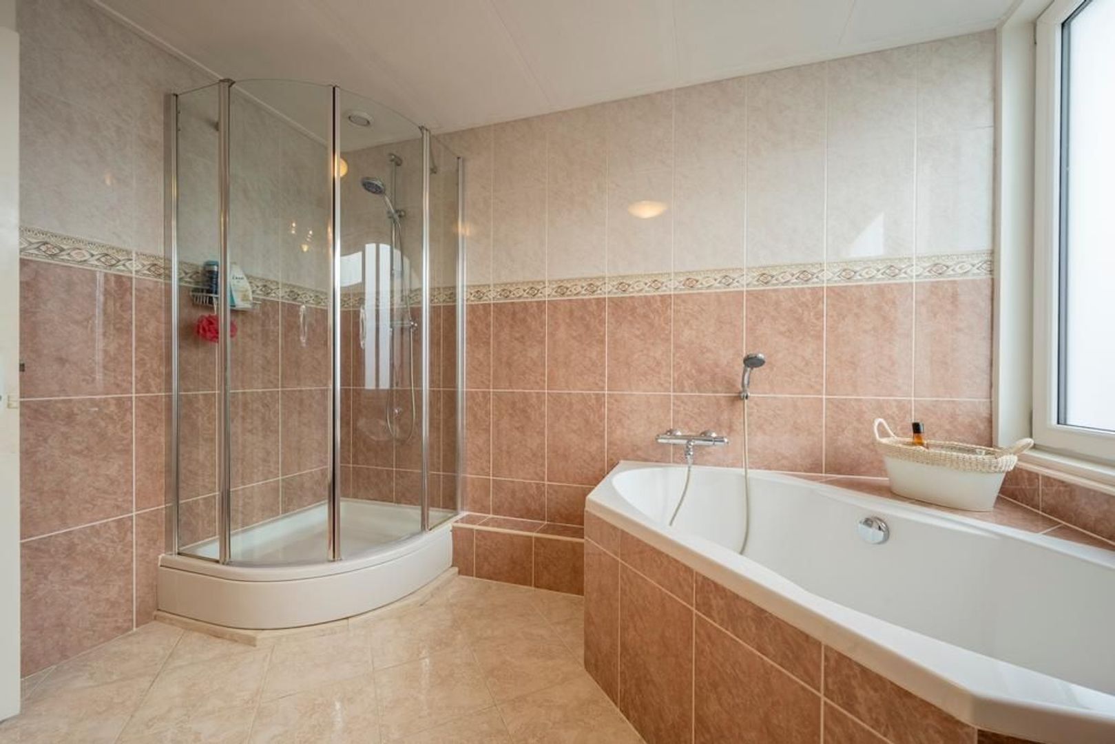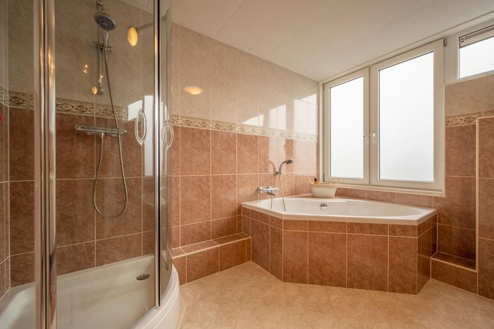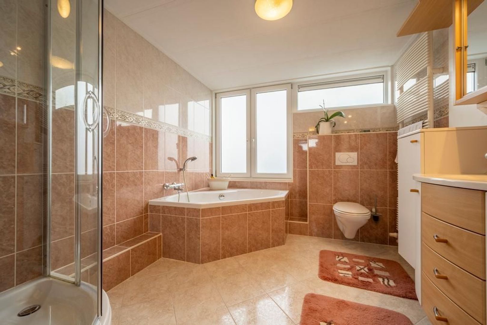De badkamer is ingericht met een wandcloset, hoekbad, wastafelmeubel en douchecabine en is volledig betegeld. Het raam maakt ventileren met frisse lucht mogelijk en de vloer is voorzien van comfortabele vloerverwarming.