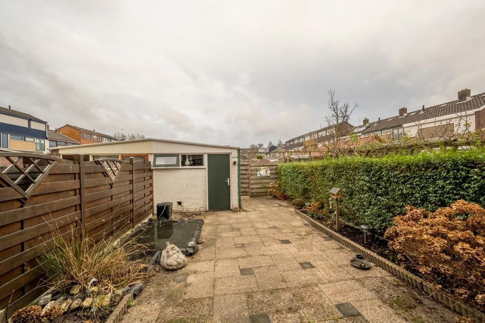De achtertuin ligt op het noorden en grenst aan een pleintje.