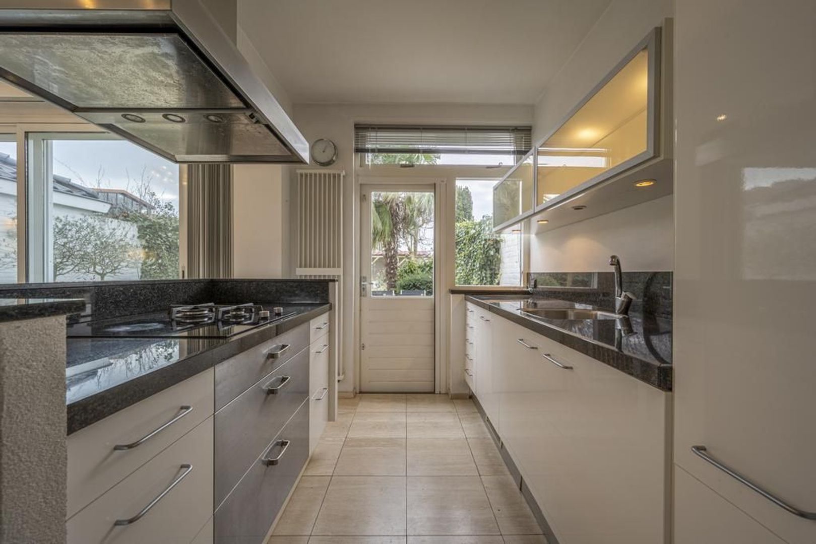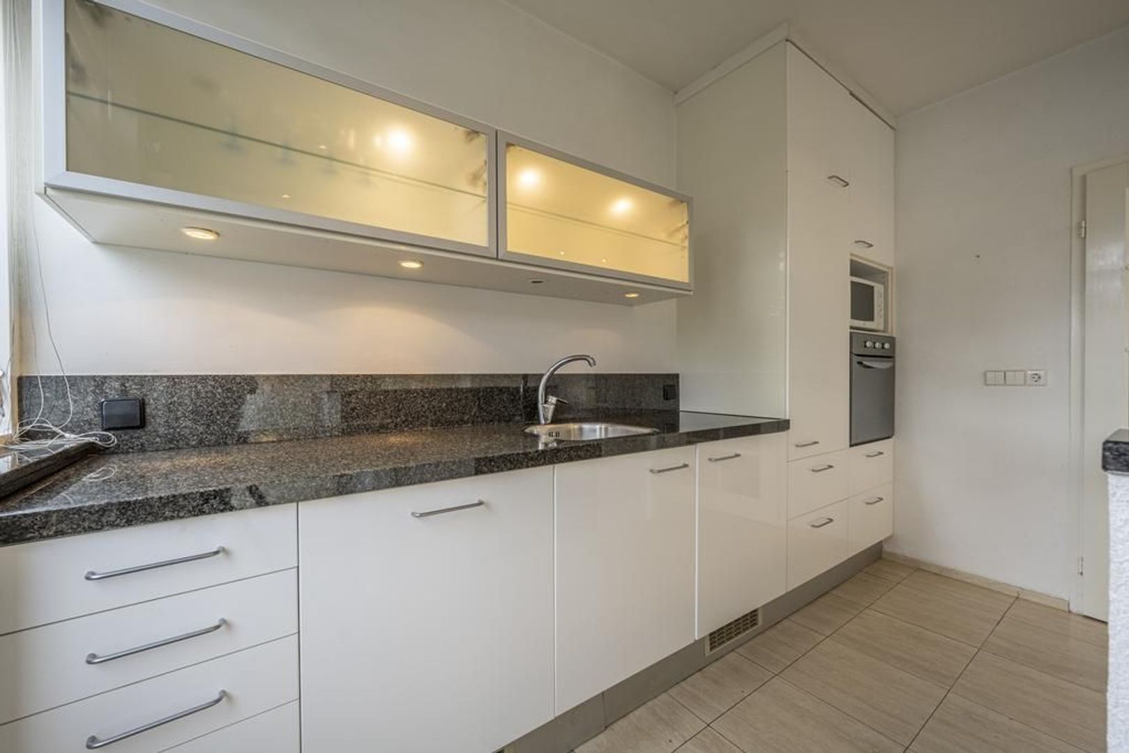 De moderne keuken bestaat uit een vrijstaand kookeiland en een wandopstelling, voorzien van complete inbouwapparatuur en een hoogwaardig granieten aanrechtblad.