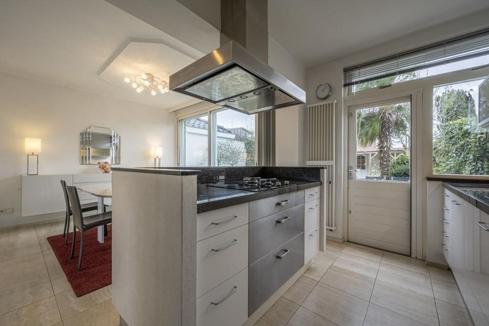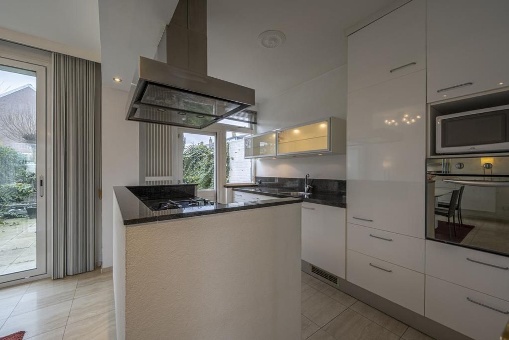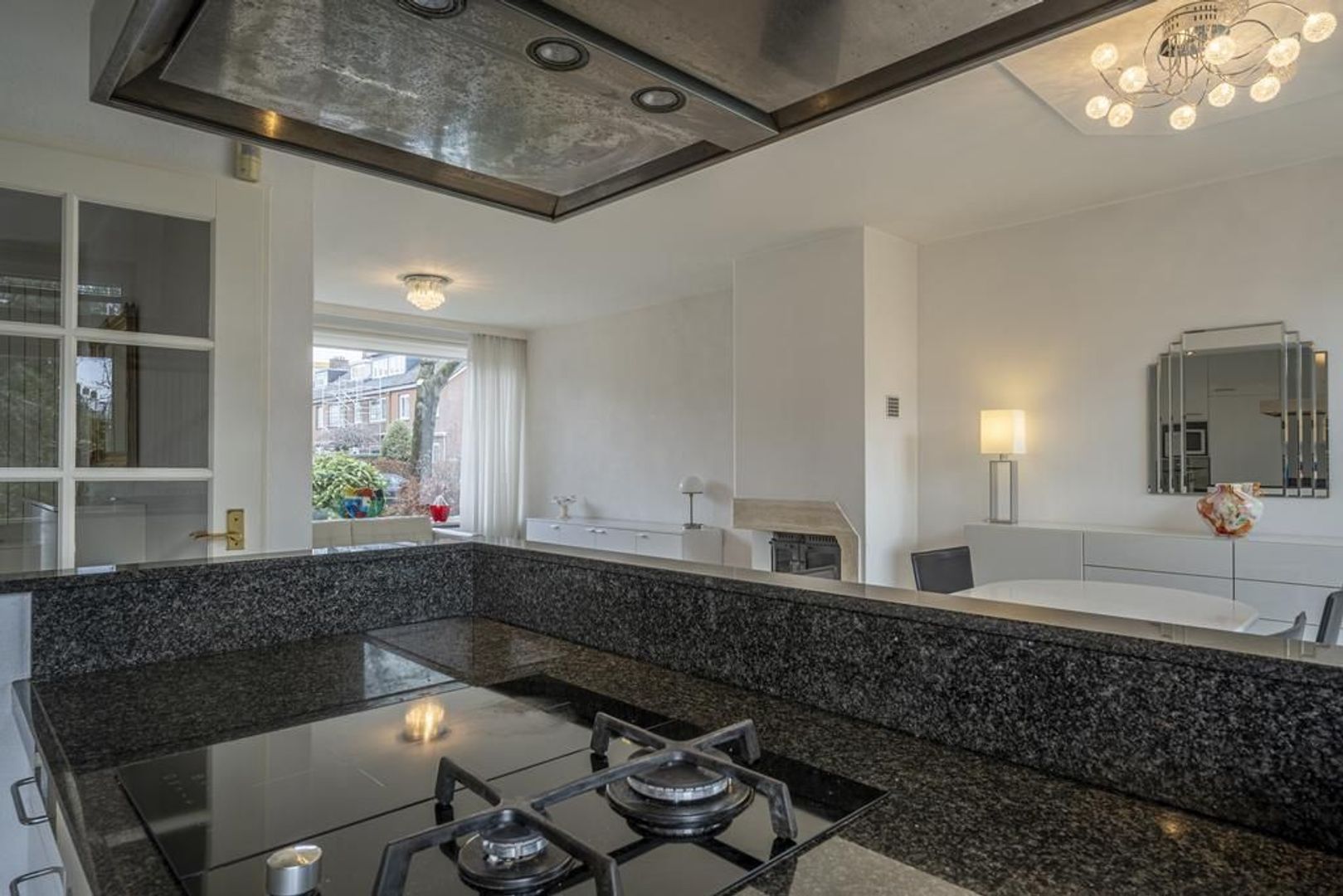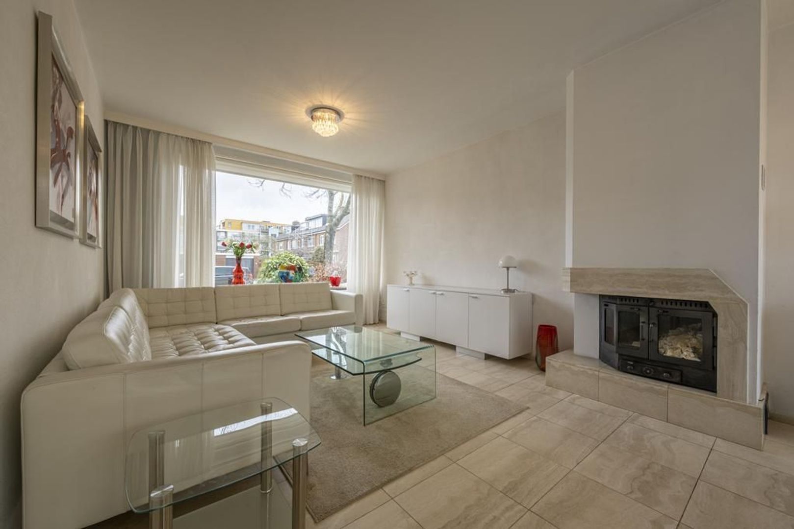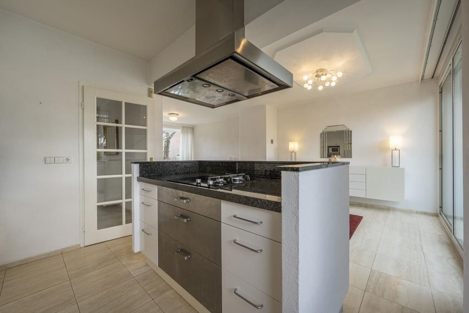 Doorzon woonkamer met schuifpui naar de tuin, inzethaard (Barbas) en open keuken met deur naar de tuin.