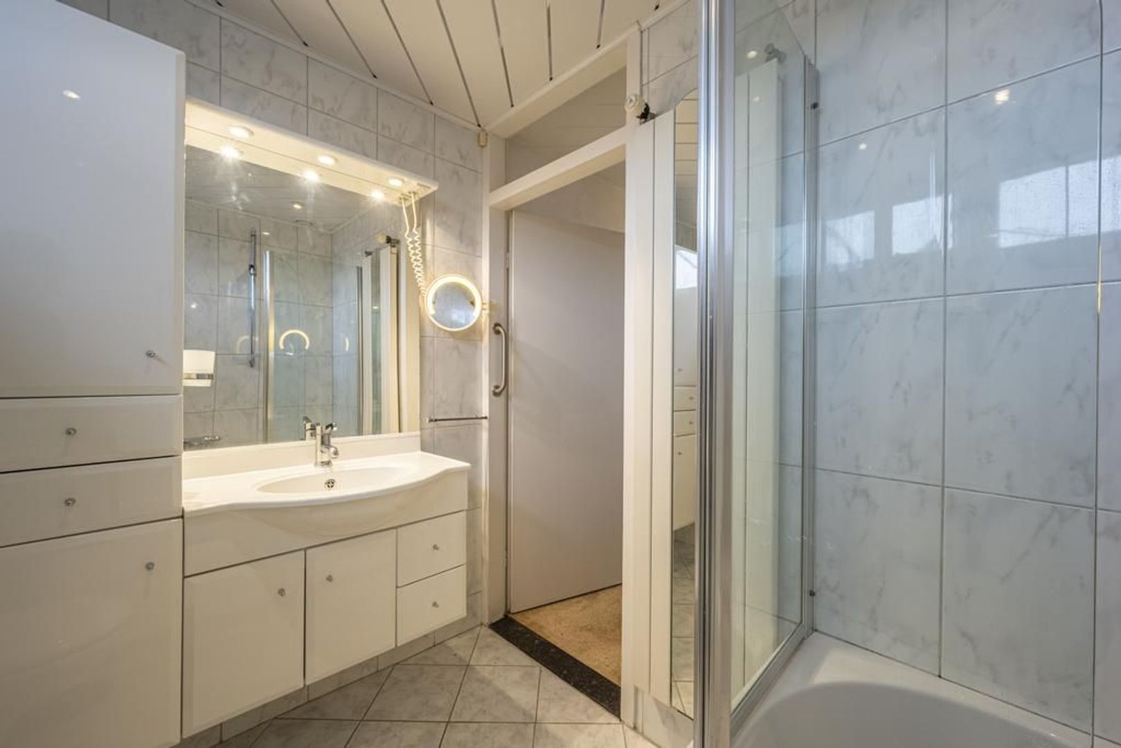 De begane grondvloer is afgewerkt met een travertin vloer in de woonkamer en keuken.