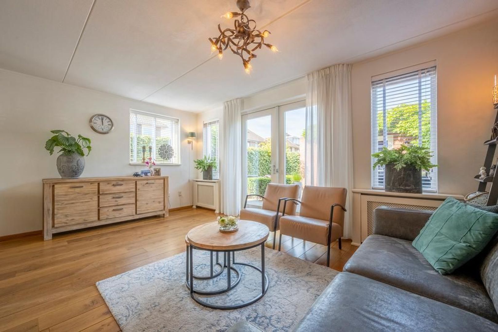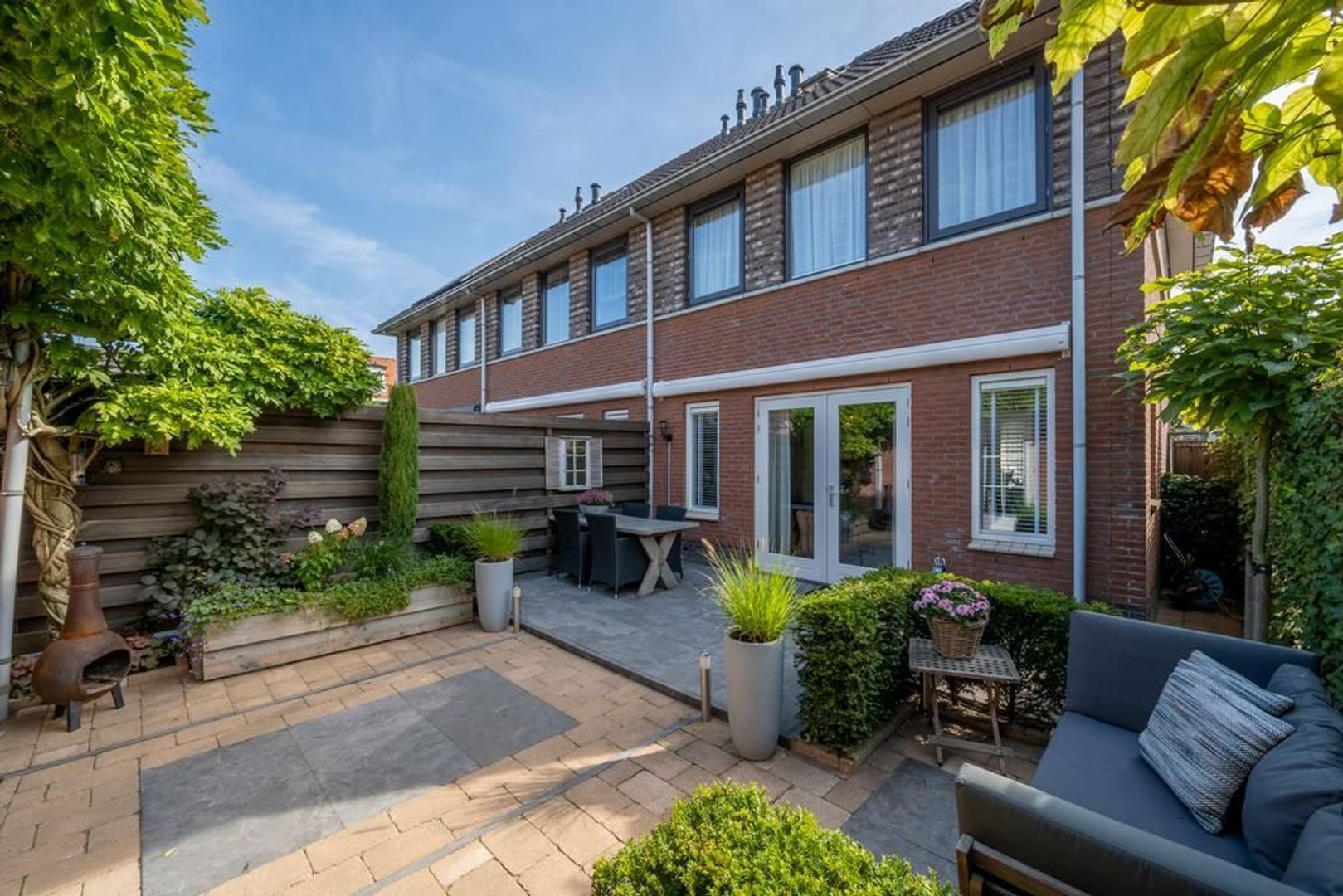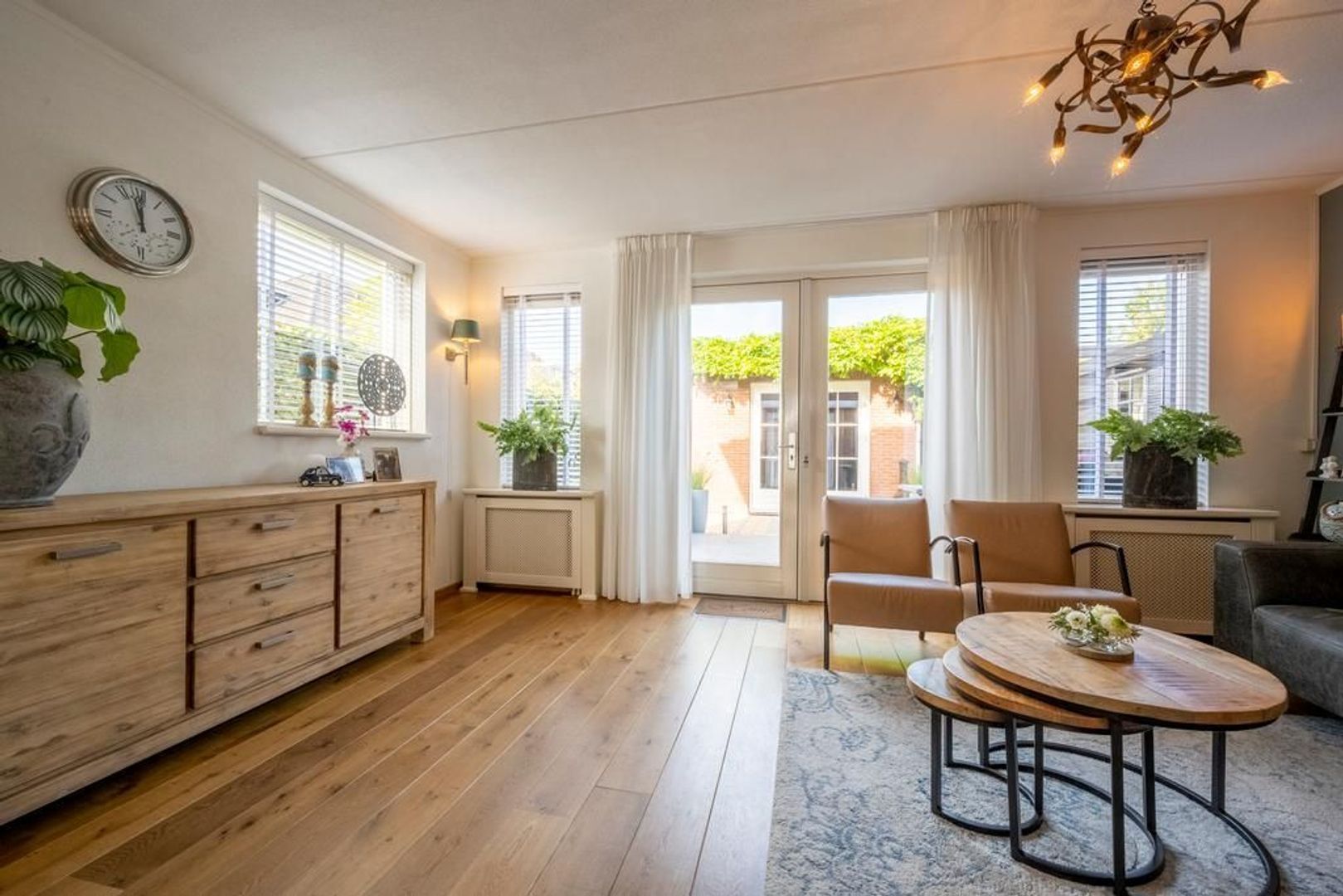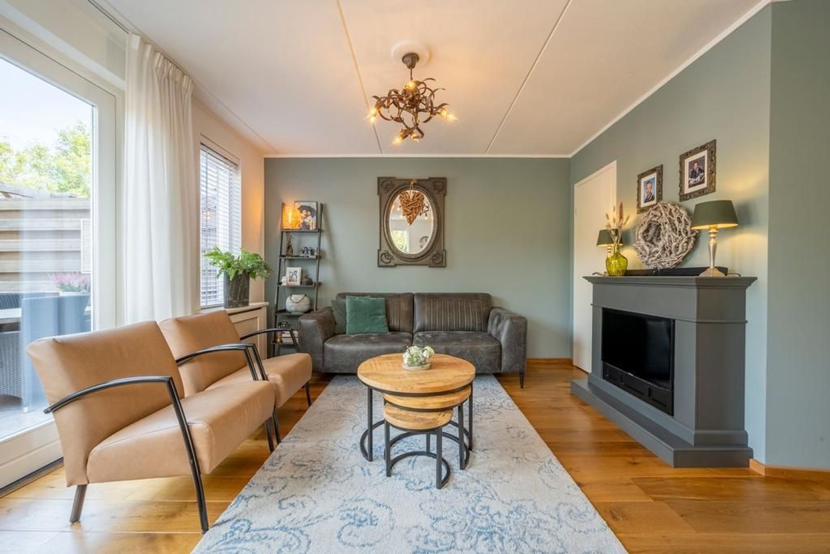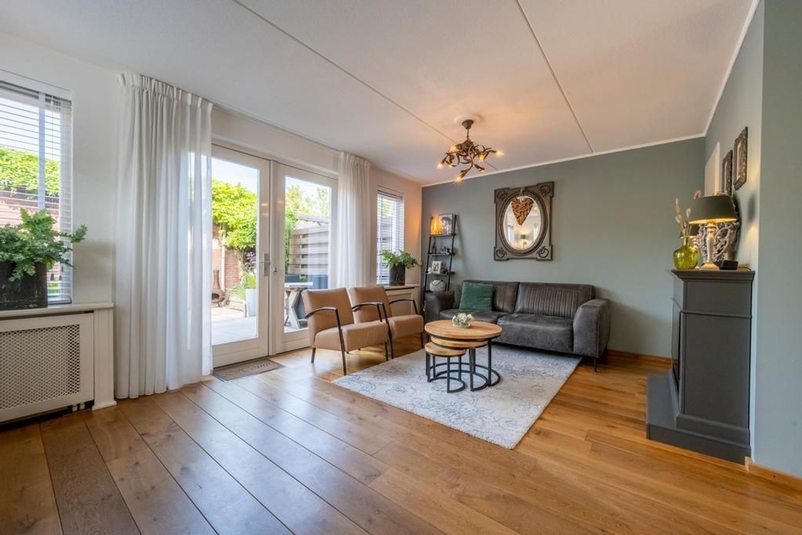 De tuingerichte woonkamer heeft openslaande deuren naar de tuin. De sierschouw maakt het extra gezellig.