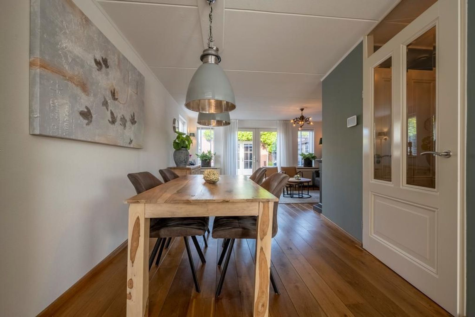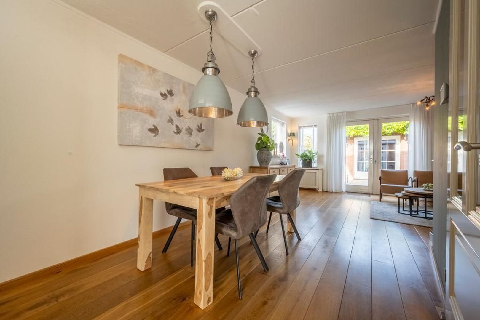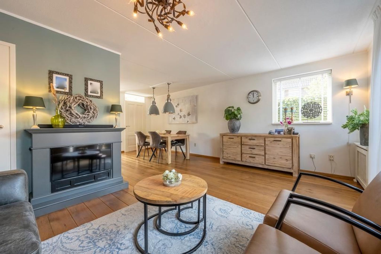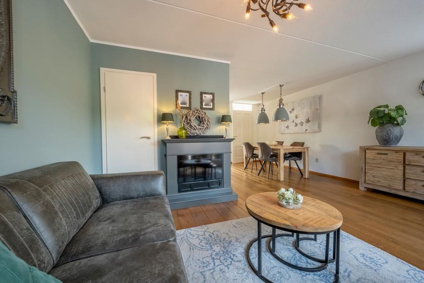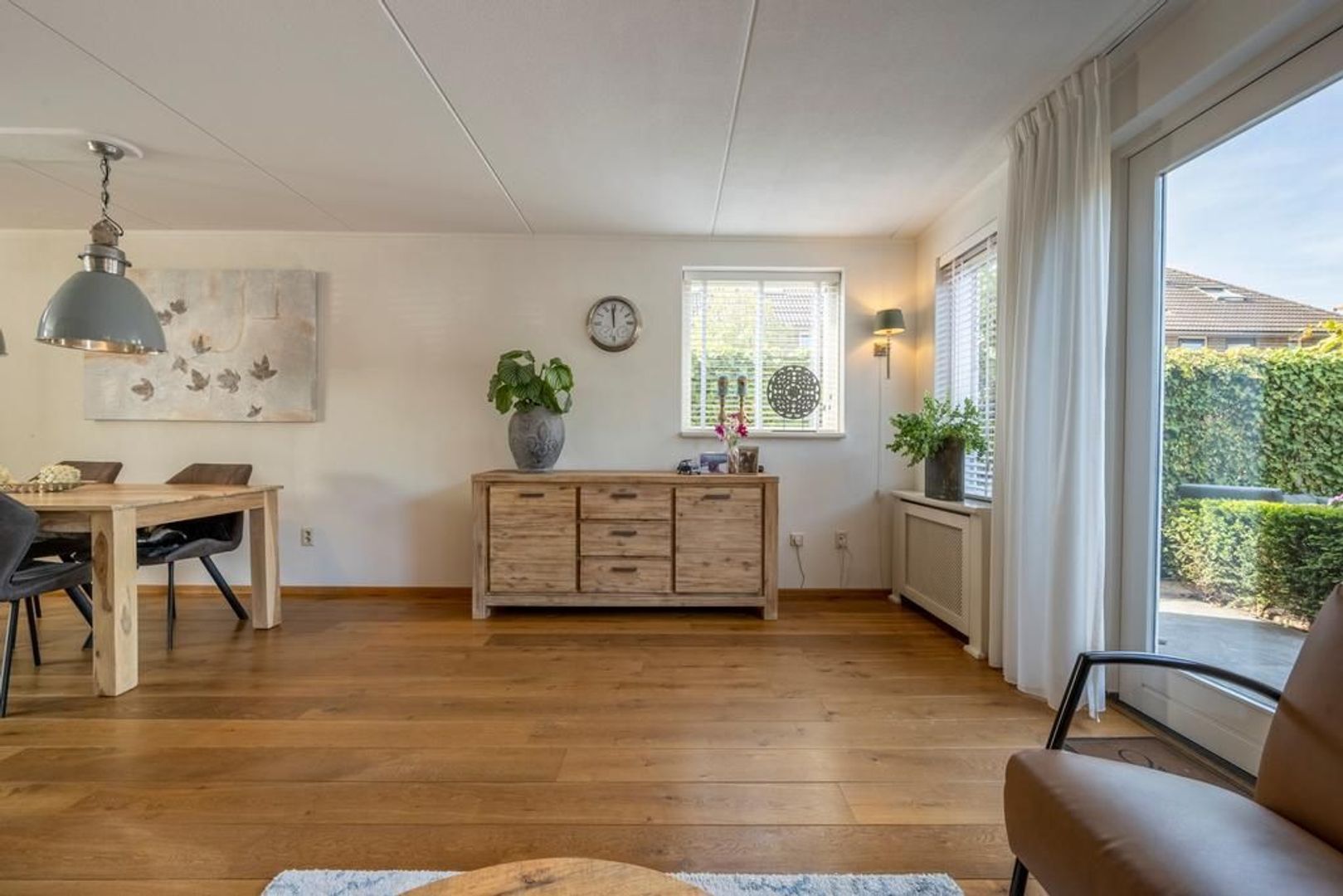 De tuingerichte woonkamer heeft openslaande deuren naar de tuin. De sierschouw maakt het extra gezellig.