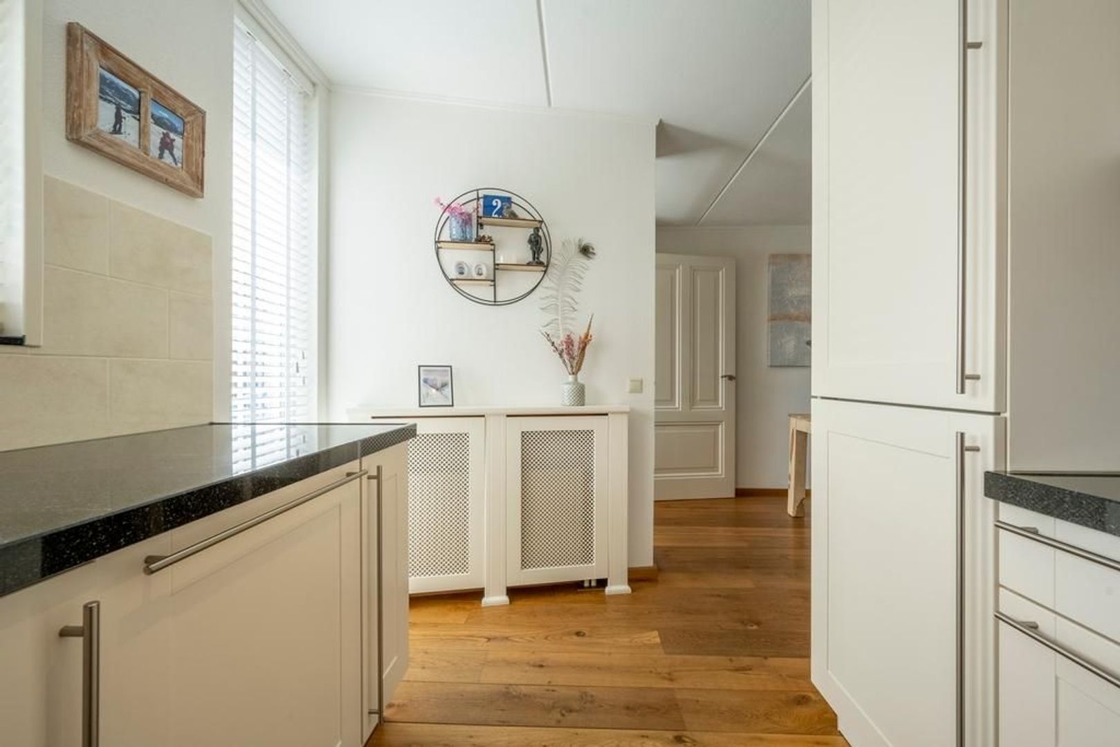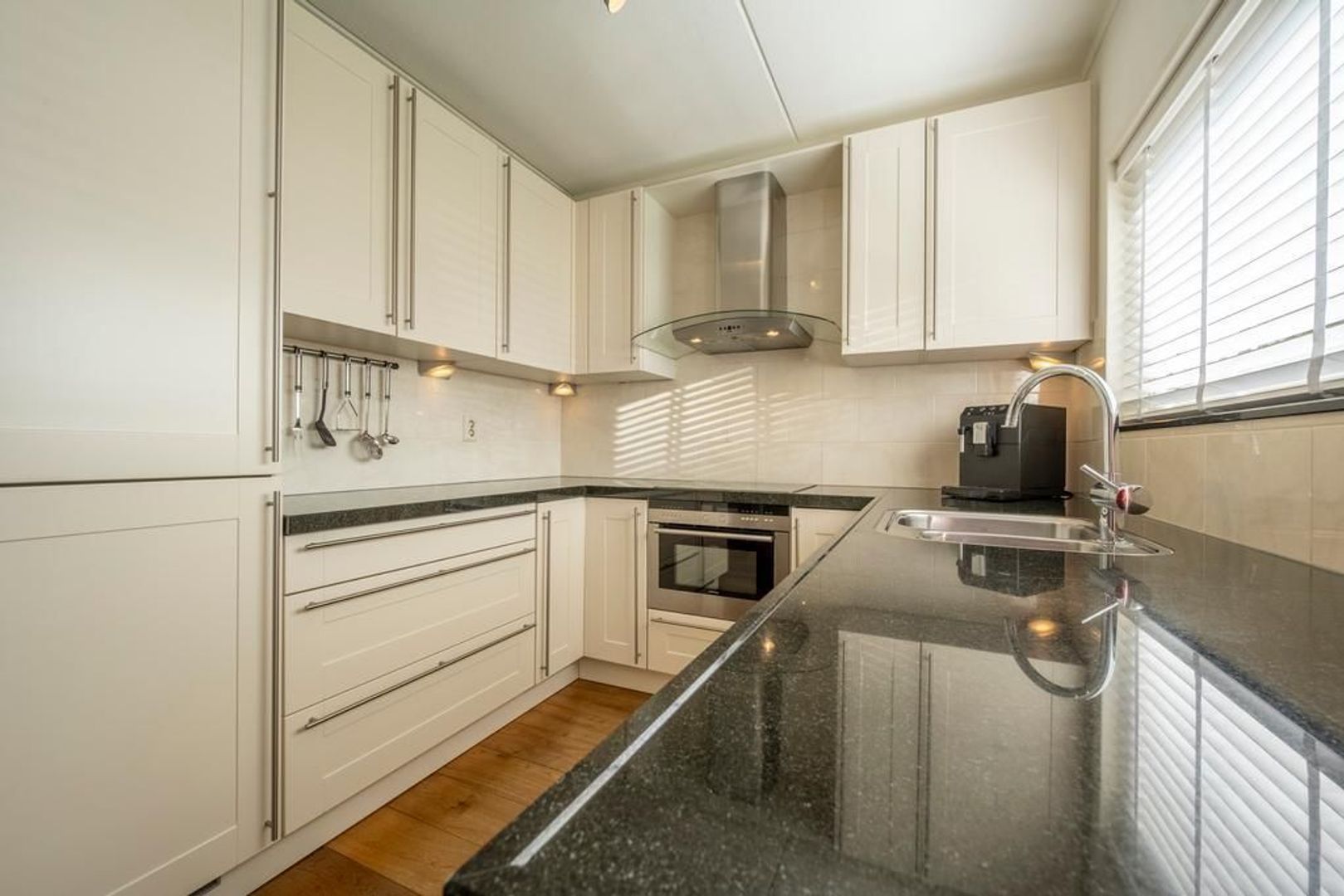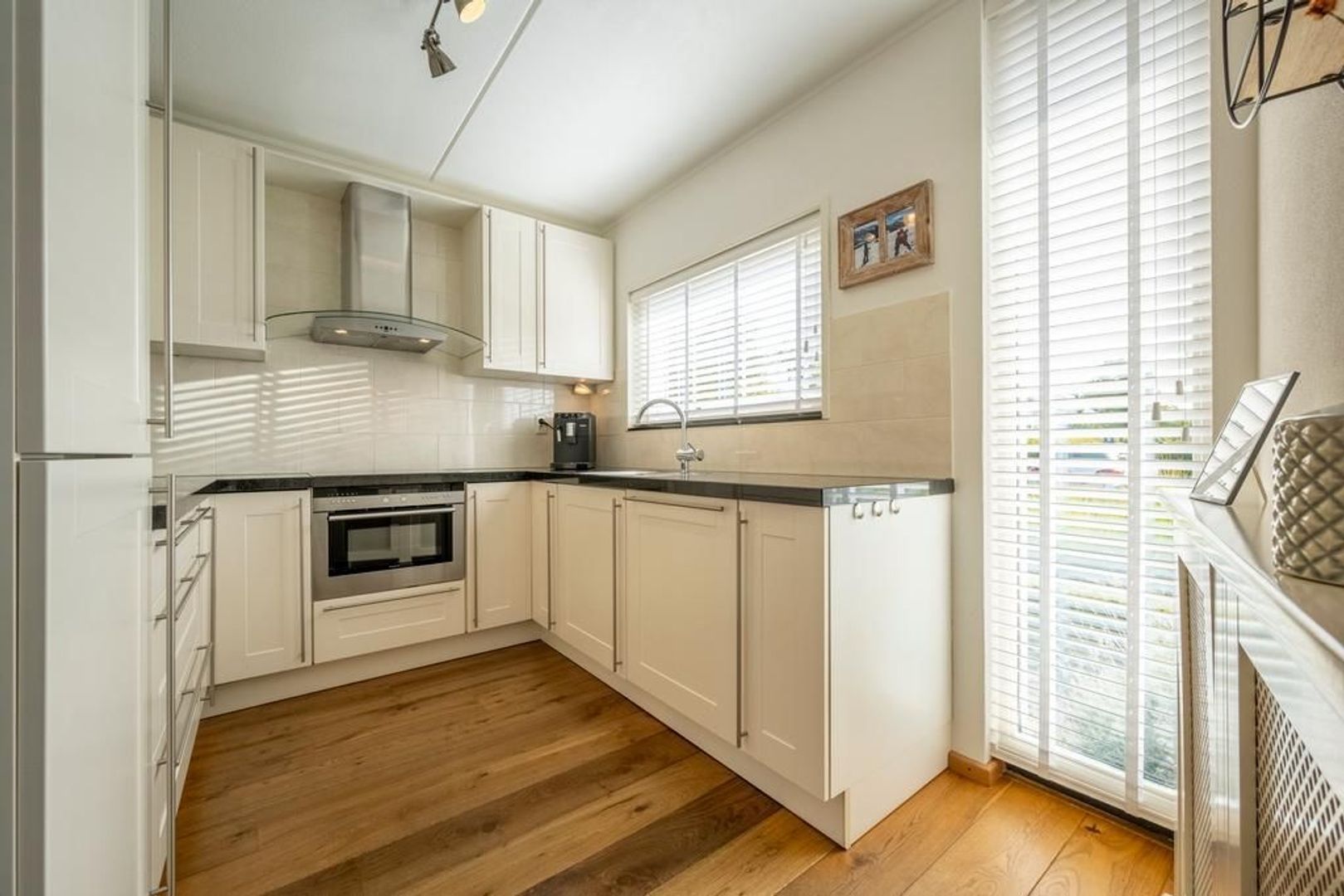 Halfopen keuken aan de straatzijde. Deze heeft een U-vormige inrichting en is uitgevoerd met een granieten aanrechtblad, combi-oven, keramische kookplaat, afzuigkap, vaatwasser(2021) en koel-vriescombinatie.