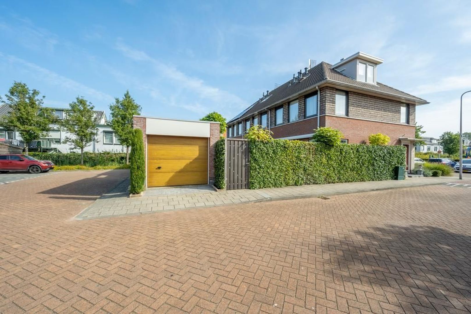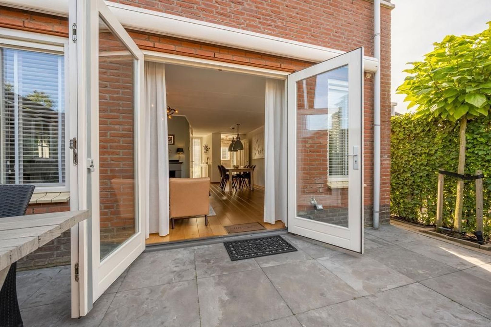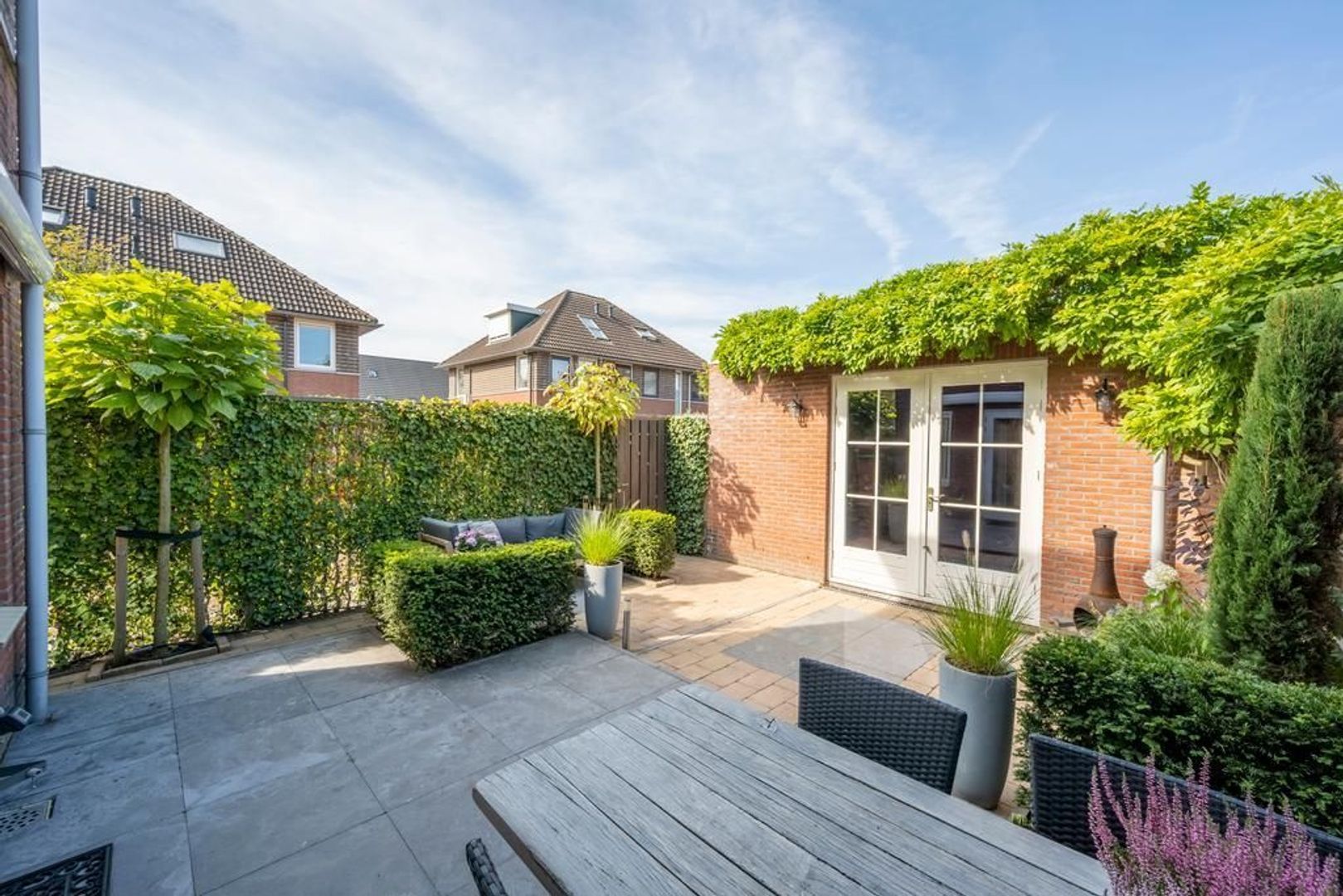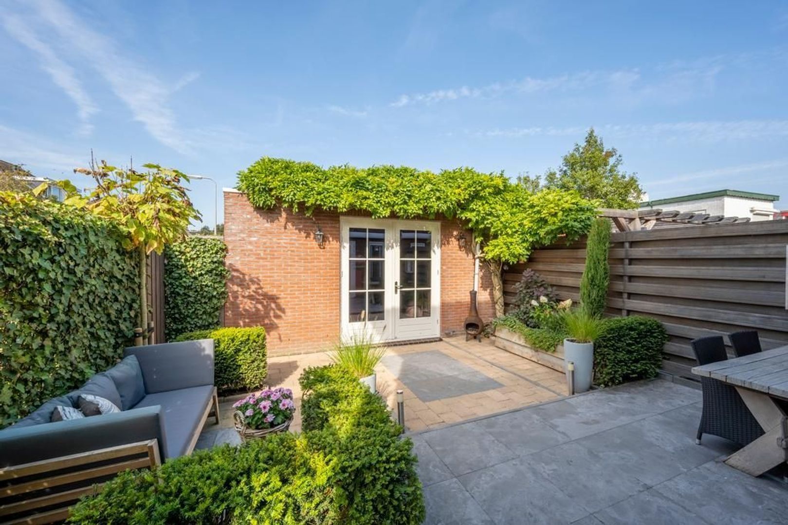 De garage staat overdwars in de achtertuin. Deze heeft openslaande deuren in de zijgevel, wat een gezellige aanblik biedt.