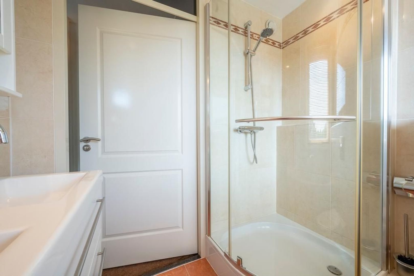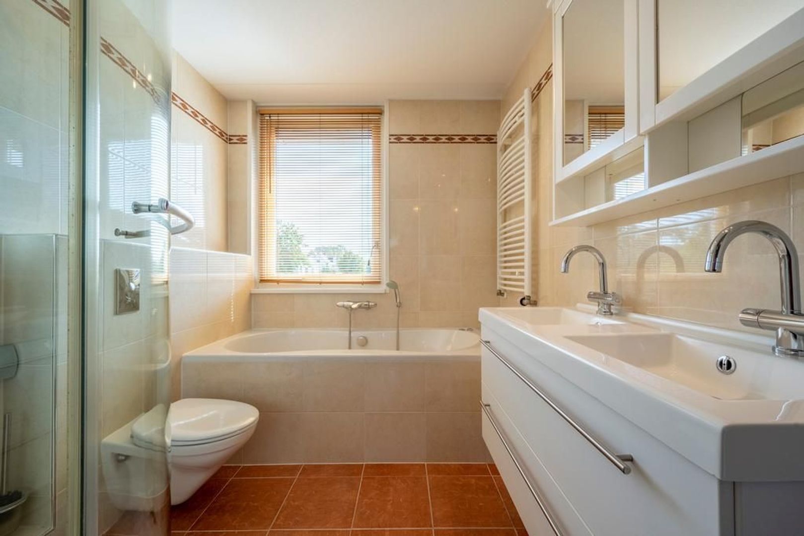 Op de eerste verdieping zijn drie slaapkamers, waarvan twee met vaste kasten en airconditioning. De nette badkamer is ingericht met een wandcloset, douchecabine, dubbel wastafelmeubel en een ligbad met jet streams.
