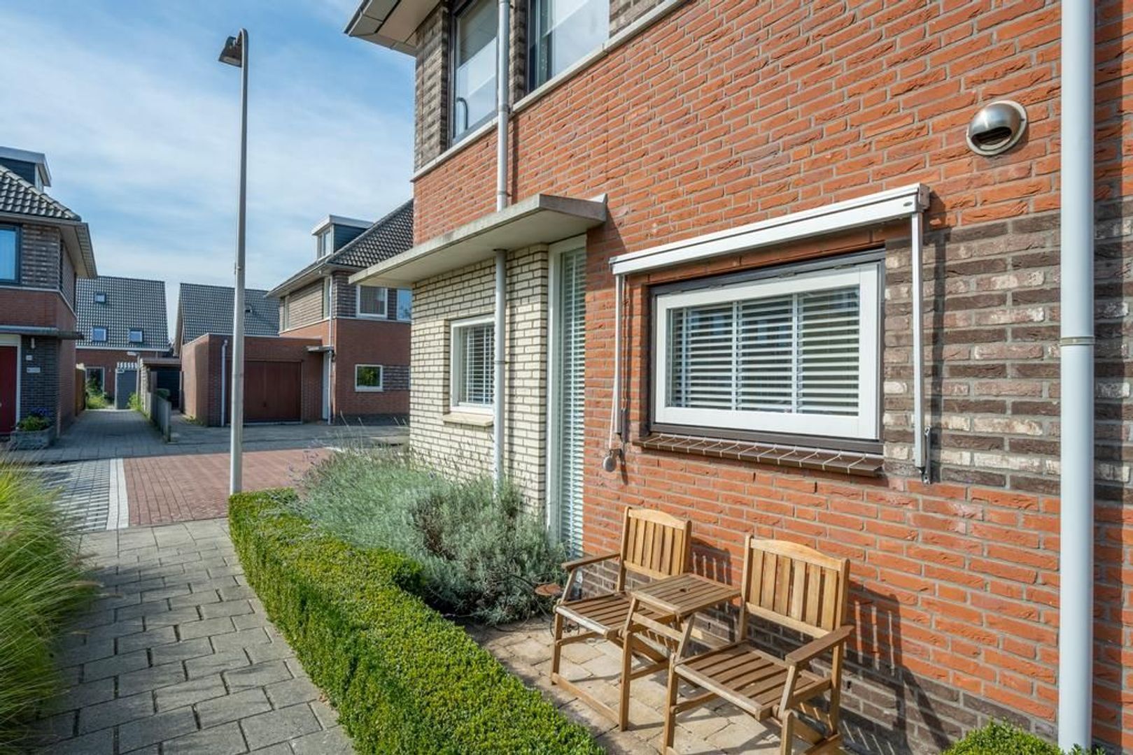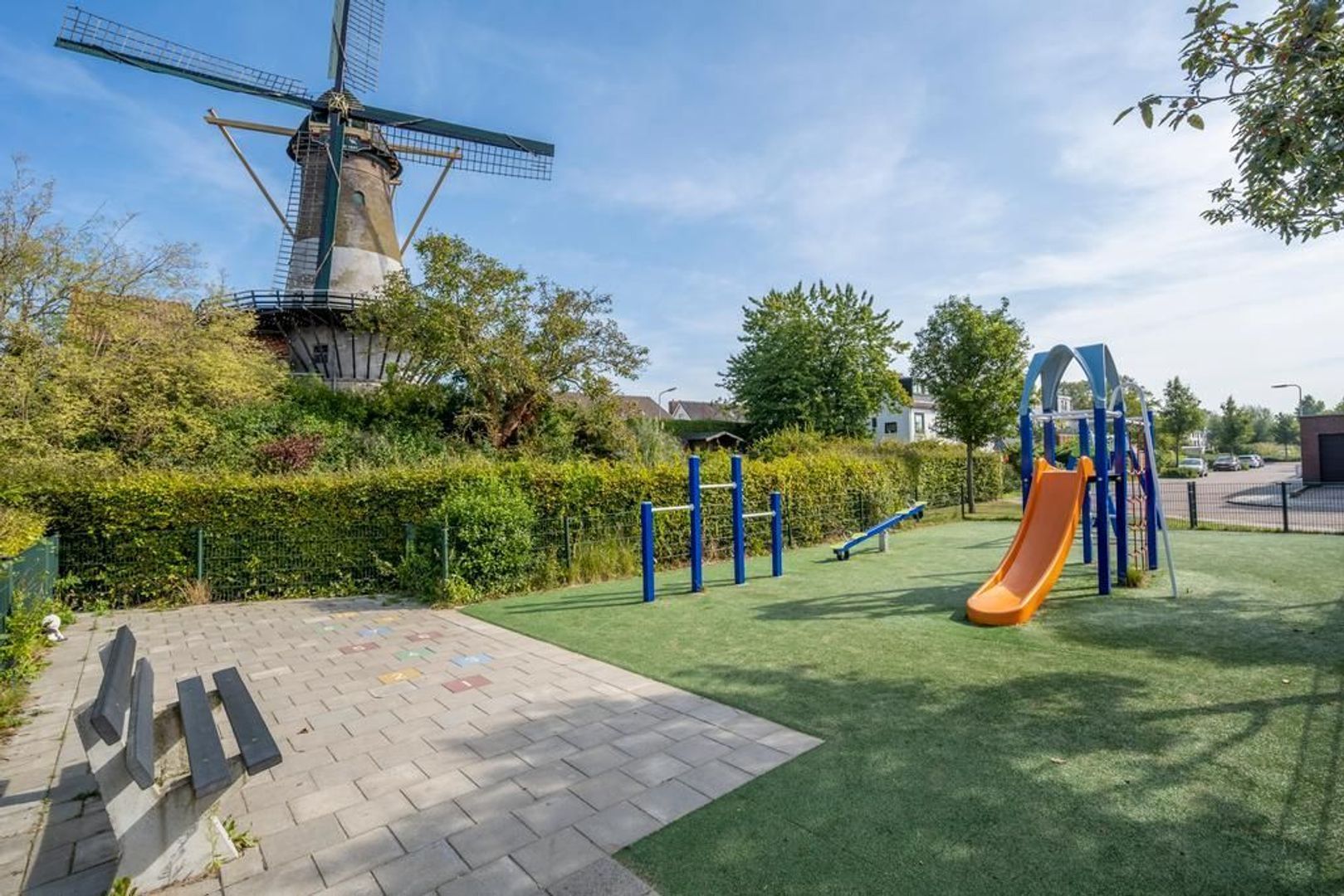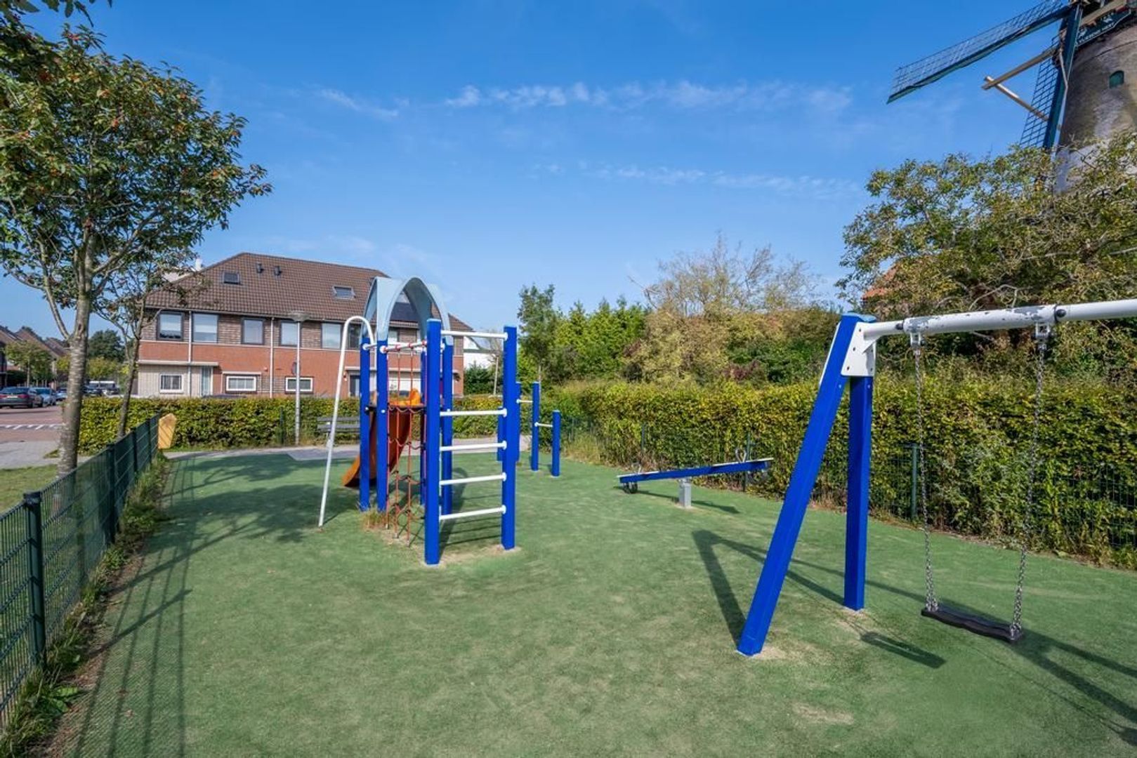 Voor het huis ligt nog een stuk grond, genoeg voor een zitje om te genieten in de ochtendzon met uitzicht op de molen en speeltuin.