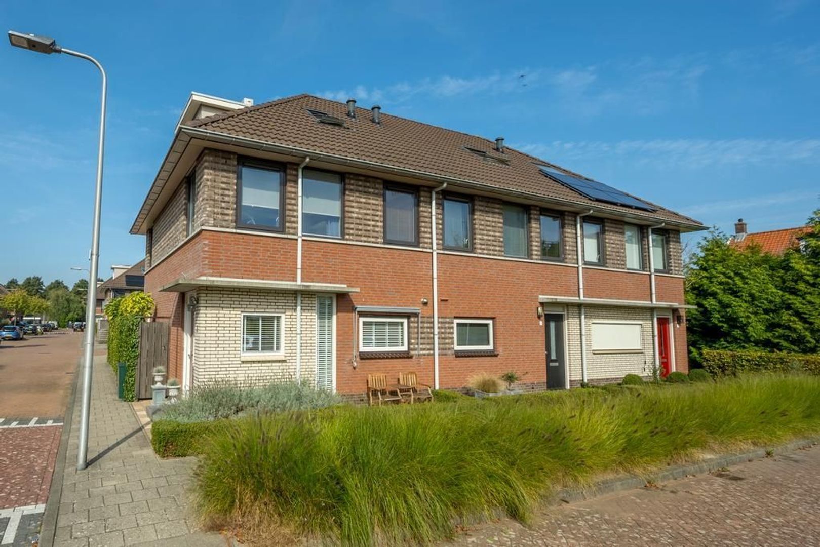 Aan de achtergevel is een elektrisch zonnescherm bevestigd.