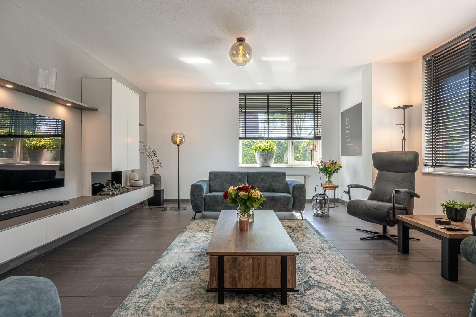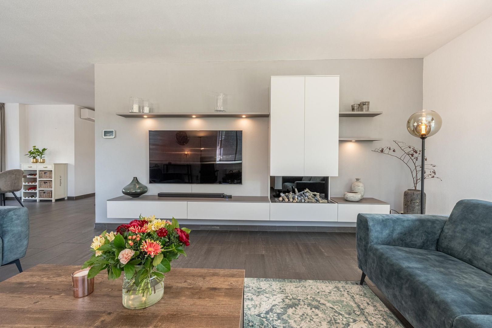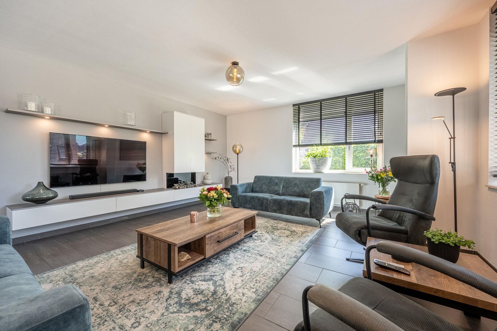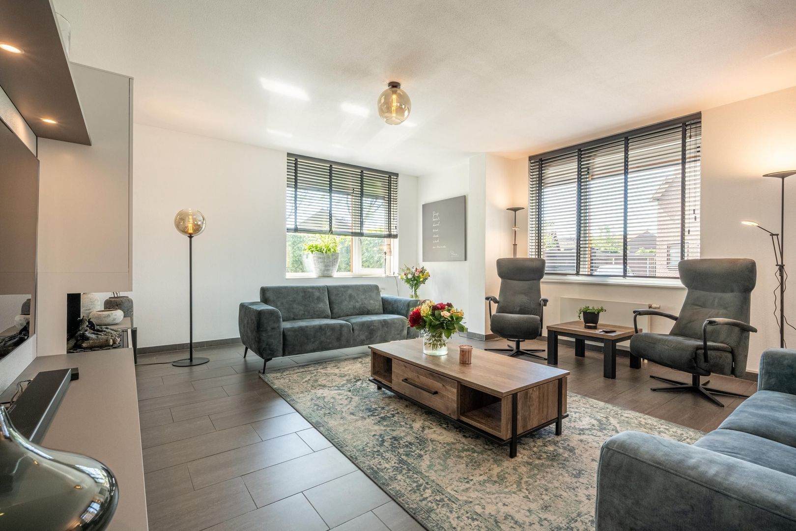 Mooie lichte leefruimte bestaande uit de woonkamer, eetgedeelte met erker en open keuken. In het zitgedeelte zorgt de haard voor sfeer. Het wandmeubel blijft tevens achter.