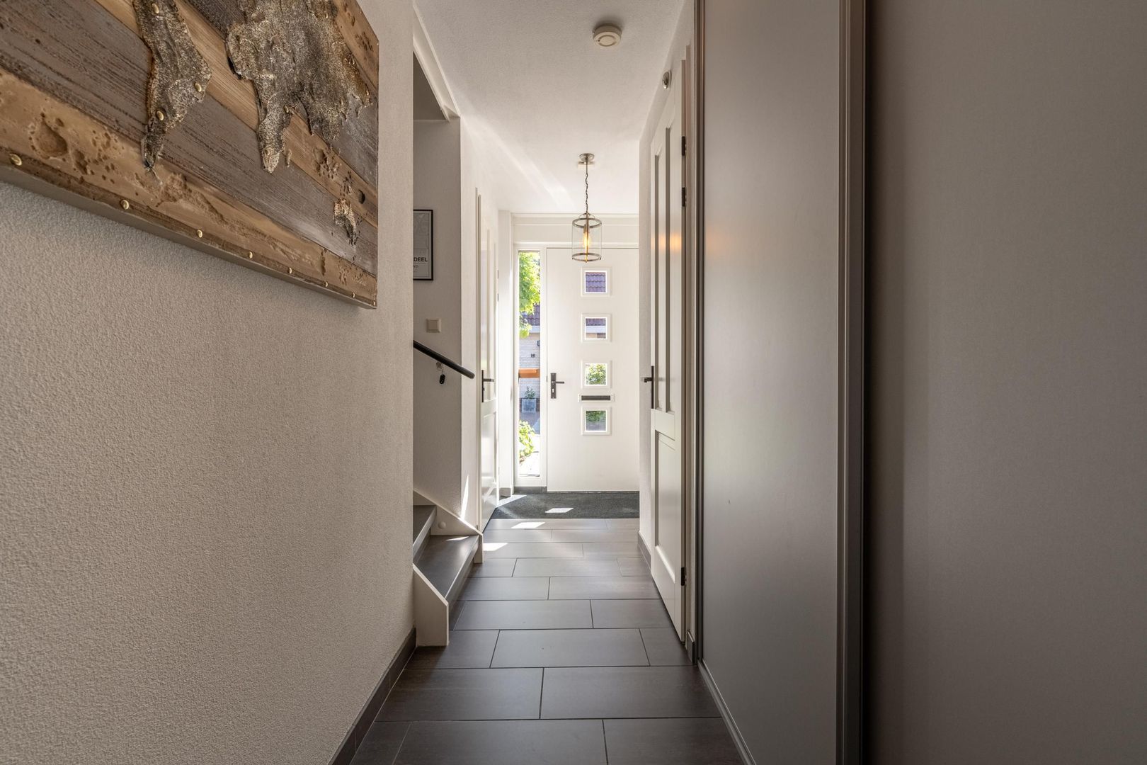 Entree, hal met garderoberuimte, toiletruimte en trapopgang.