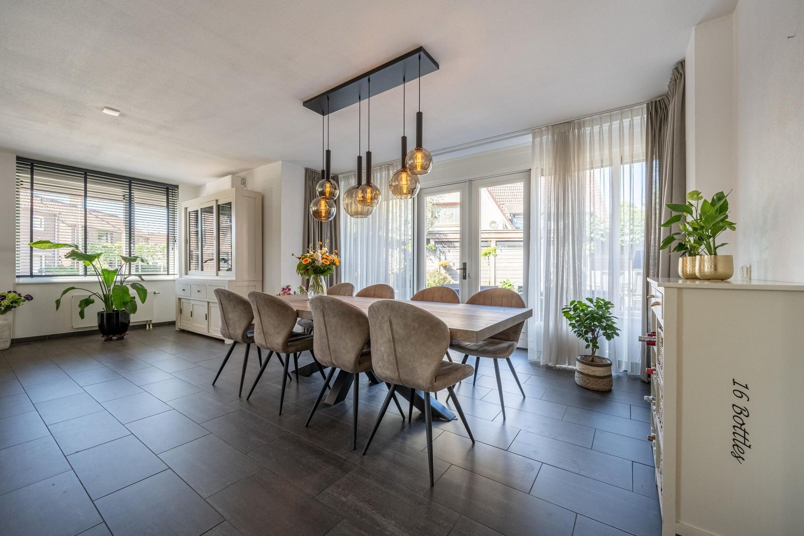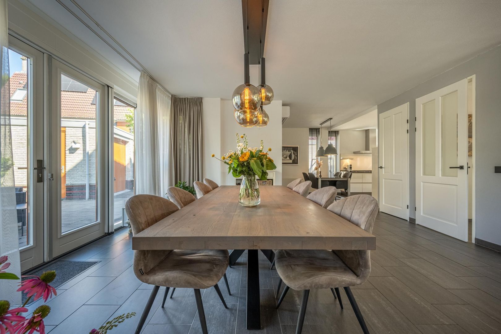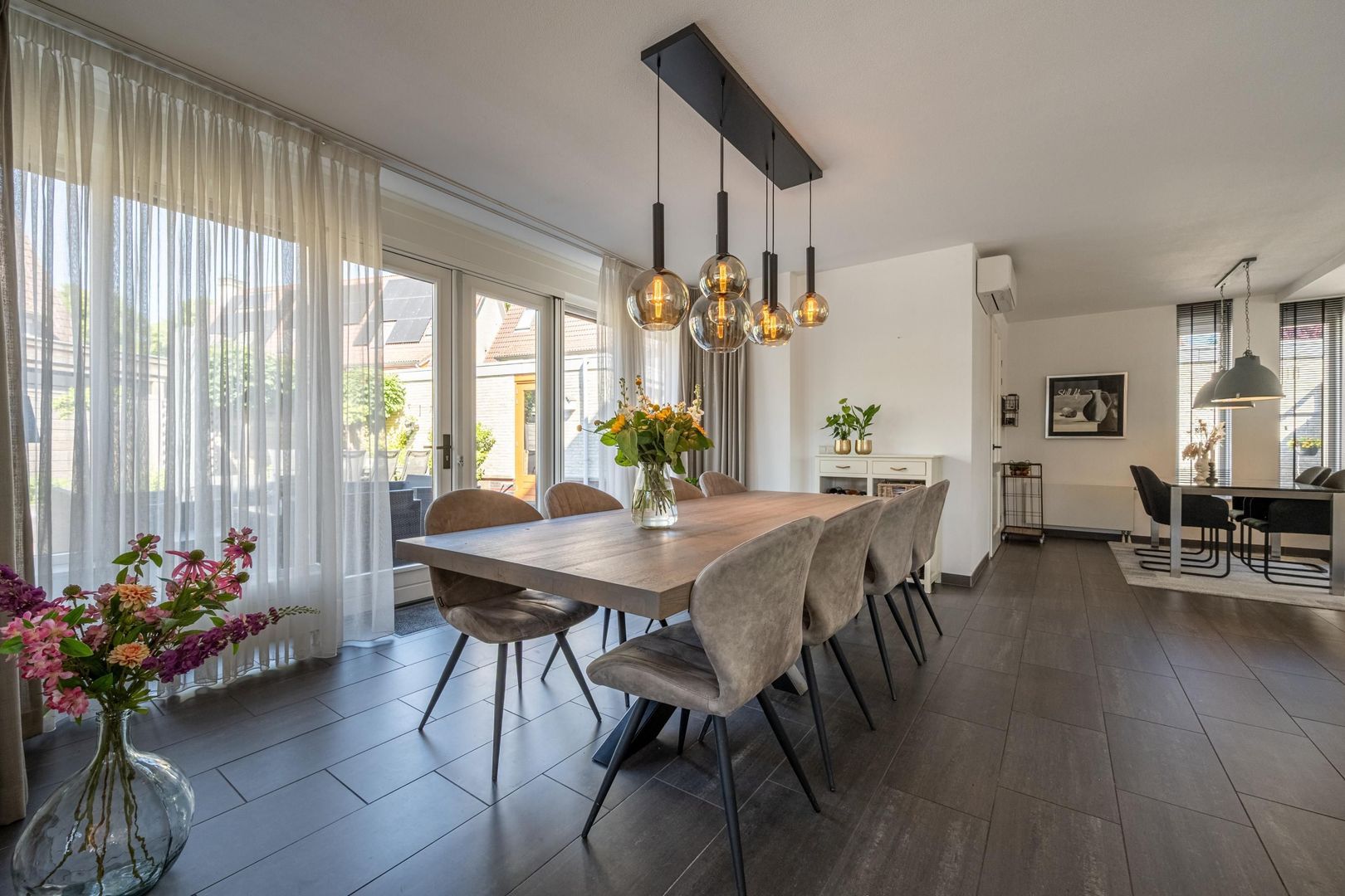 De erker grenst aan de tuin en heeft openslaande deuren naar het terras.