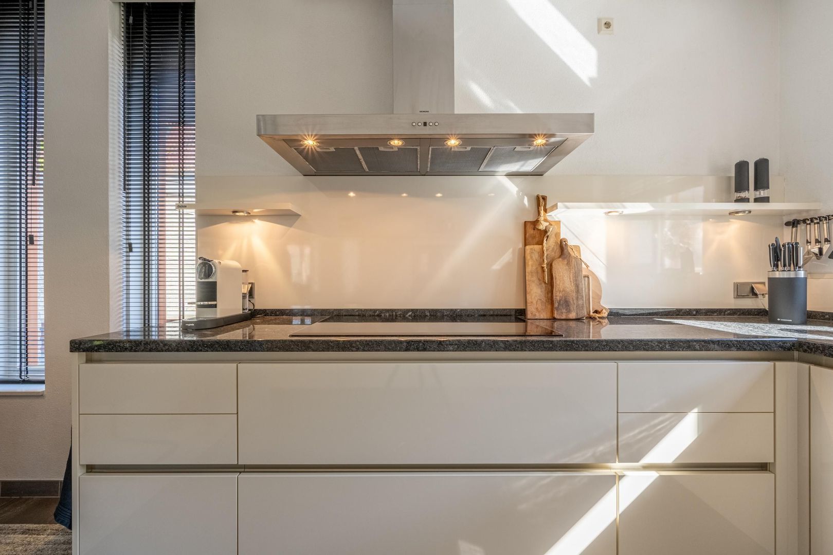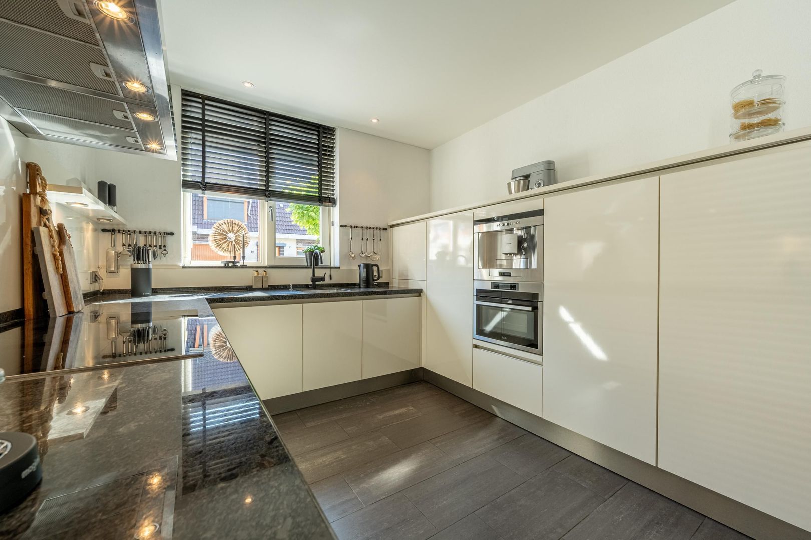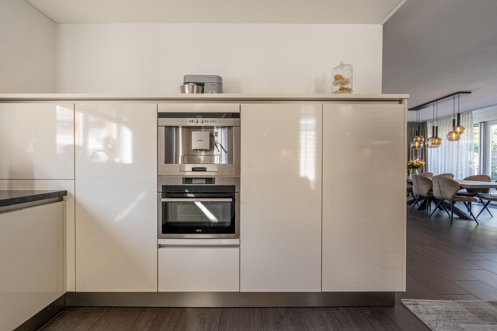 De keukeninrichting is tijdloos en opgesteld in een U-vorm met natuurstenen aanrechtblad en complete inbouwapparatuur, waaronder een koffiemachine.