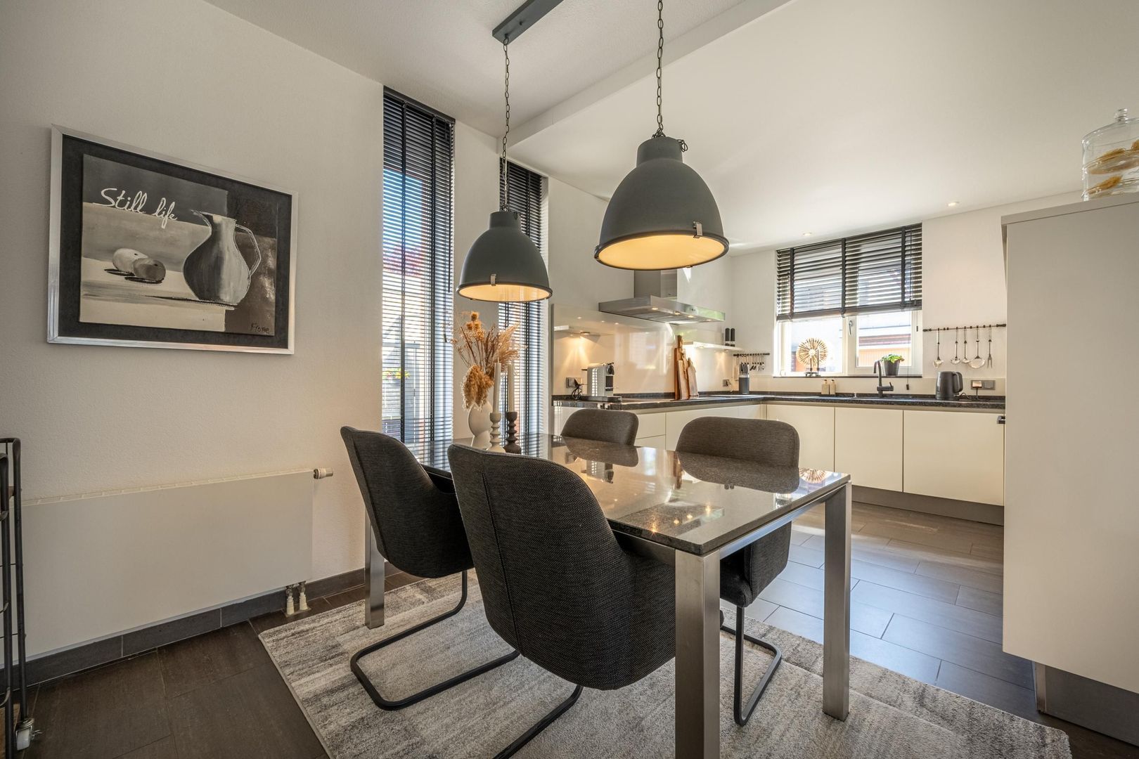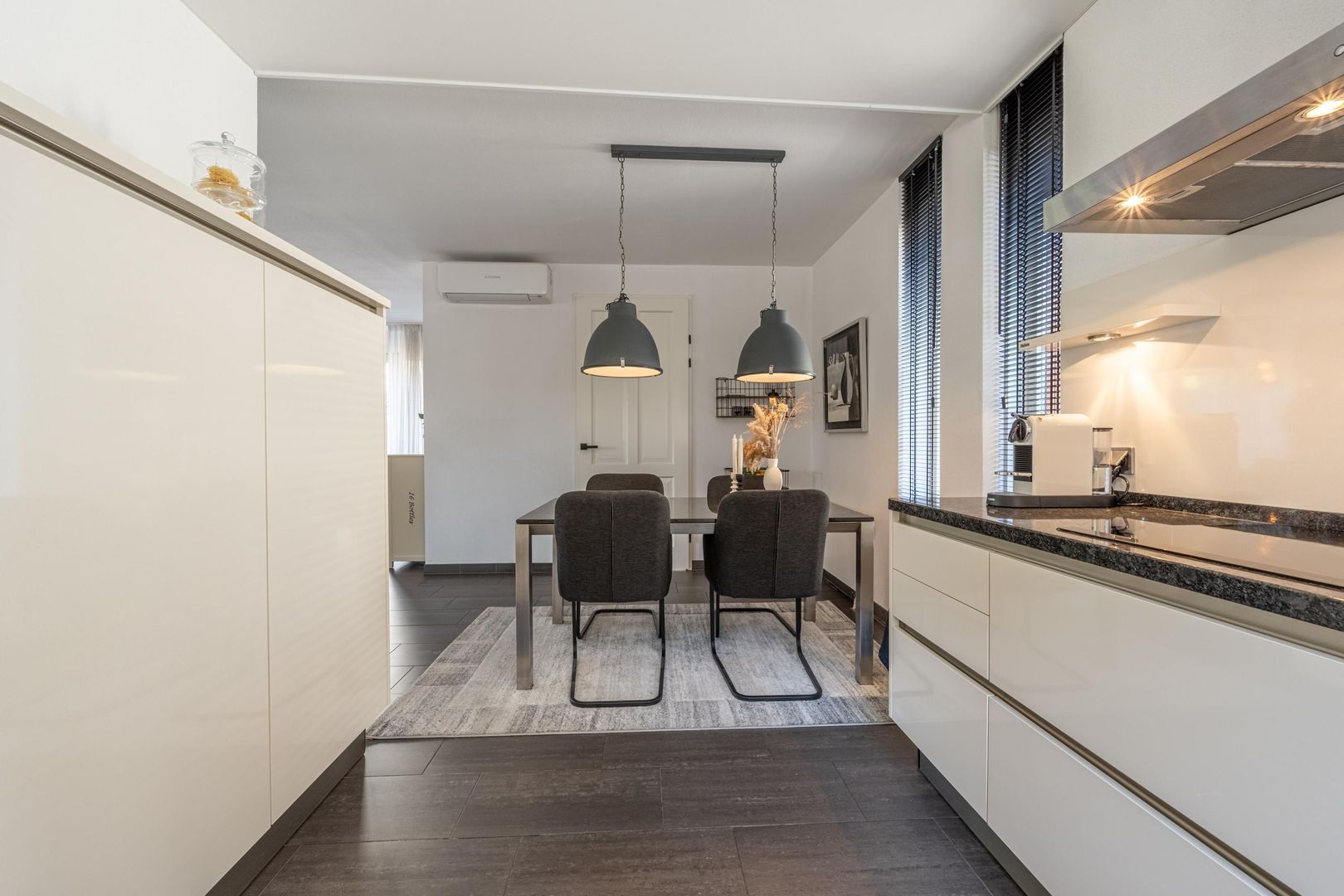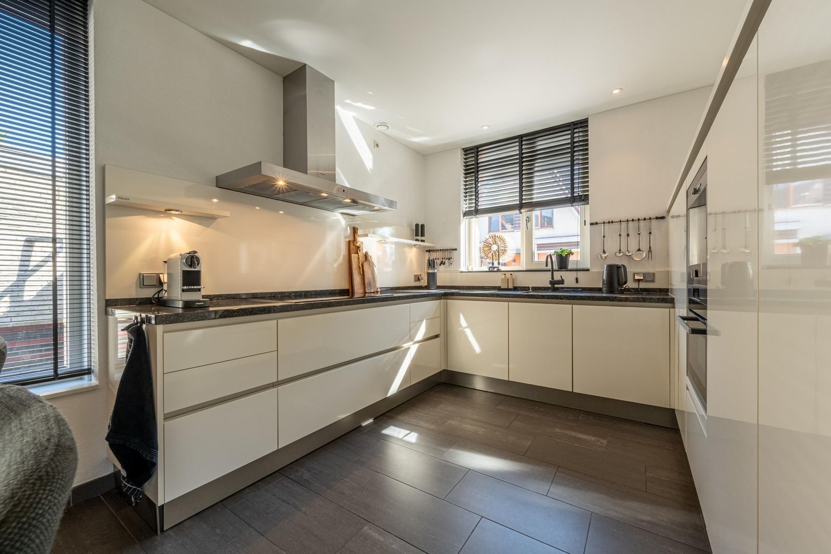 De keukeninrichting is tijdloos en opgesteld in een U-vorm met natuurstenen aanrechtblad en complete inbouwapparatuur, waaronder een koffiemachine.
