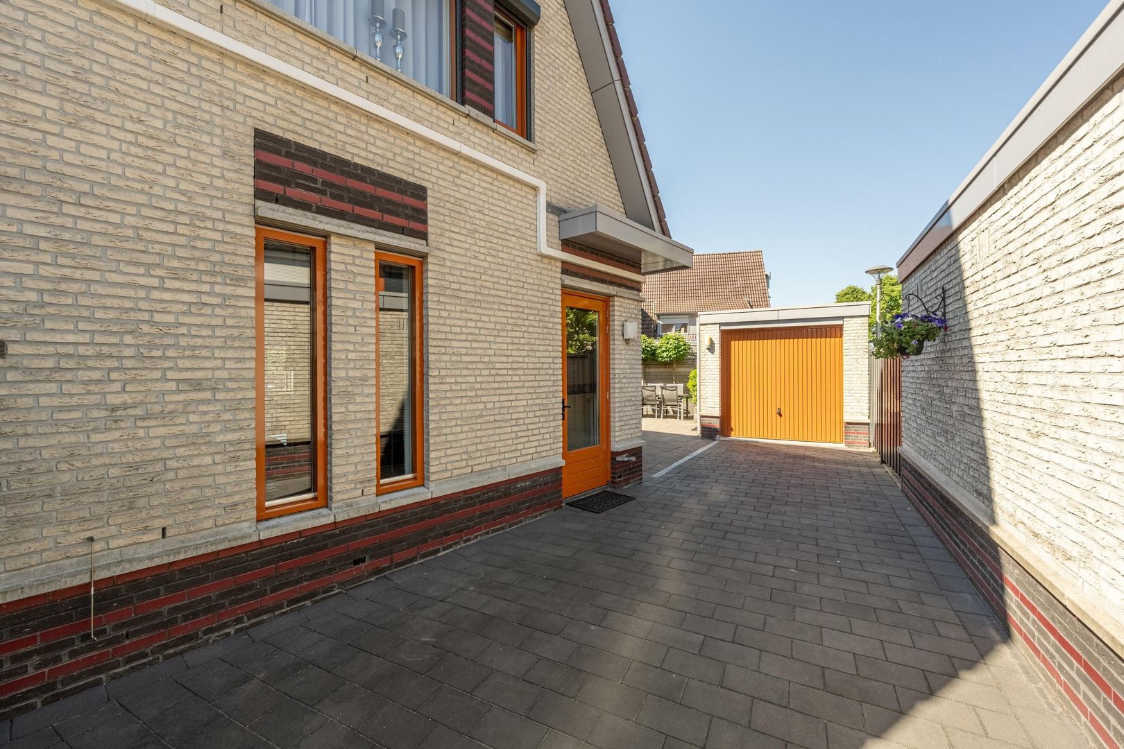 De garage staat achterop het perceel. Op de oprit is ruimte om meerdere auto's op eigen terrein te parkeren.