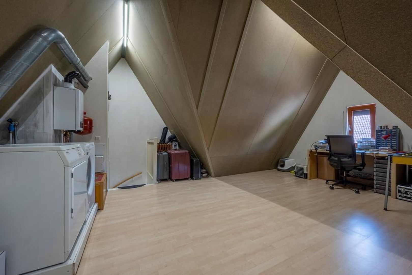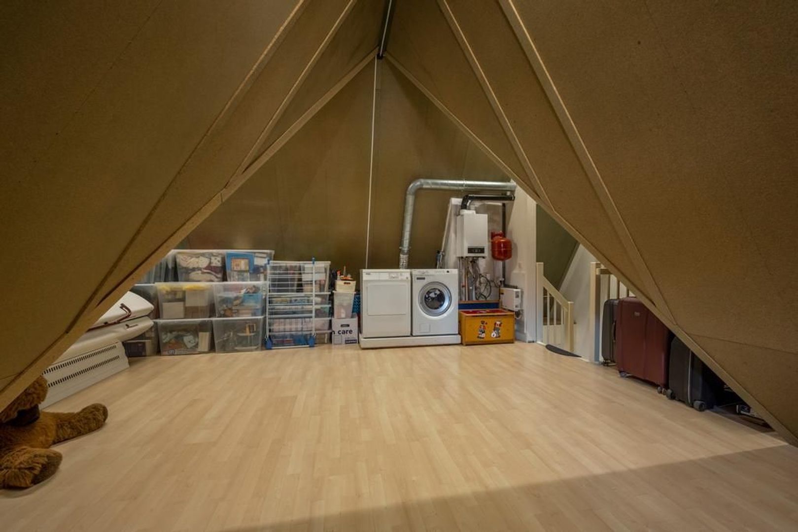 De tweede verdieping is afgewerkt met een laminaatvloer en spachtelputz wanden. De tweede verdieping bestaat uit een grote open ruimte (in een t-vorm) waar de aansluitingen zijn voor de wasmachine, cv (Nefit 2021) mechanische ventilatie en de omvormer voor de zonnepanelen.