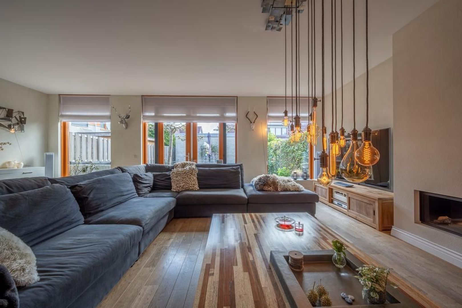 Tuingerichte woonkamer met brede gashaard (met afstandsbediening) en openslaande deuren naar de tuin.