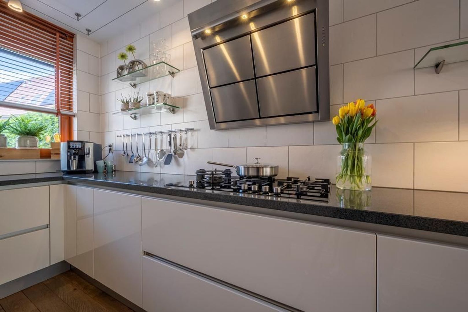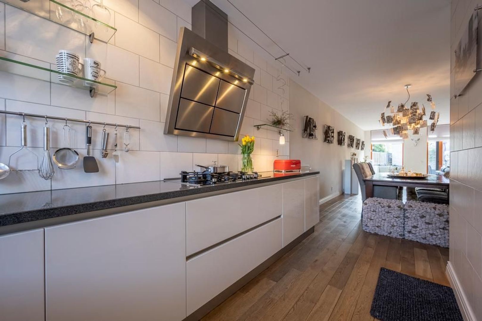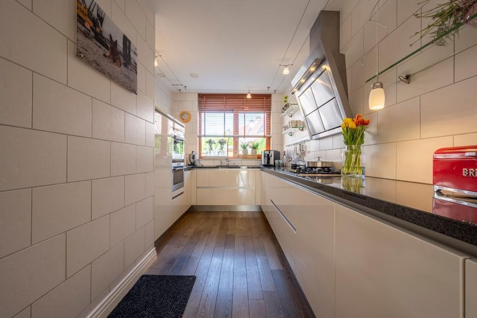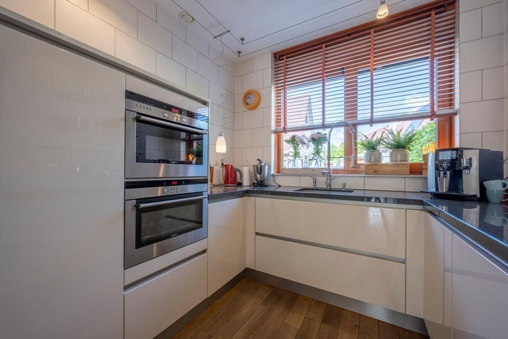 De keuken ligt aan de voorkant van het huis. Deze is greeploos uitgevoerd, met een natuurstenen aanrechtblad en voorzien van een vijfpits gaskookplaat, afzuigkap, vaatwasser, combi-magnetron, oven en koelkast.