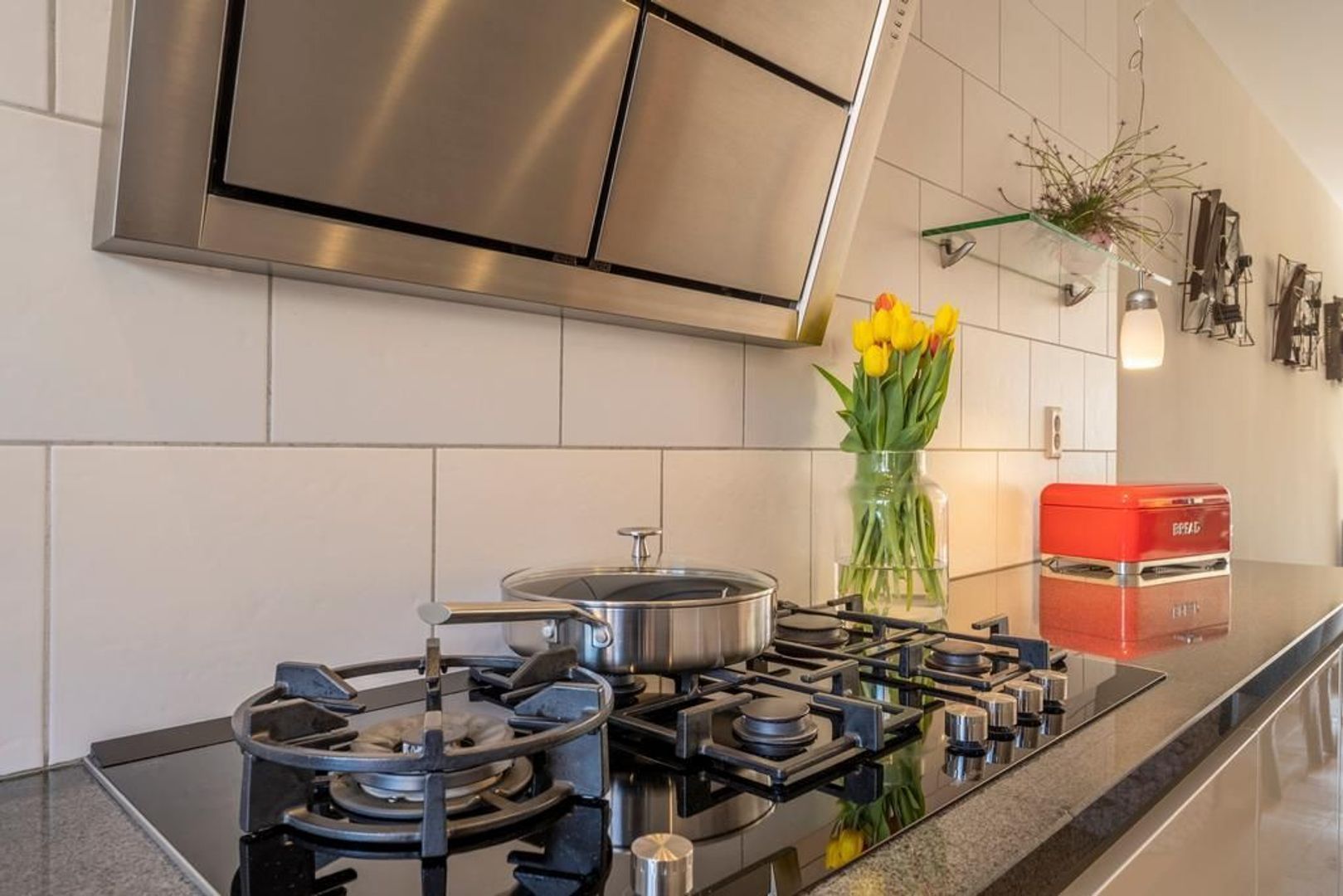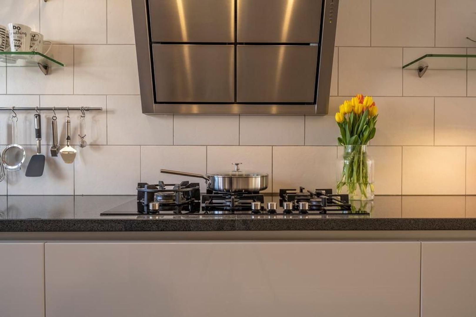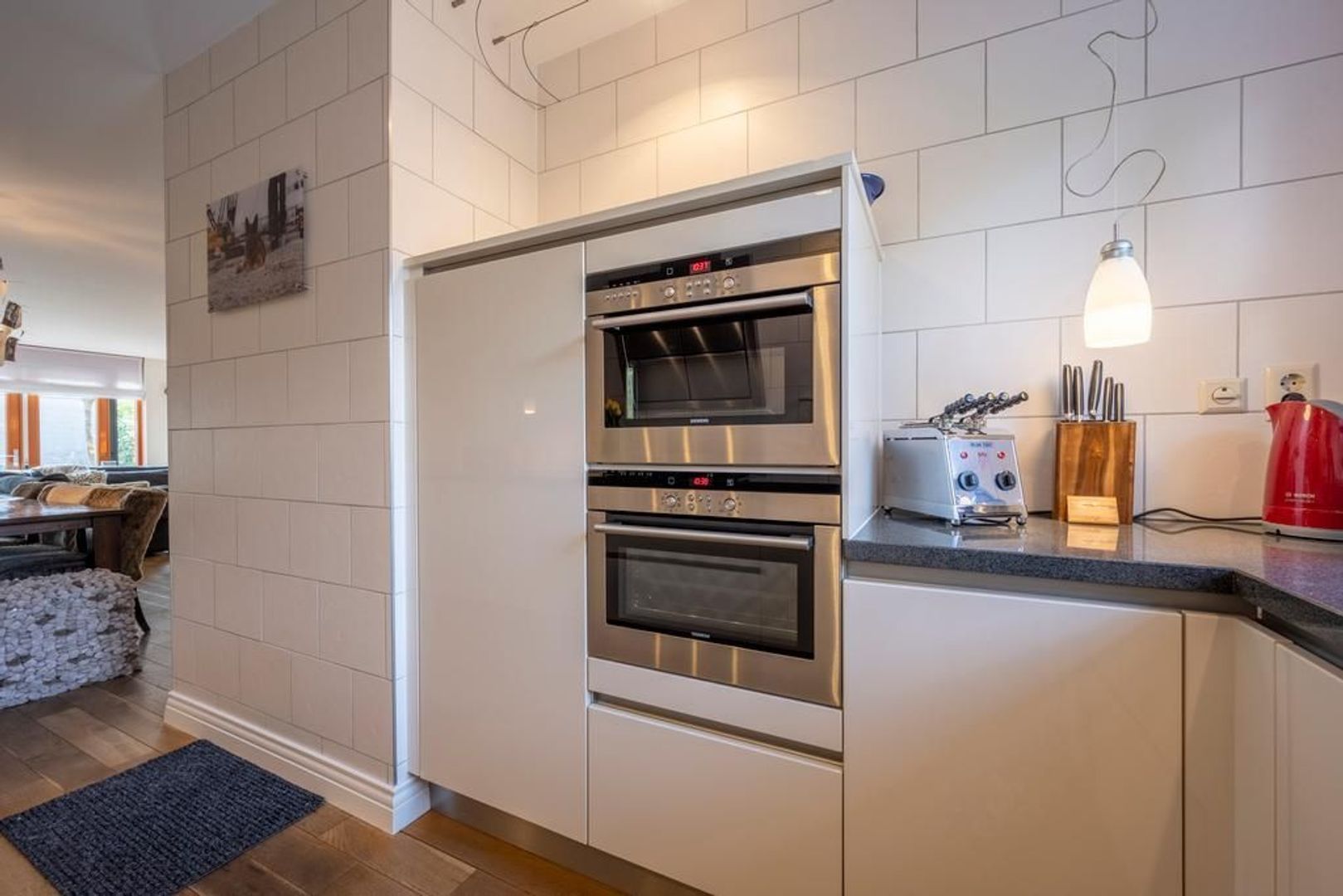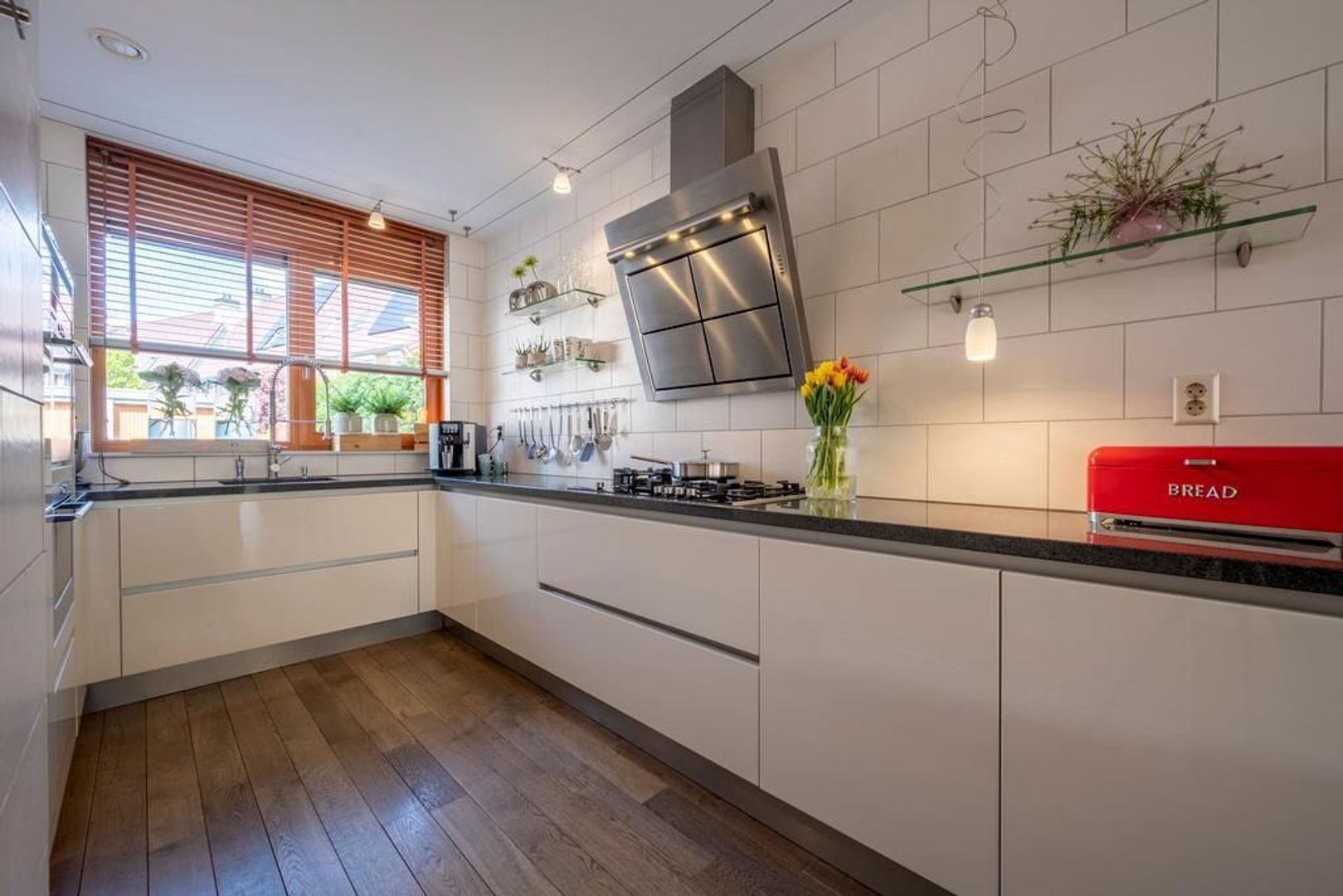 De keuken ligt aan de voorkant van het huis. Deze is greeploos uitgevoerd, met een natuurstenen aanrechtblad en voorzien van een vijfpits gaskookplaat, afzuigkap, vaatwasser, combi-magnetron, oven en koelkast.