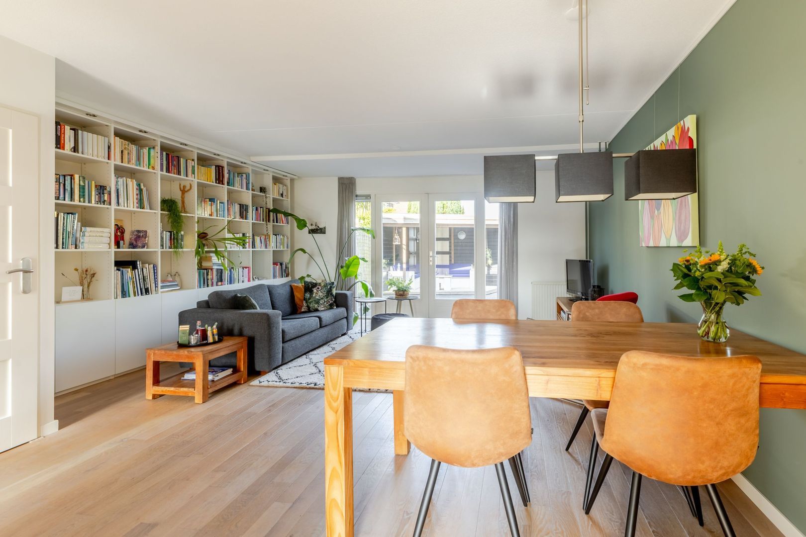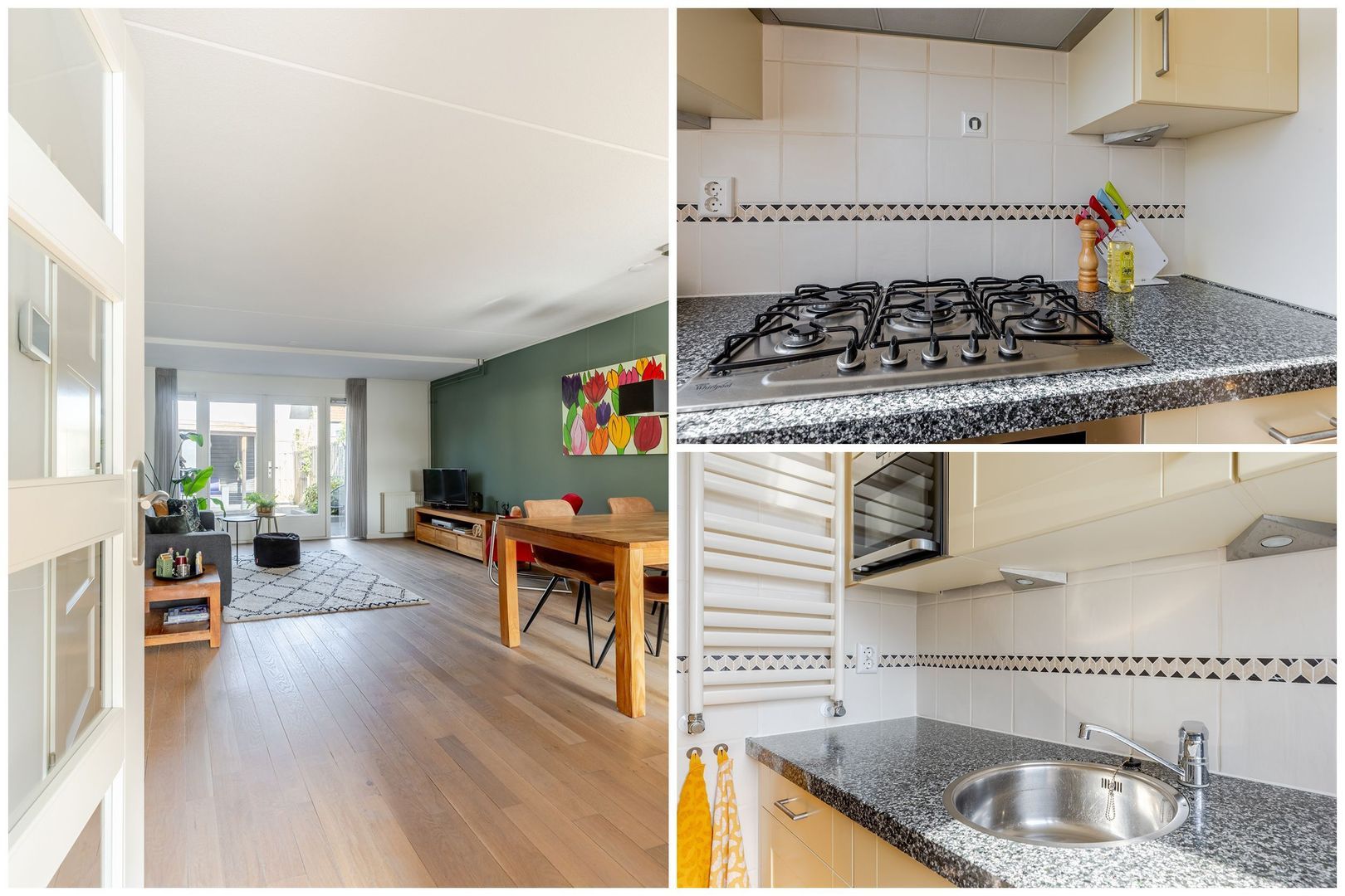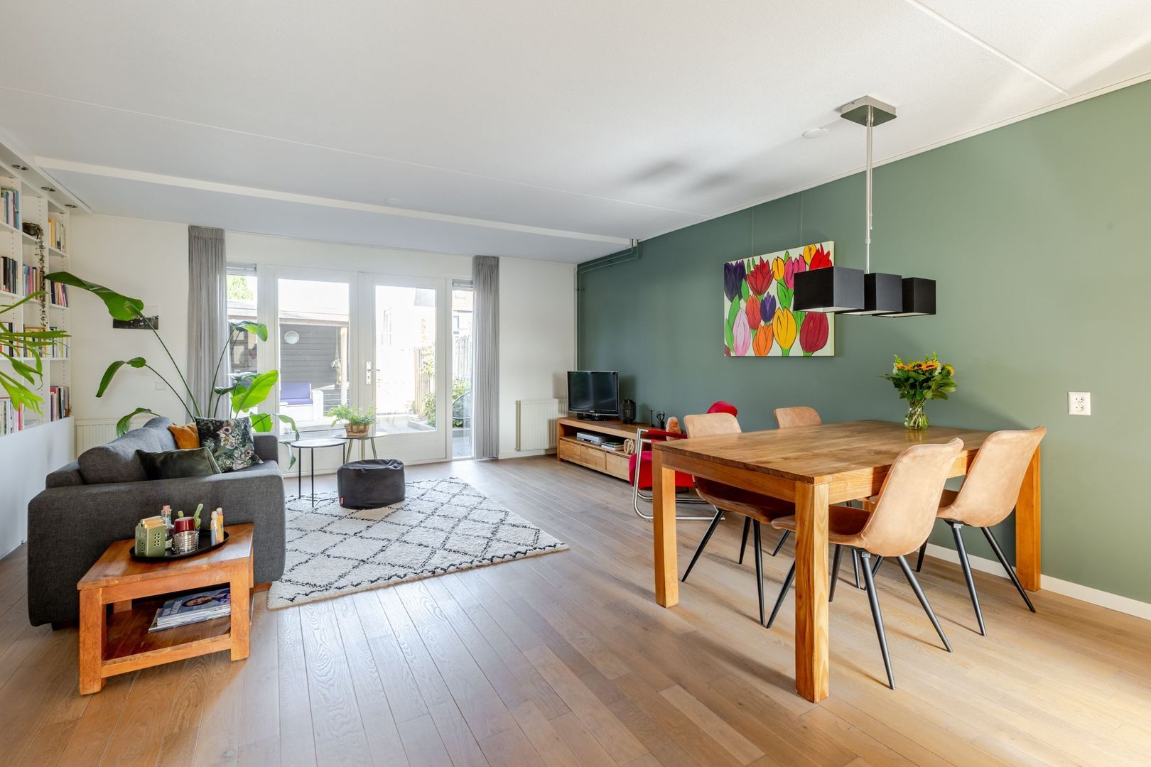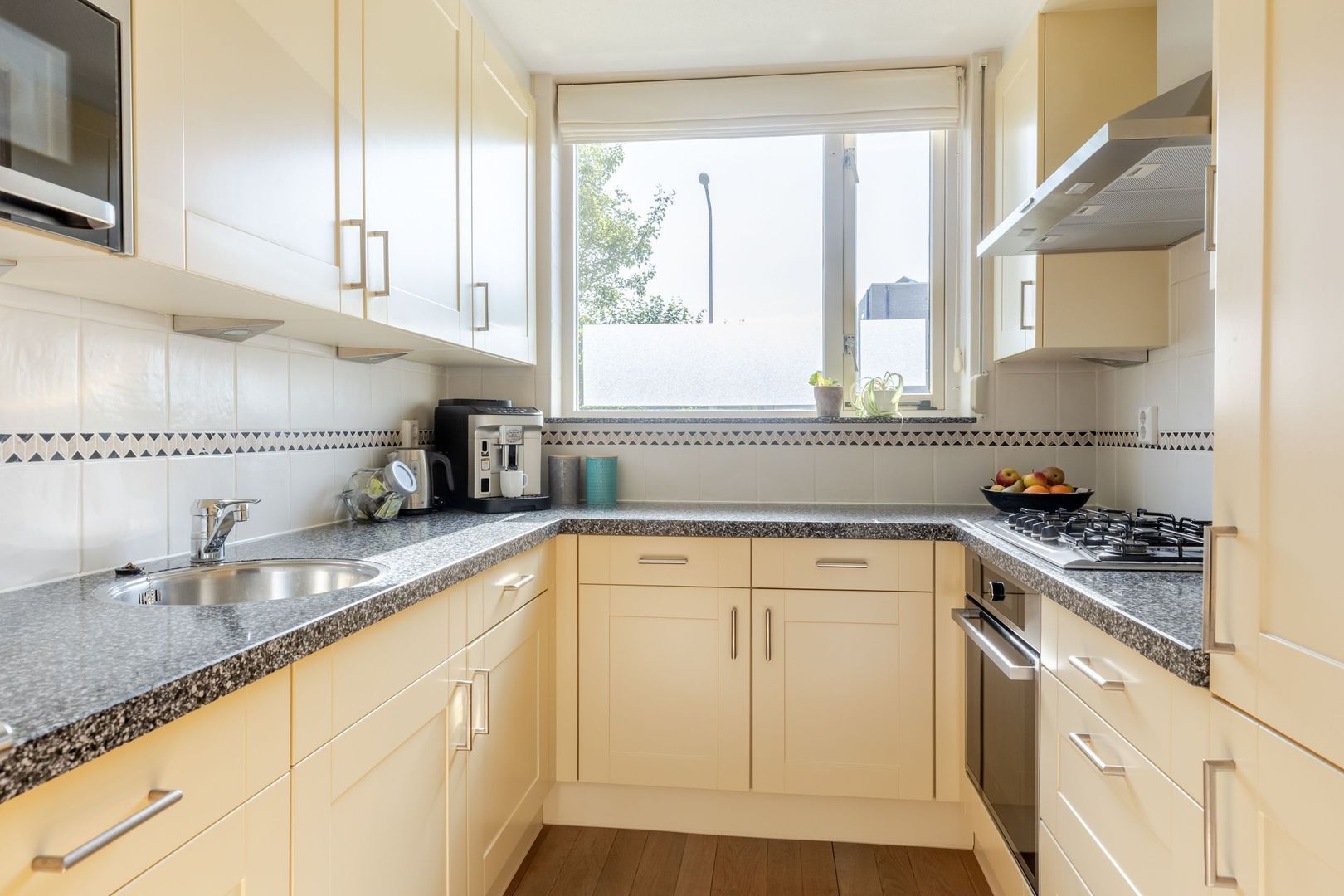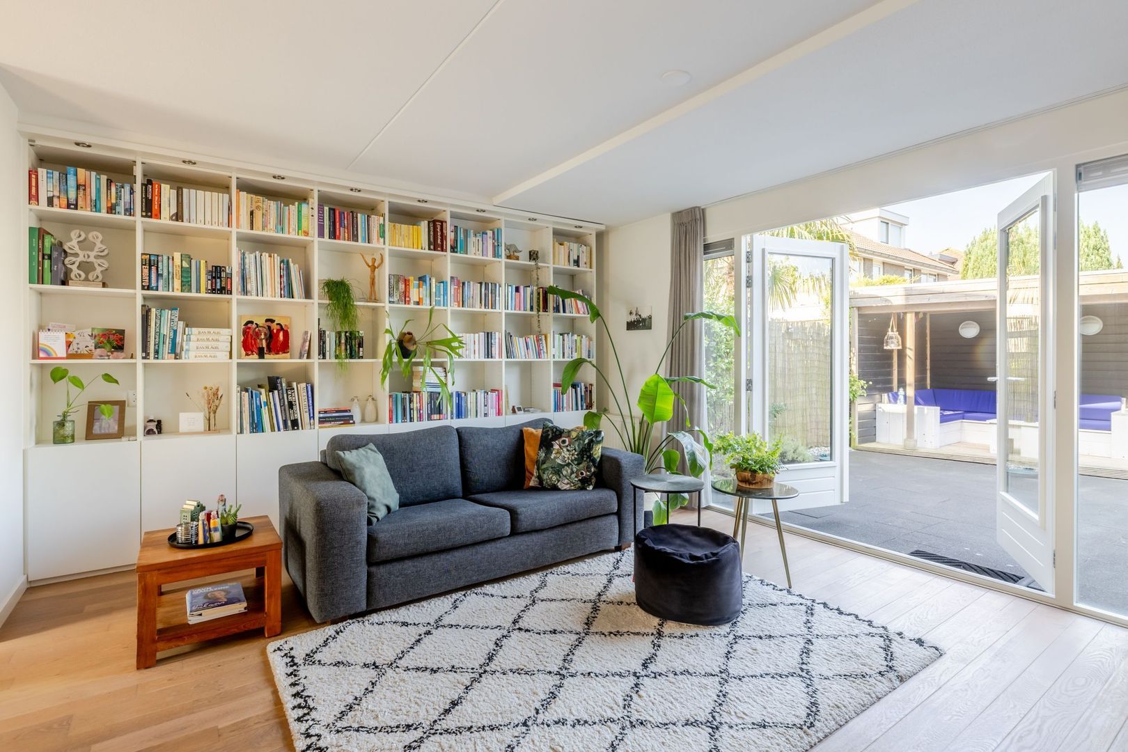 Bijzonder lichte tuingerichte woonkamer met een kastenwand en openslaande deuren naar het terras. De halfopen keuken bevindt zich aan de straatkant. Deze heeft een U-vormige inrichting en is uitgevoerd met veel kastruimte, een natuurstenen aanrechtblad en complete inbouwapparatuur.