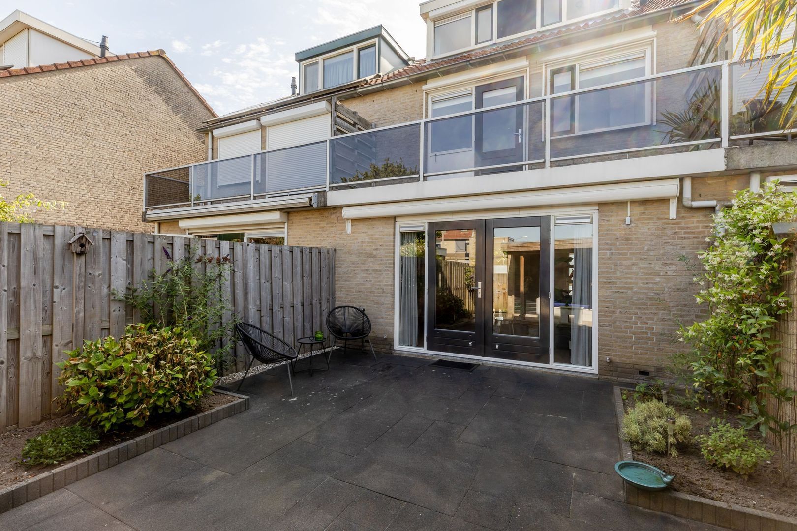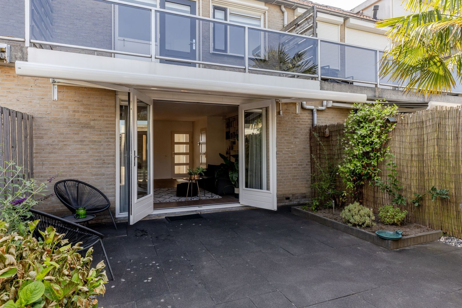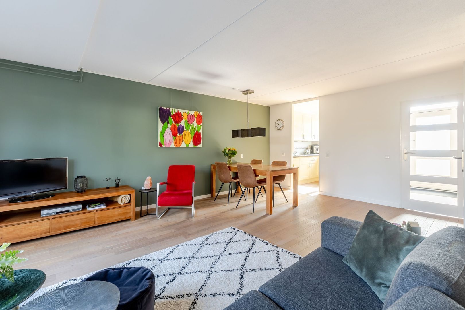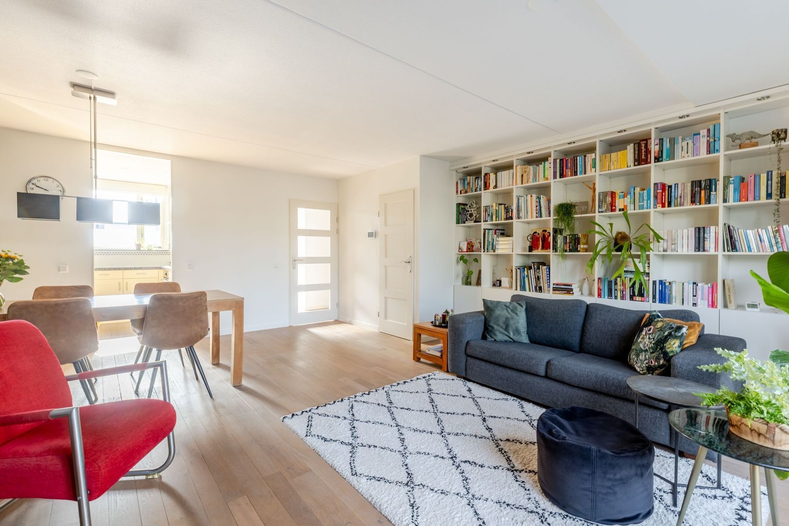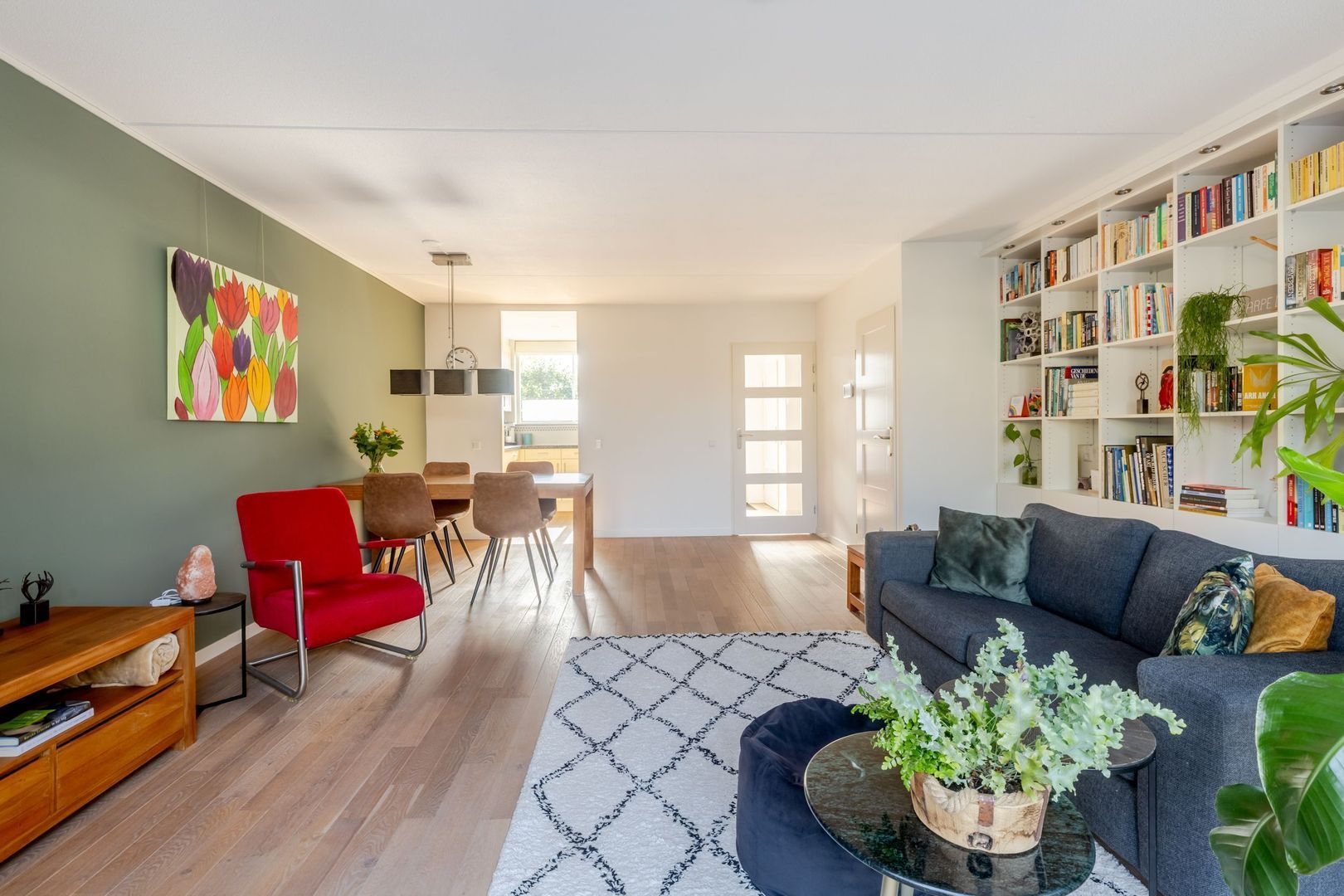 Bijzonder lichte tuingerichte woonkamer met een kastenwand en openslaande deuren naar het terras. De halfopen keuken bevindt zich aan de straatkant. Deze heeft een U-vormige inrichting en is uitgevoerd met veel kastruimte, een natuurstenen aanrechtblad en complete inbouwapparatuur.