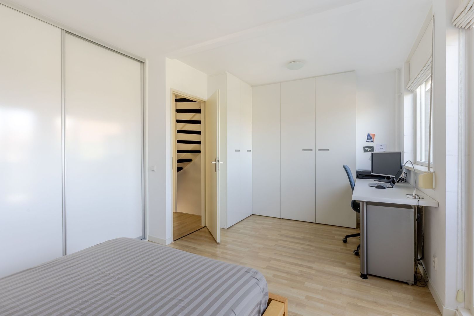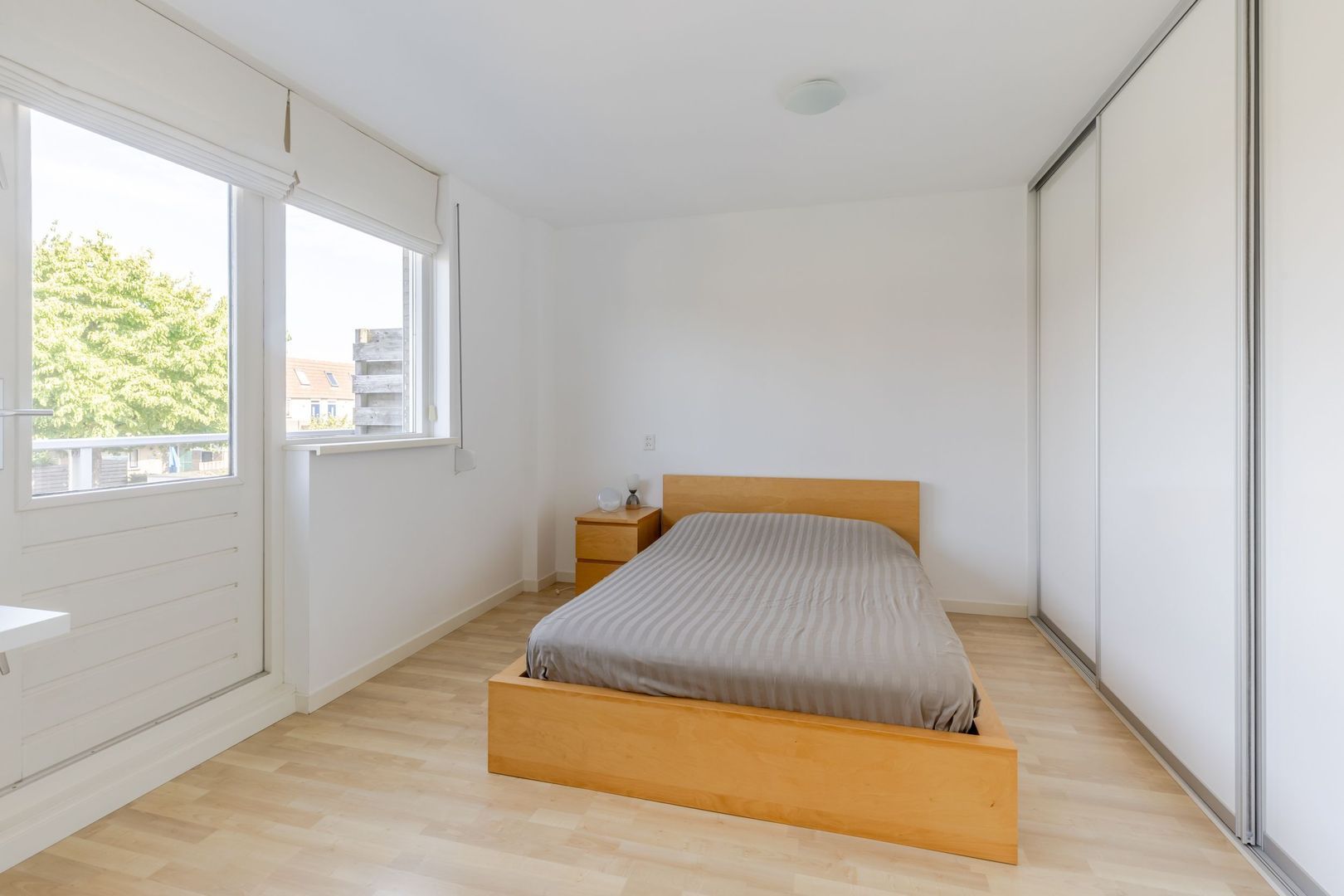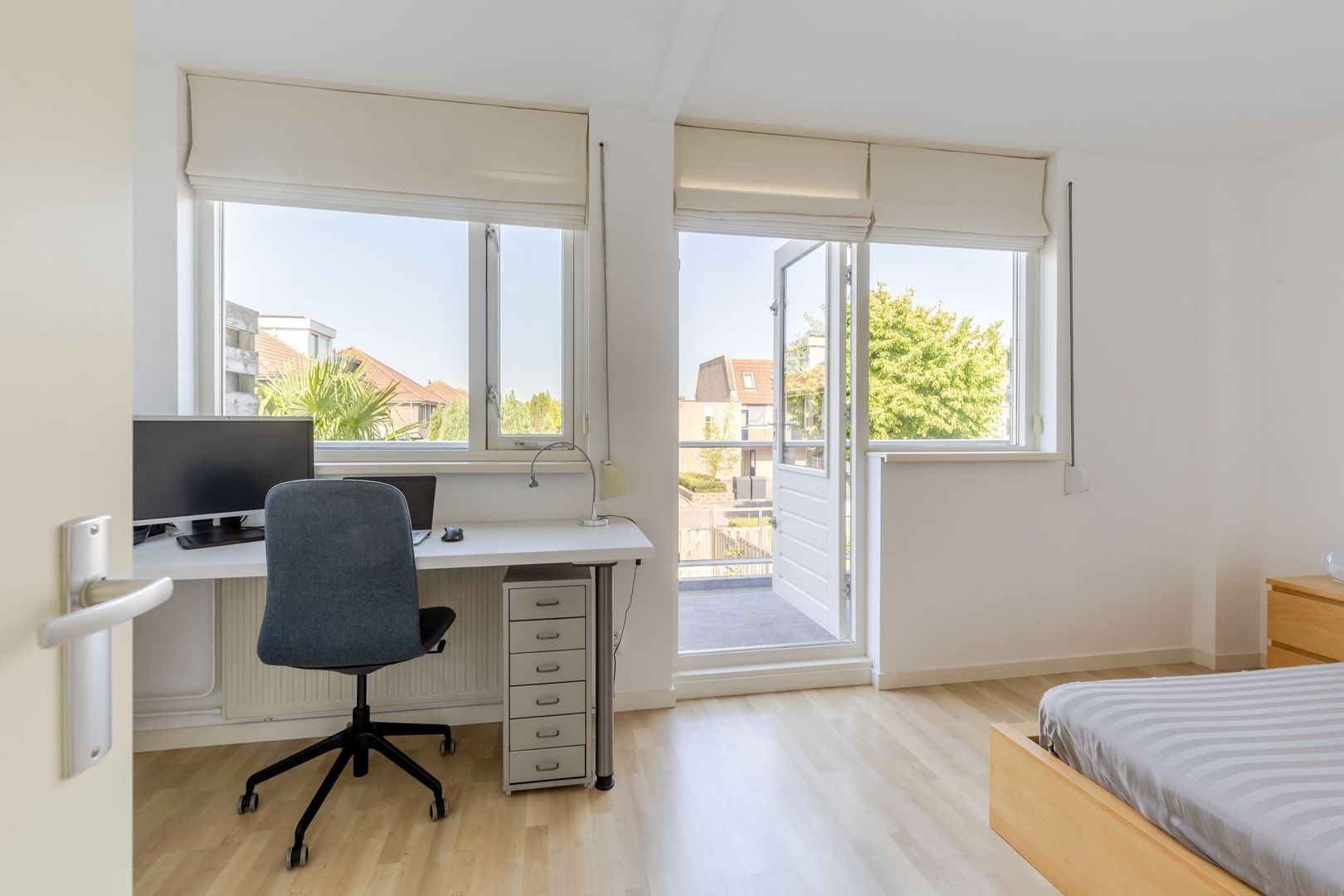 Op de eerste verdieping zijn de twee slaapkamers aan de achterkant samengevoegd tot één grote kamer. Deze is voorzien van twee kastenwanden en een vast bureau. Het balkon strekt zich uit over de gehele breedte van het huis.
