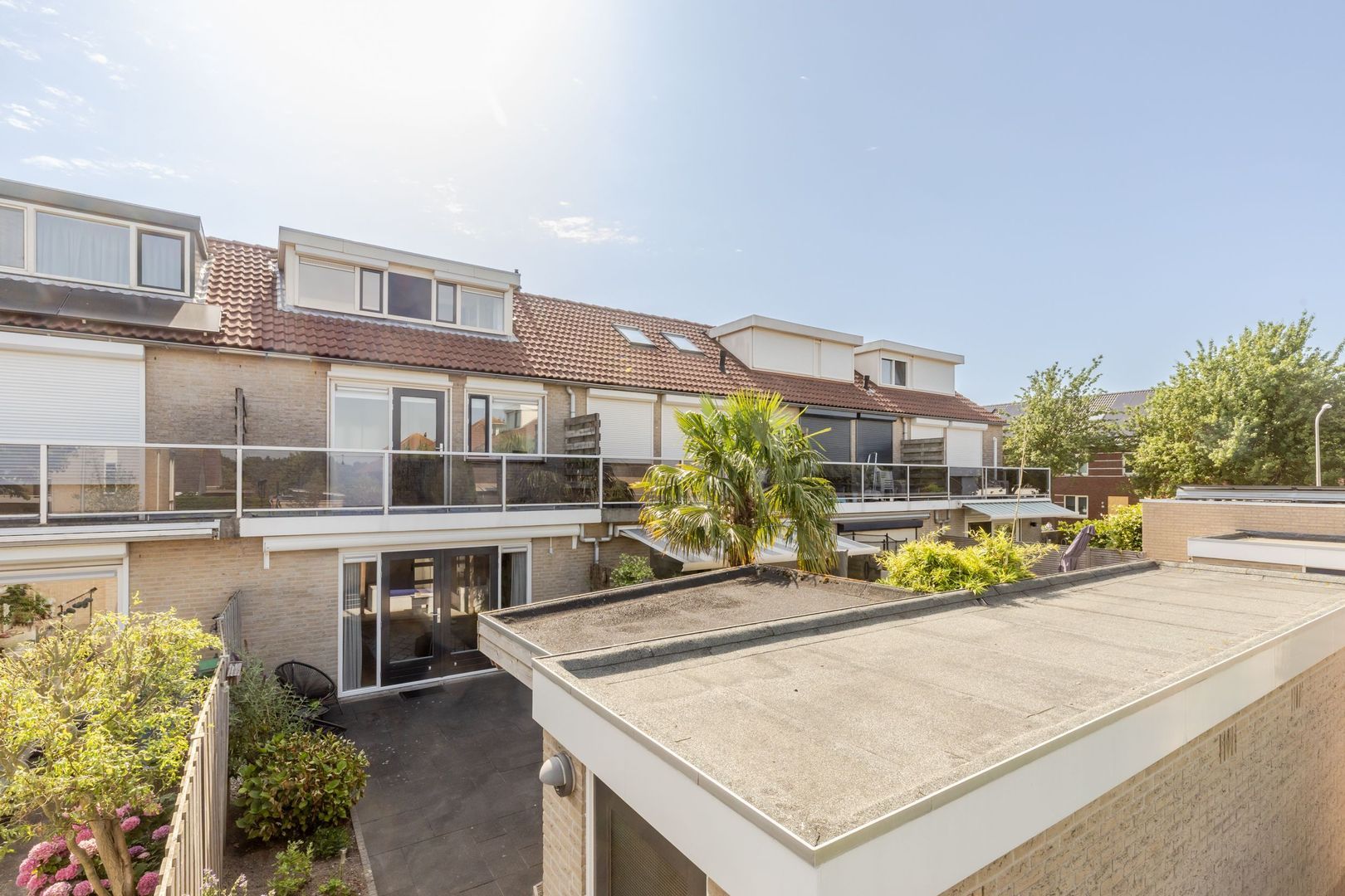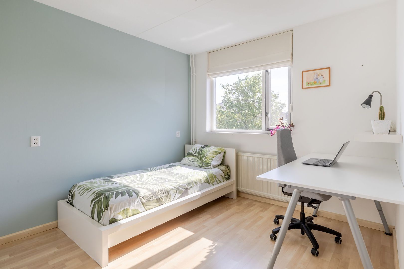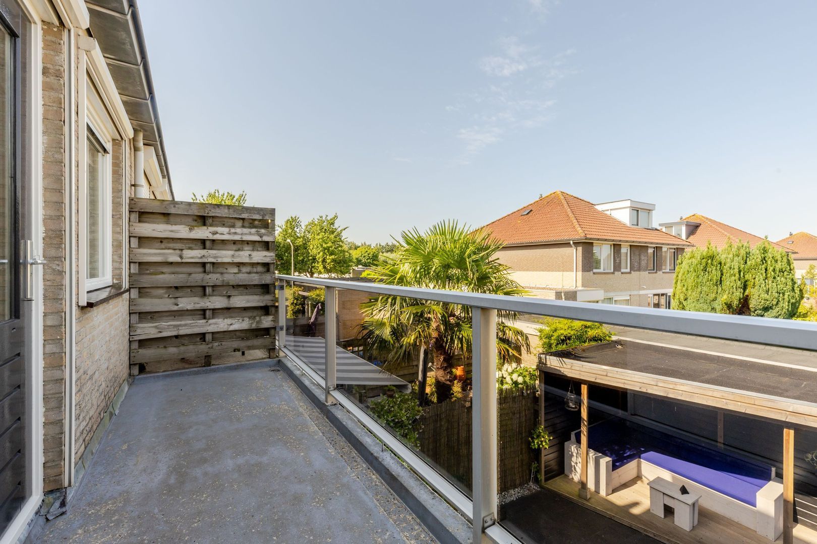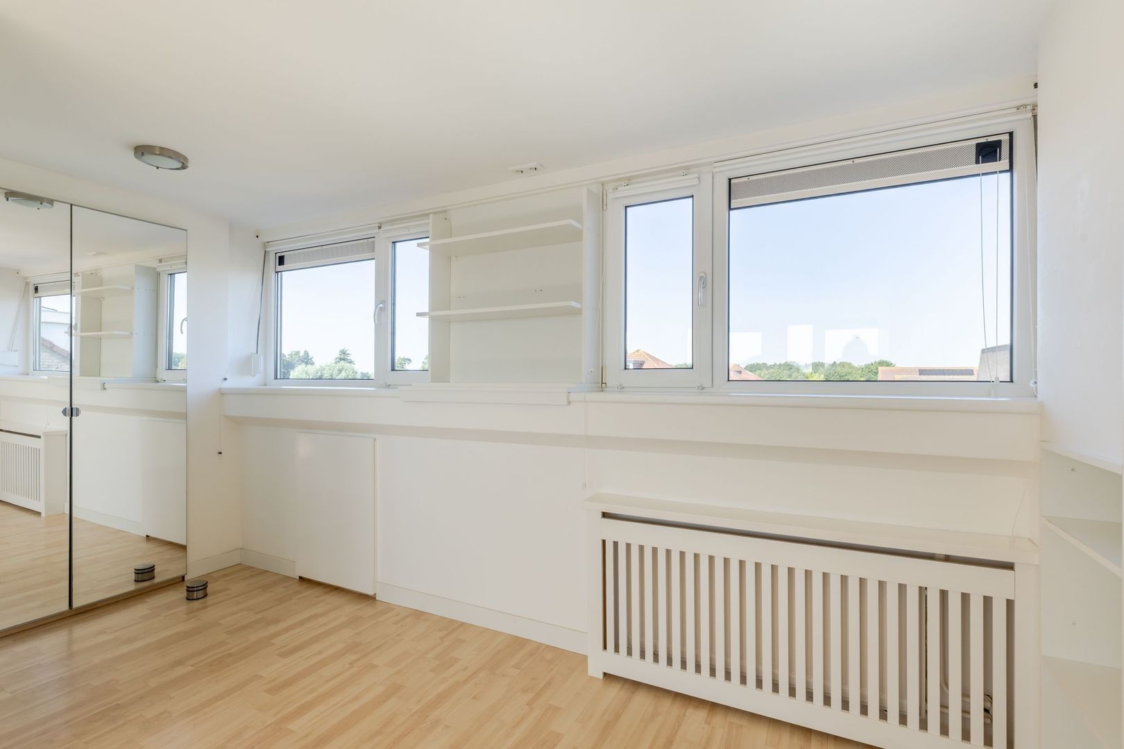 Op de eerste verdieping zijn de twee slaapkamers aan de achterkant samengevoegd tot één grote kamer. Deze is voorzien van twee kastenwanden en een vast bureau. Het balkon strekt zich uit over de gehele breedte van het huis.